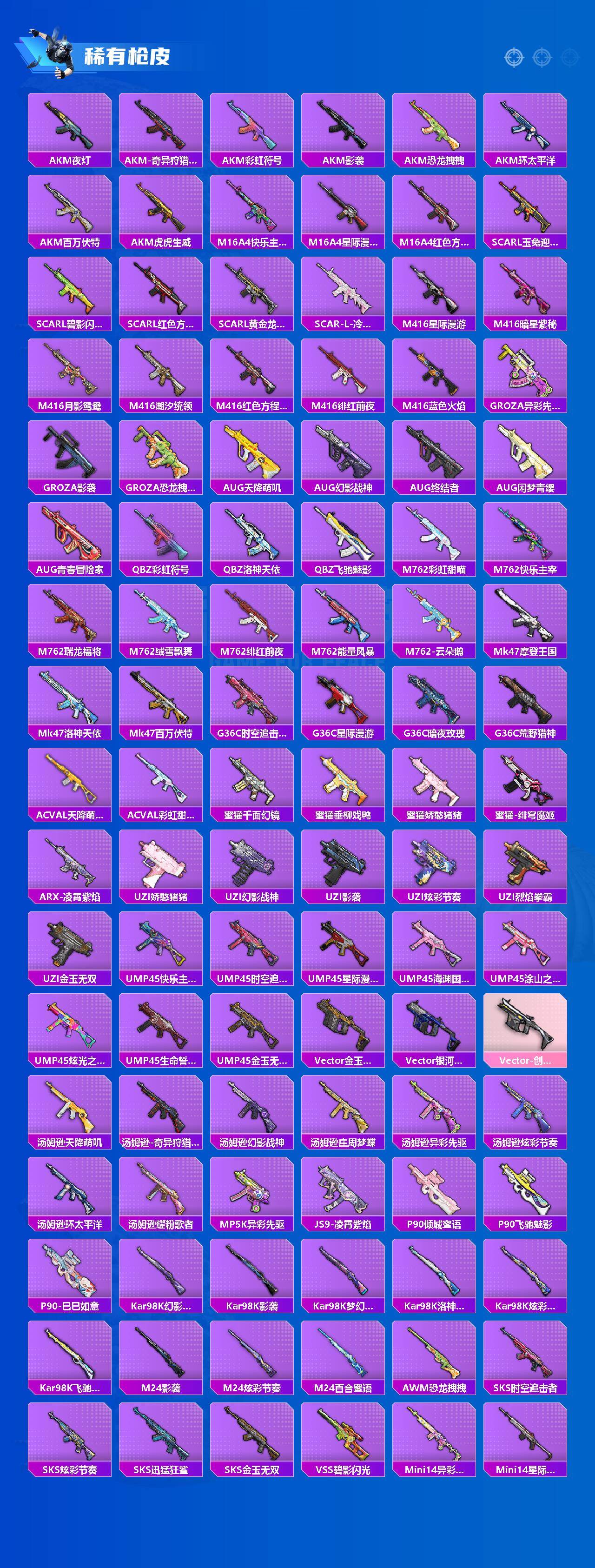 【稀有枪皮】:AKM-夜灯,AKM-奇异狩猎者,AKM-彩虹符号,AKM-影袭,AKM-恐龙拽拽,AKM-环太平洋,AKM-百万伏特,AKM-虎虎生威,M16A4-快乐主宰,M16A4-星际漫游,M16A4-红色方程式,SCAR-L-