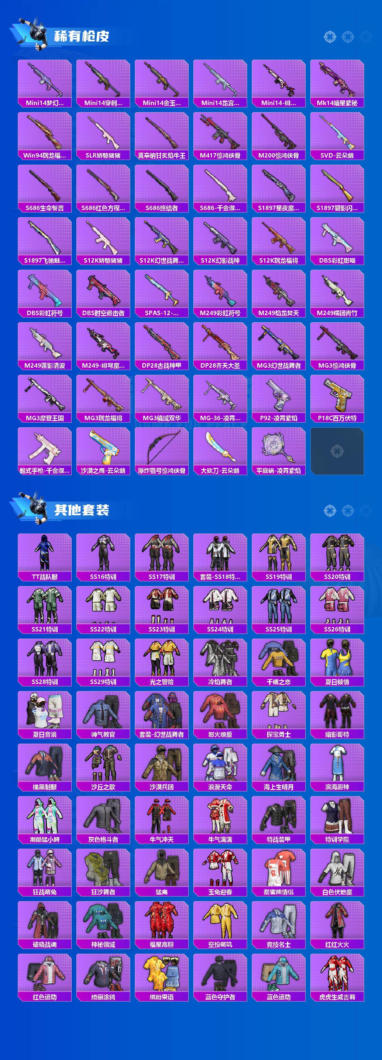 【热门品类】:粉装-梦幻火箭,套装-浪漫天命,套装-都市猎人,套装-深海小丑鱼,套装-小丑鱼,套装-胖达团团,套装-天网终结者,角色-忠义严颜,套装-龟仙人,套装-暗影哥特,套装-红红火火,M416-星际漫游,撬棍-龙胆亮银枪
