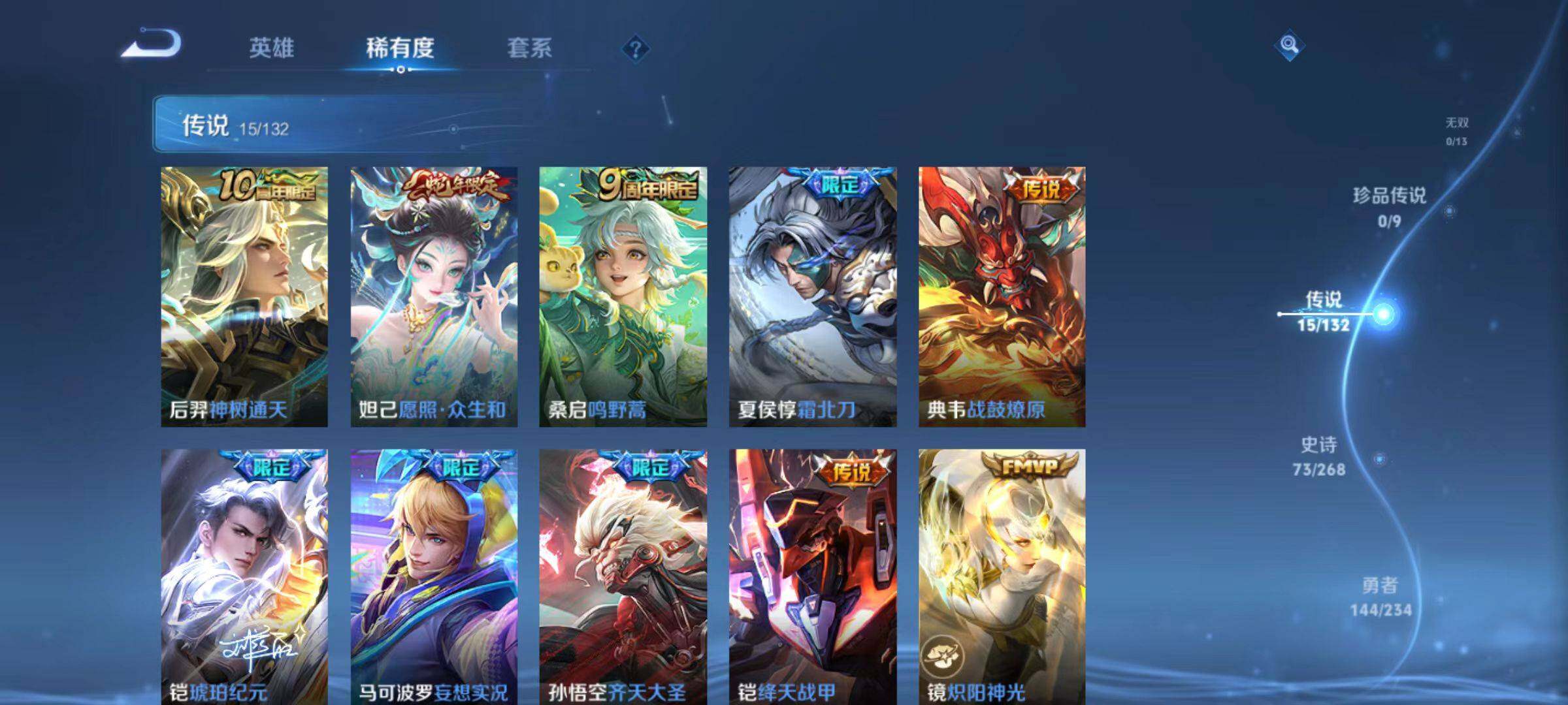 【传说皮肤】:后羿神树通天,妲己愿照众生和,桑启鸣野蒿,夏侯惇霜北刀,典韦战鼓燎原,铠琥珀纪元,马可波罗妄想实况,孙悟空齐天大圣,铠绛天战甲,镜炽阳神光,曜云鹰飞将,李信一念神魔,刘备时之恋人,貂蝉猫影幻舞,干将莫邪久胜战神