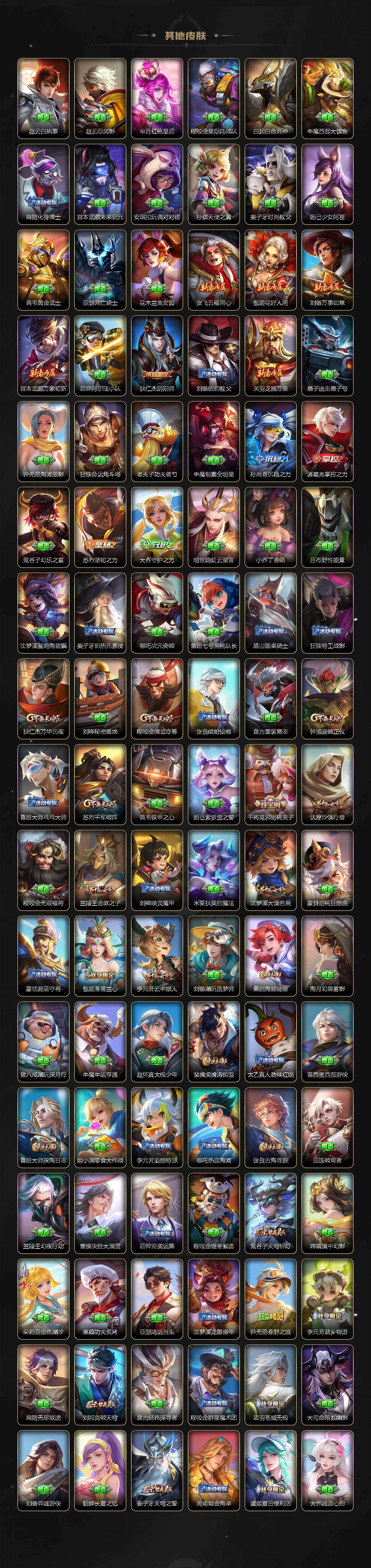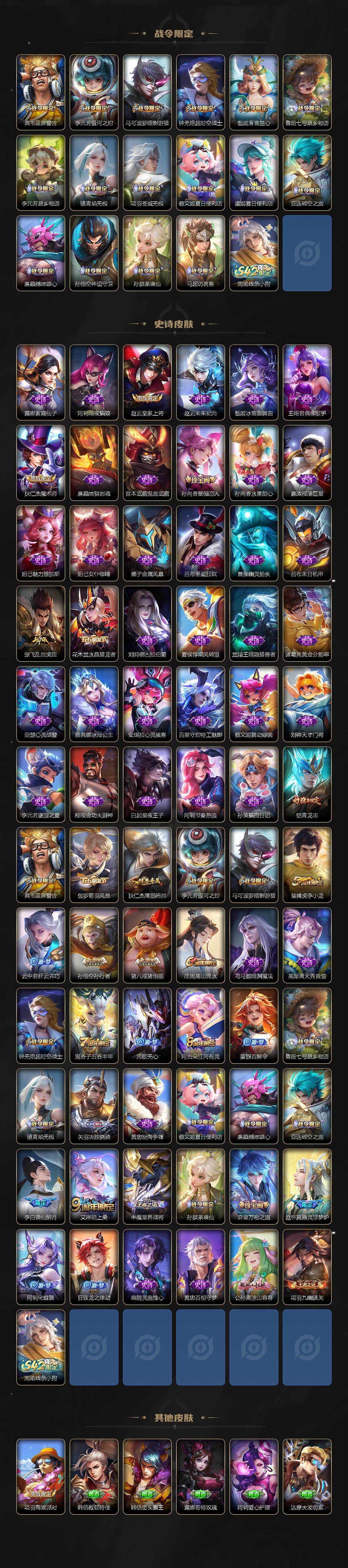 【赛季限定】:狄仁杰万华元夜,程咬金演武夺筹,钟馗驱傩正仪,苏烈千军破阵,达摩沙漠行僧,兰陵王金庭之子,沈梦溪大漠名商,李元芳云中旅人,桑启海盐诗旅,裴擒虎擒涛扼浪,鲁班大师探海日志,张良古海寻踪,鬼谷子天穹祈灯,刘邦剑破天穹,姜子牙天穹之誓,东皇太一噬灭天穹,太乙真人谧流熔炉,钟馗虚灵犬护,甄姬逆浪荇歌,亚瑟荣光之誓,牛魔星界战将,项羽九幽镇关
