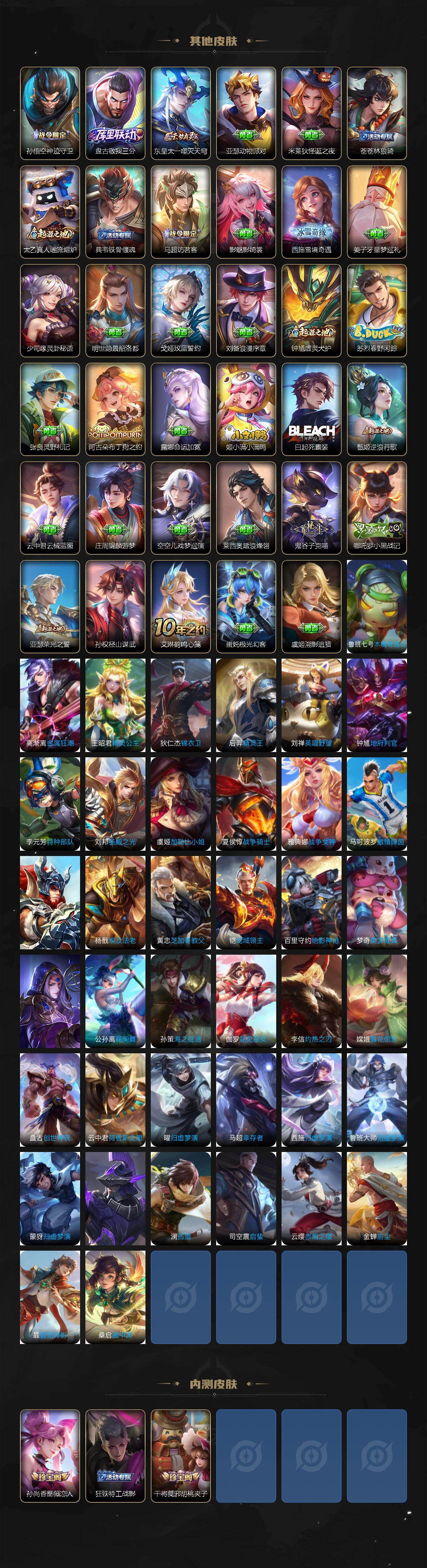 伽罗箭羽风息,李元芳逐浪之夏,孙策猫狗日记,阿轲节奏热浪,露娜紫霞仙子,诸葛亮黄金分割率,王昭君偶像歌手,阿轲暗夜猫娘,雅典娜冰冠公主,吕布末日机甲,嬴政摇滚巨星,刘禅天才门将,白起星夜王子,安琪拉心灵骇客,程咬金功夫厨神,刘邦德古拉伯爵,兰陵王暗隐猎兽者,曹操幽灵船长,宫本武藏鬼剑武藏,司马懿暗渊魔法,亚瑟心灵战警,蔡文姬舞动绿茵,廉颇地狱岩魂,夏侯惇乘风破浪,花木兰水晶猎龙者,墨子金属风暴,吕布圣诞狂欢,百里守约特工魅影,高渐离天秀·音浪,蒙犽百解令,关羽决胜骁骑,李白谪仙醉月,赵怀真器灵·浮梦炉
