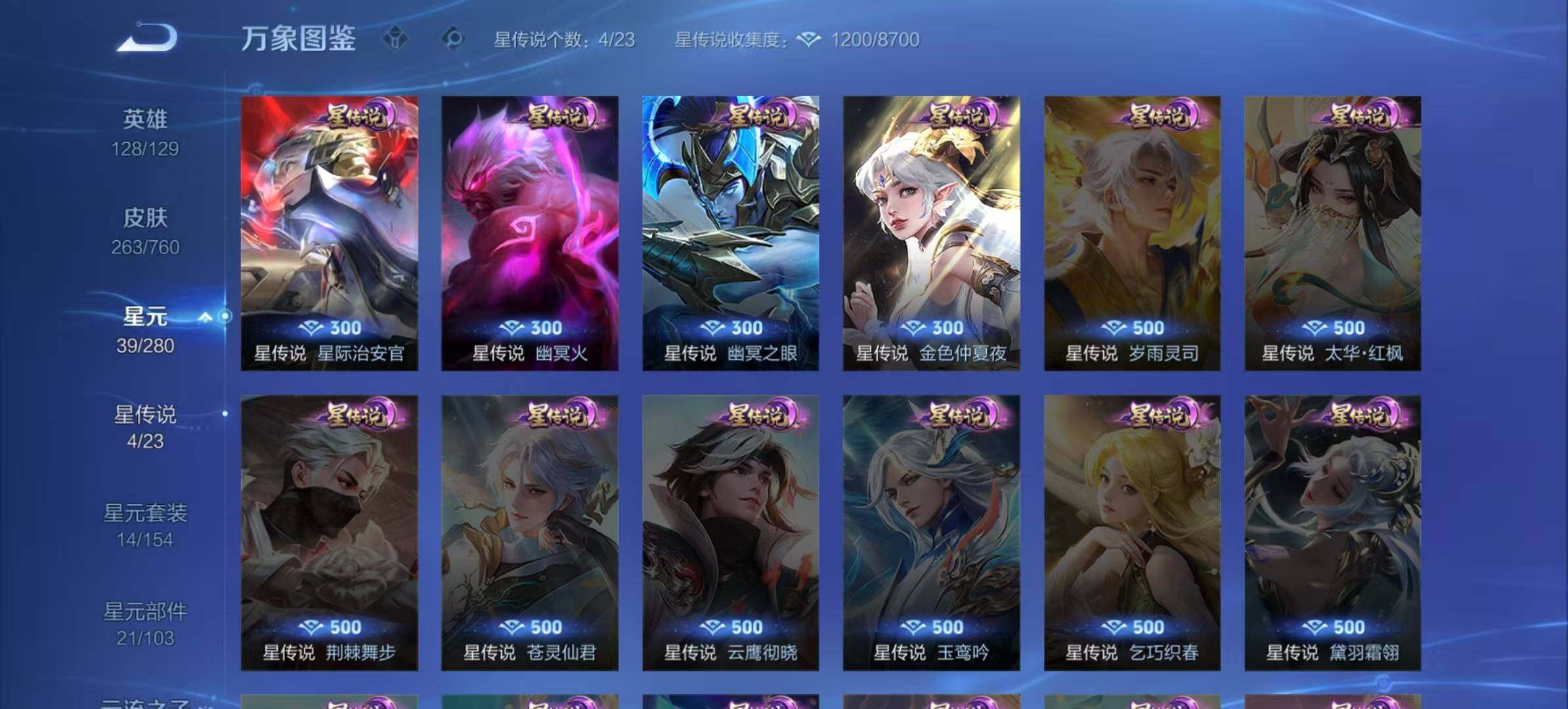 苏烈千军破阵,嬴政白昼王子,典韦蓝屏警告,钟馗神迹守卫,李元芳银河之约,马可波罗暗影游猎,元歌云间偶戏,达摩沙漠行僧,兰陵王金庭之子,沈梦溪大漠名商,李元芳云中旅人,桑启海盐诗旅,裴擒虎擒涛扼浪,鲁班大师探海日志,张良古海寻踪,项羽苍威无极,镜青焰无极