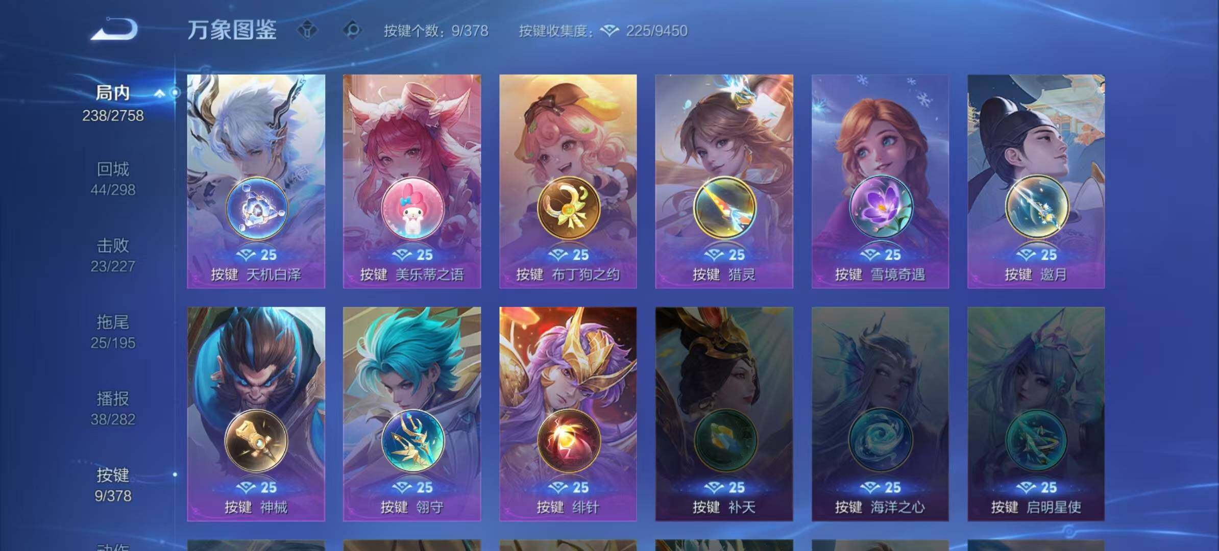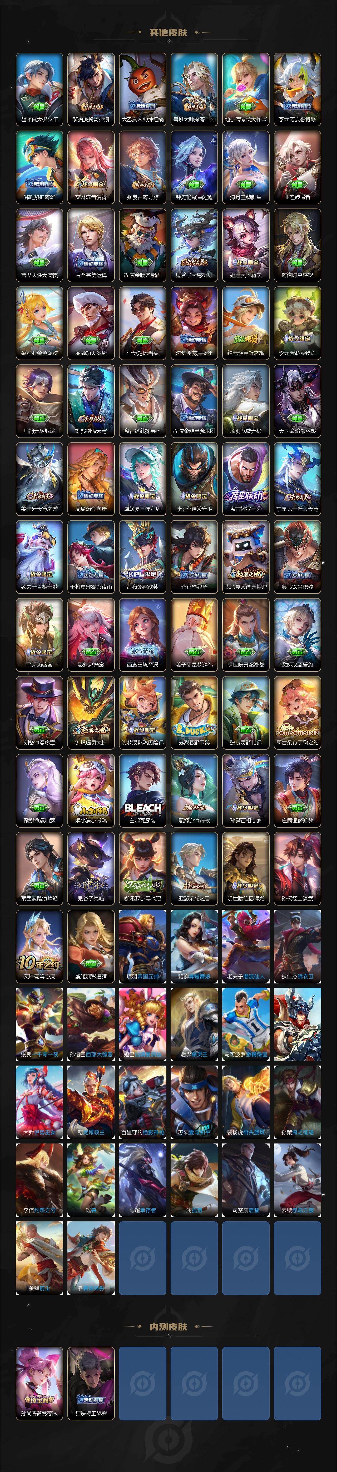 李元芳逐浪之夏,大乔猫狗日记,孙策猫狗日记,阿轲节奏热浪,露娜紫霞仙子,雅典娜冰冠公主,吕布末日机甲,橘右京修罗,嬴政摇滚巨星,刘禅绅士熊喵,刘禅天才门将,白起星夜王子,程咬金功夫厨神,刘邦德古拉伯爵,兰陵王暗隐猎兽者,曹操幽灵船长,宫本武藏鬼剑武藏,亚瑟心灵战警,钟馗乐园奇幻夜,杨戬天秀·启明,蔡文姬舞动绿茵,廉颇地狱岩魂,小乔缤纷独角兽,夏侯惇乘风破浪,花木兰水晶猎龙者,铠曙光守护者,墨子金属风暴,百里玄策原初追逐者,吕布圣诞狂欢,貂蝉圣诞恋歌,百里守约特工魅影,嫦娥拒霜思,李白千年之狐,刘禅电玩·爆裂旋风,蒙犽百解令,周瑜雪夜绮愿,高渐离燃音魔法,伽罗琥珀纪元,李白谪仙醉月,赵怀真器灵·浮梦炉