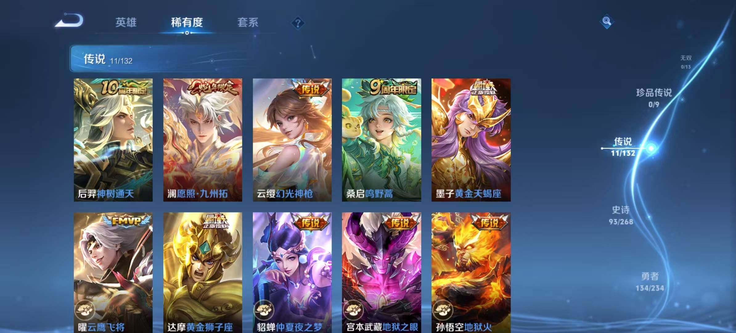 【传说皮肤】:后羿神树通天,澜愿照九州拓,云缨幻光神枪,桑启鸣野蒿,墨子黄金天蝎座,曜云鹰飞将,达摩黄金狮子座,貂蝉仲夏夜之梦,宫本武藏地狱之眼,孙悟空地狱火,狄仁杰超时空战士