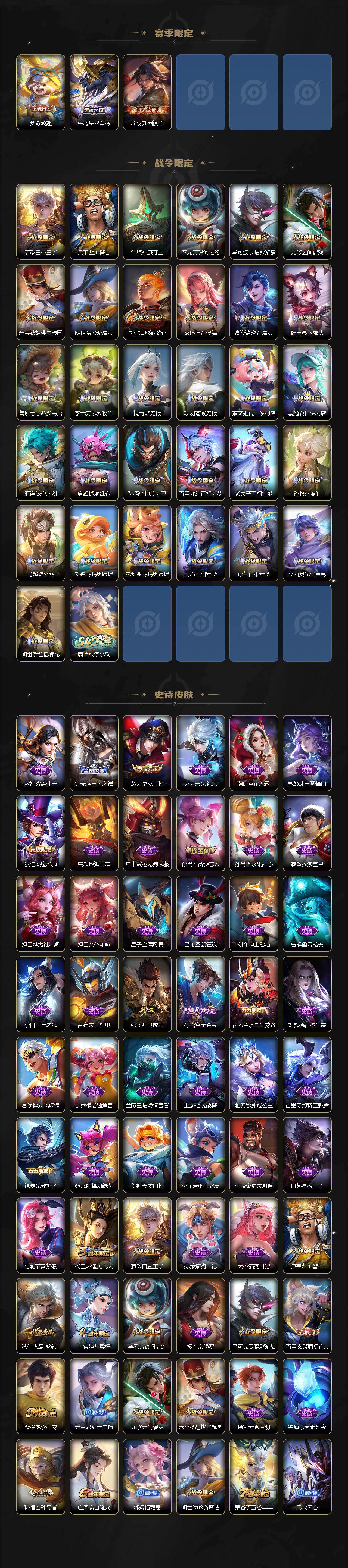 【战令限定】:嬴政白昼王子,典韦蓝屏警告,钟馗神迹守卫,李元芳银河之约,马可波罗暗影游猎,元歌云间偶戏,米莱狄胡桃异想国,明世隐吟游魔法,司空震地狱燃心,艾琳流音漫舞,高渐离燃音魔法,妲己灵卜魔法,鲁班七号蔬乡物语,李元芳蔬乡物语,镜青焰无极,项羽苍威无极,蔡文姬夏日便利店,虞姬夏日便利店,亚连破空之剑,廉颇撼地雄心,孙悟空神迹守卫,百里守约百相守梦,老夫子百相守梦,孙膑茶境仙,马超访茗客,刘禅鸭鸭历险记,沈梦溪鸭鸭历险记,周瑜百相守梦,孙策百相守梦,