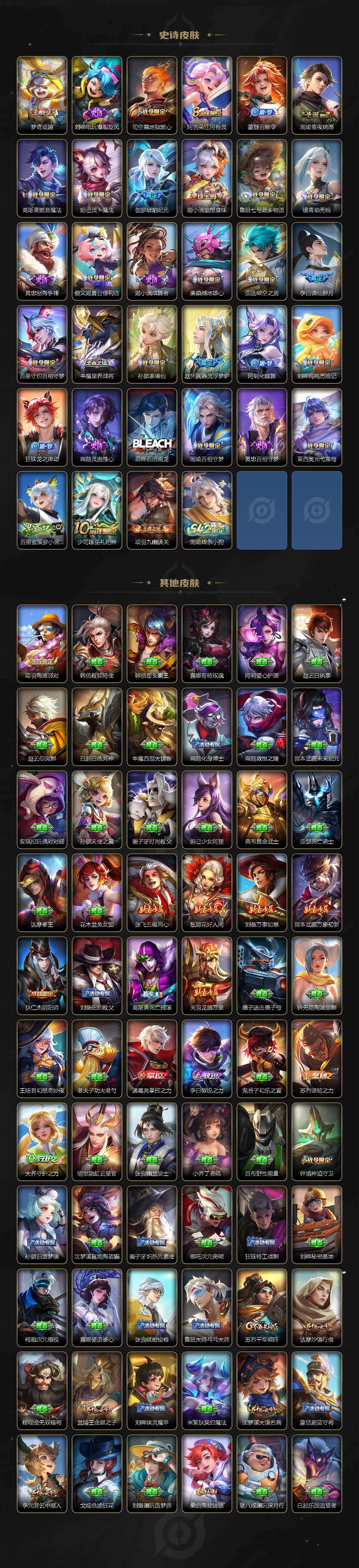 【限定皮肤】:蔡文姬夏日便利店,虞姬夏日便利店,姜子牙天穹之誓,李白谪仙醉月,狄仁杰阴阳师,赵云皇家上将,嬴政白昼王子,孙尚香蔷薇恋人,庄周高山流水,高渐离死亡摇滚,钟无艳王者之锤,元歌云间偶戏,元歌无心,典韦蓝屏警告,马可波罗暗影游猎,狄仁杰魔术师,达摩沙漠行僧,项羽海滩派对,兰陵王金庭之子,孙悟空至尊宝,孙悟空孙行者,李元芳银河之约,李元芳云中旅人,钟馗神迹守卫,杨玉环遇见飞天,鬼谷子五谷丰年,苏烈千军破阵,百里玄策原初追逐者,梦奇顽趣,沈梦溪大漠名商,明世隐吟游魔法,裴擒虎李小龙,裴擒虎擒涛扼浪,米莱狄胡桃异想国,云中君纤云弄巧,上官婉儿梁祝,嫦娥拒霜思,鲁班大师探海日志,桑启海盐诗旅,艾琳流音漫舞,司空震地狱燃心,阿古朵江河有灵,张良古海寻踪,蒙犽百解令,高渐离燃音魔法,妲己灵卜魔法,鬼谷子天穹祈灯,伽罗琥珀纪元,姬小满妄想食味,沈梦溪龙舞盛年,鲁班七号蔬乡物语,李元芳蔬乡物语,刘邦剑破天穹,程咬金群星魔术团,镜青焰无极,项羽苍威无极,周瑜熔金海岸