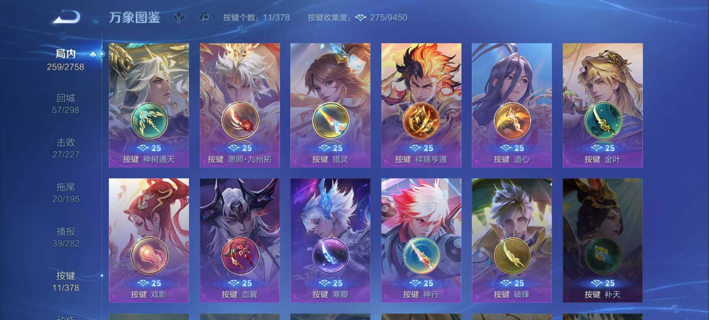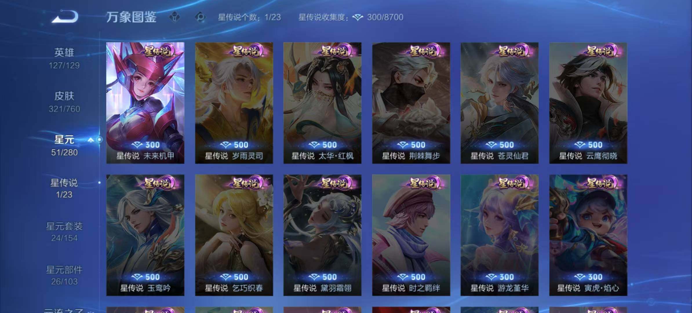 孙膑妖精王,虞姬凯尔特女王,白起狰,太乙真人饕餮,曹操烛龙,典韦穷奇,狂铁御狮,米莱狄御霄,牛魔御旌,盾山御銮,夏侯惇朔风刀,明世隐疑决卦,老夫子醍醐杖,鬼谷子原初探秘者,狄仁杰万华元夜,程咬金演武夺筹,钟馗驱傩正仪,苏烈千军破阵,吕布猎兽之王,嬴政白昼王子,沈梦溪星空之诺,李元芳银河之约,马可波罗暗影游猎,元歌云间偶戏,弈星混沌棋,达摩沙漠行僧,沈梦溪大漠名商,李元芳云中旅人,桑启海盐诗旅,裴擒虎擒涛扼浪,鲁班大师探海日志,张良古海寻踪,项羽苍威无极,镜青焰无极