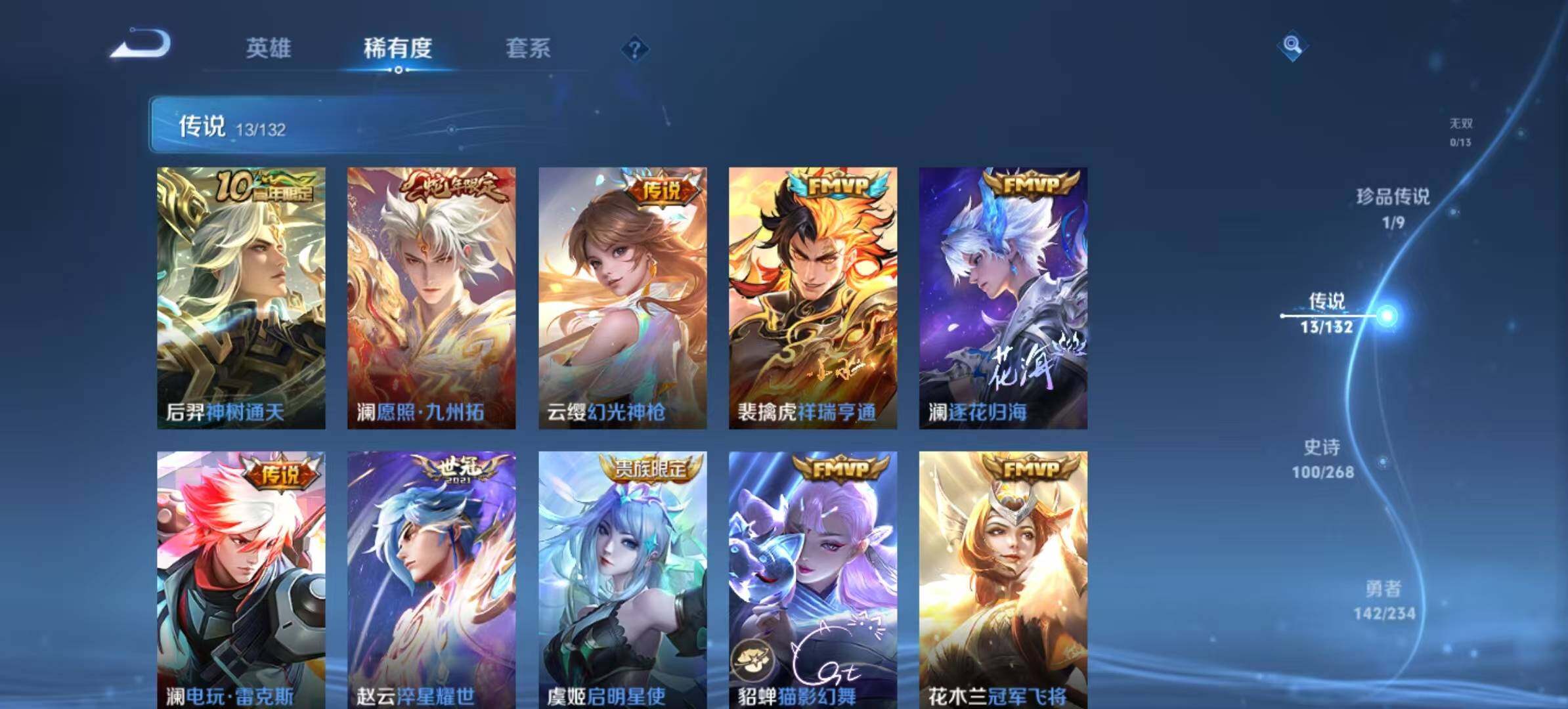 【传说皮肤】:后羿神树通天,澜愿照九州拓,云缨幻光神枪,裴擒虎祥瑞亨通,澜逐花归海,澜电玩雷克斯,赵云淬星耀世,虞姬启明星使,貂蝉猫影幻舞,花木兰冠军飞将,貂蝉仲夏夜之梦,孙尚香末日机甲,狄仁杰超时空战士