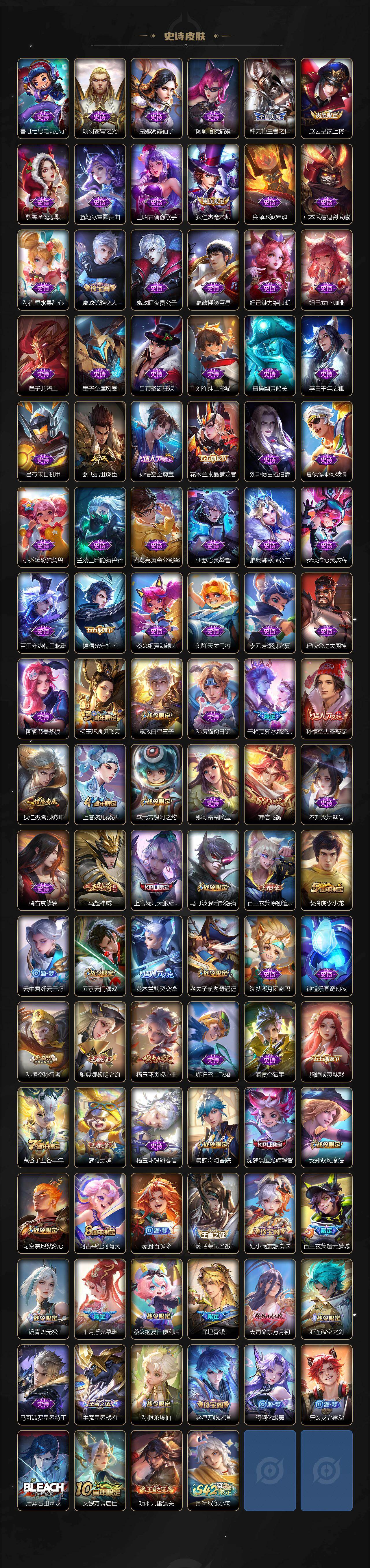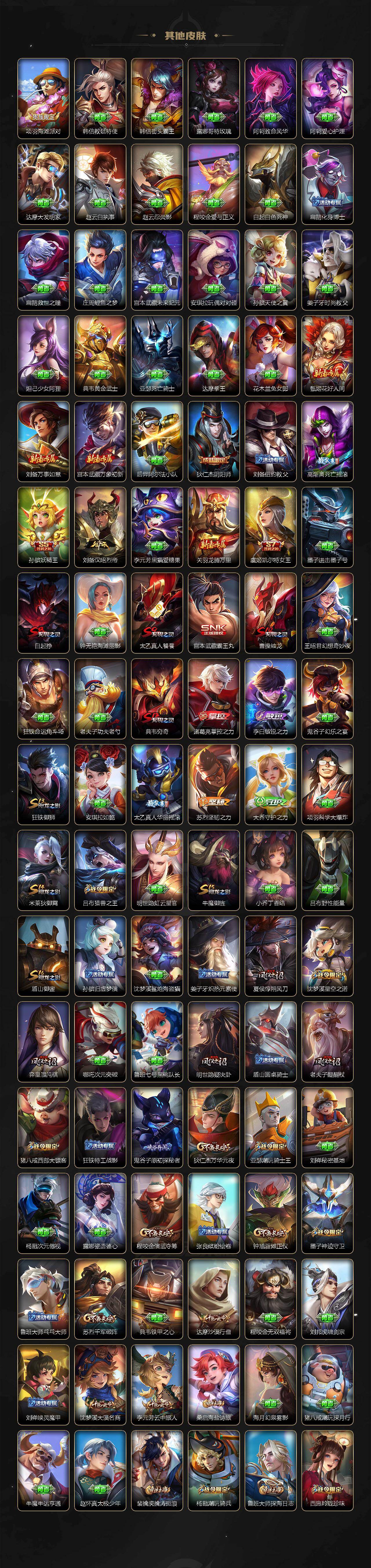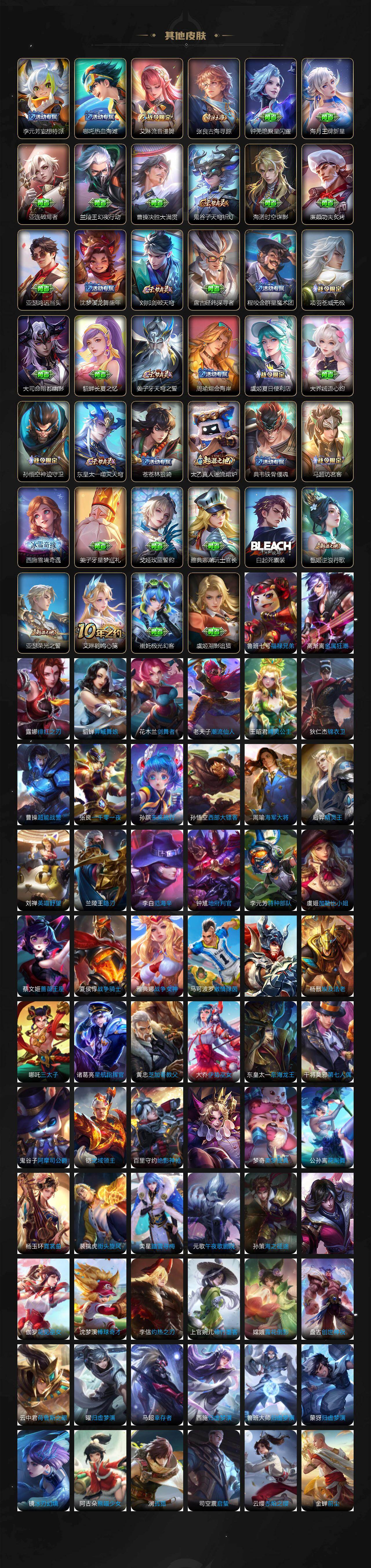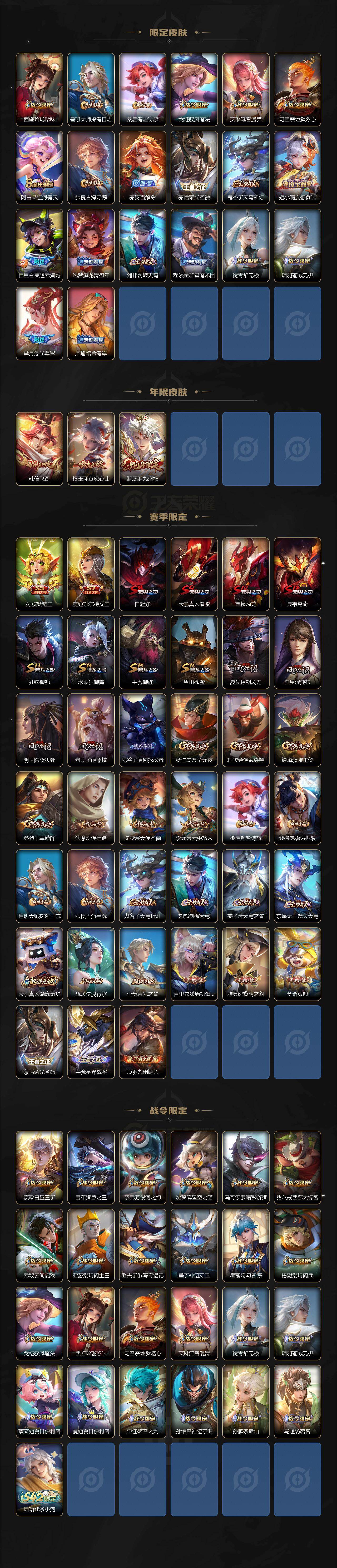 【限定皮肤】:白起狰,暃埋骨钱,蔡文姬夏日便利店,大乔绒语心约,虞姬夏日便利店,姜子牙天穹之誓,狄仁杰阴阳师,虞姬凯尔特女王,赵云皇家上将,墨子神迹守卫,嬴政优雅恋人,嬴政白昼王子,高渐离死亡摇滚,钟无艳王者之锤,孙膑妖精王,扁鹊奇幻香踪,吕布猎兽之王,元歌云间偶戏,夏侯惇朔风刀,曹操烛龙,典韦穷奇,马可波罗暗影游猎,狄仁杰魔术师,狄仁杰万华元夜,达摩沙漠行僧,项羽海滩派对,老夫子醍醐杖,老夫子航海奇遇记,程咬金演武夺筹,韩信飞衡,花木兰默契交锋,亚瑟潮玩骑士王,孙悟空至尊宝,孙悟空大圣娶亲,孙悟空孙行者,牛魔御旌,李元芳银河之约,李元芳云中旅人,虞姬启明星使,钟馗驱傩正仪,杨玉环遇见飞天,杨玉环寅虎心曲,杨戬潮玩骑兵,干将莫邪冰霜恋舞曲,雅典娜黎明之约,太乙真人饕餮,太乙真人华丽摇滚,鬼谷子原初探秘者,鬼谷子五谷丰年,苏烈千军破阵,百里玄策原初追逐者,弈星混沌棋,梦奇顽趣,沈梦溪星空之诺,沈梦溪大漠名商,沈梦溪匿光破解者,明世隐疑决卦,裴擒虎李小龙,裴擒虎擒涛扼浪,狂铁御狮,米莱狄御霄,云中君纤云弄巧,盾山御銮,猪八戒西部大镖客,上官婉儿梁祝,上官婉儿天狼绘梦者,西施玲珑珍味,鲁班大师探海日志,桑启海盐诗旅,戈娅驭风魔法,艾琳流音漫舞,司空震地狱燃心,阿古朵江河有灵,张良古海寻踪,蒙犽百解令,蒙恬荣光圣徽,鬼谷子天穹祈灯,姬小满妄想食味,百里玄策超元猎域,沈梦溪龙舞盛年,刘邦剑破天穹,程咬金群星魔术团,镜青焰无极,项羽苍威无极,芈月浮光幕影,周瑜熔金海岸