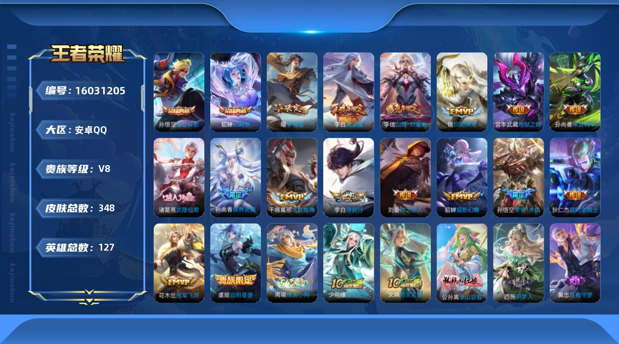 [16031205]金标镜-安卓Q-V8-127英雄-348皮肤-2典藏皮肤-16传说-100史诗