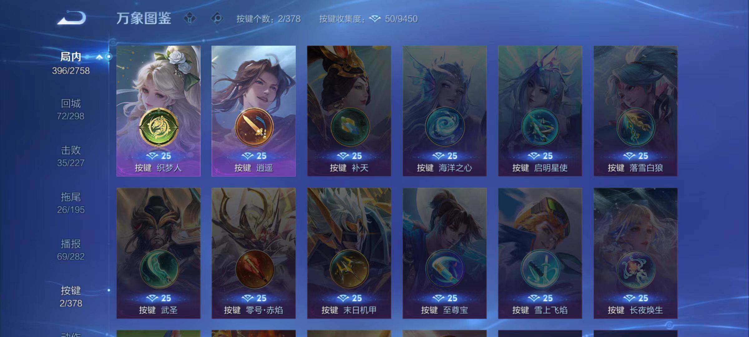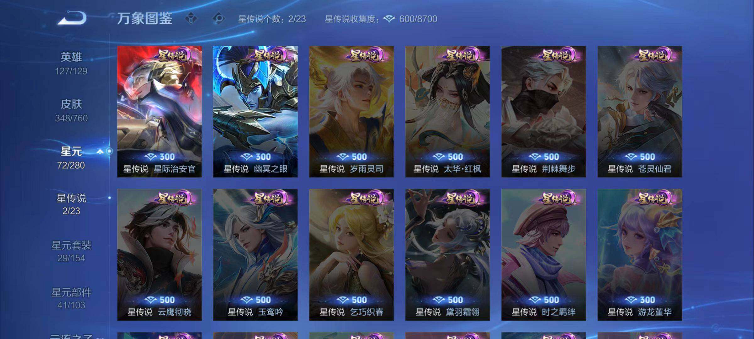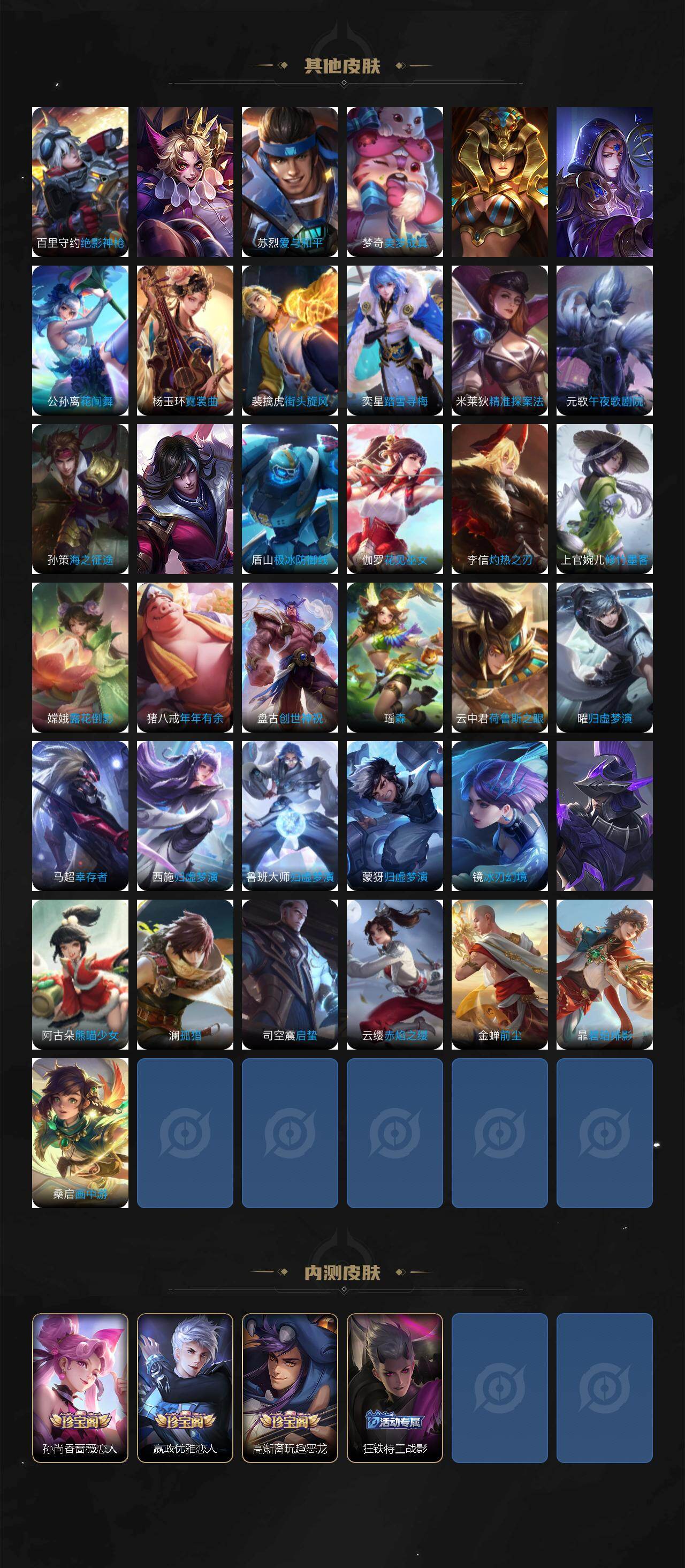 庄周蜃楼王,孙膑妖精王,扁鹊炼金王,虞姬凯尔特女王,白起狰,太乙真人饕餮,曹操烛龙,芈月重明,典韦穷奇,狂铁御狮,米莱狄御霄,牛魔御旌,盾山御銮,夏侯惇朔风刀,明世隐疑决卦,老夫子醍醐杖,鬼谷子原初探秘者,狄仁杰万华元夜,程咬金演武夺筹,钟馗驱傩正仪,苏烈千军破阵,吕布猎兽之王,嬴政白昼王子,女娲朔望之晖,典韦蓝屏警告,钟馗神迹守卫,鲁班七号狮舞东方,沈梦溪星空之诺,李元芳银河之约,刘邦夺宝奇兵,马可波罗暗影游猎,蒙犽狂想玩偶喵,元歌云间偶戏,弈星混沌棋,达摩沙漠行僧,兰陵王金庭之子,沈梦溪大漠名商,李元芳云中旅人,桑启海盐诗旅,裴擒虎擒涛扼浪,鲁班大师探海日志,张良古海寻踪