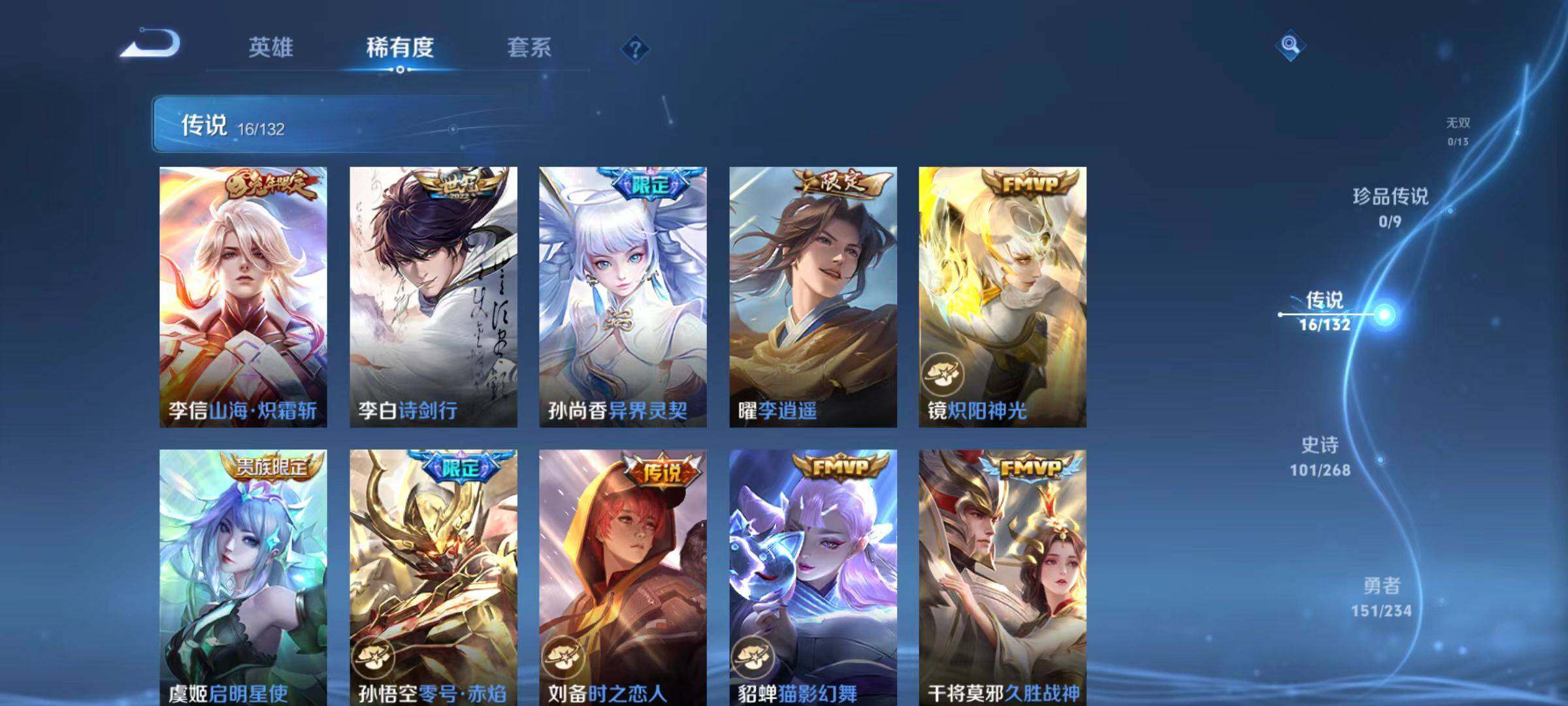 【传说皮肤】:李信山海炽霜斩,李白诗剑行,孙尚香异界灵契,曜李逍遥 ,镜炽阳神光,虞姬启明星使,孙悟空零号赤焰,刘备时之恋人,貂蝉猫影幻舞,干将莫邪久胜战神,花木兰冠军飞将,诸葛亮武陵仙君,李白凤求凰,孙尚香末日机甲,宫本武藏地狱之眼,狄仁杰超时空战士