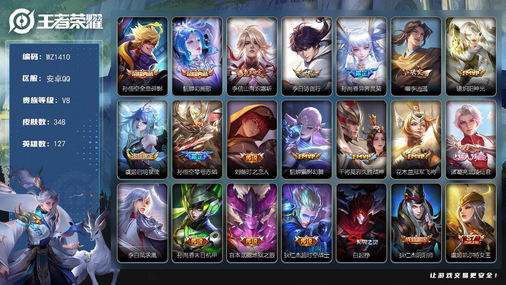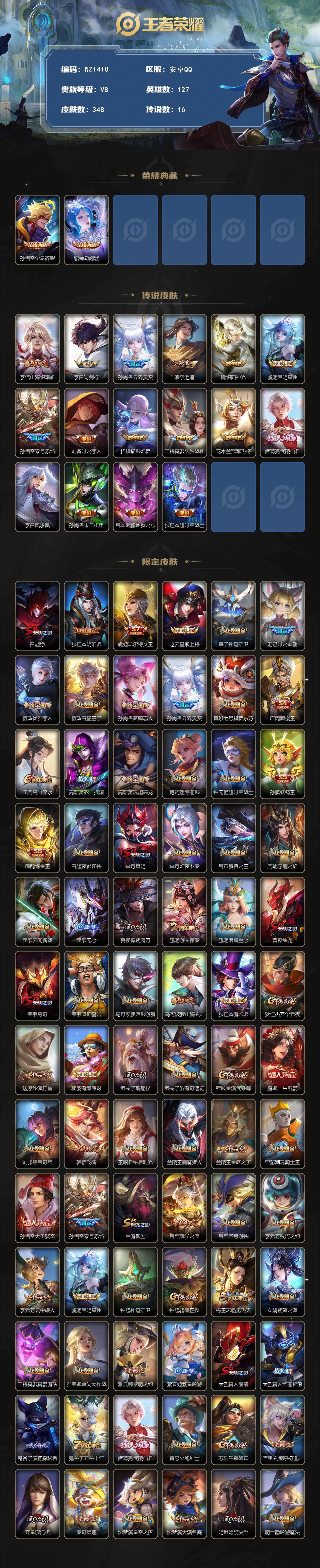- [12075575]V8 1典藏 2无双 1珍品传说 22传说 125英雄 239皮肤 可修改实名 优质装备:九霄神辉(木兰典藏),器灵·螭龙剑,天机白泽,怪盗基德,黄金狮子座,云鹰飞将(小将军),久胜战神,一念神魔,末日机甲-孙尚香(绿蚂蚱),零号·赤焰,地狱之眼,乞巧织情,无双飞将,山海·炽霜斩(李信年限),燃星之曲,妄想奇谈,遇见神鼓,涂山容容 传说皮:乘龙·铭钟鼎(赵云年限),落雪白狼,死亡执政官,九山相柳 珍宝阁皮:胡桃夹子 限定皮:愿照·山河定(司空震年限),逐霄战戟,鸣野蒿,至尊宝,傲雪梅枪,怒海麟威,降魔,梁祝,岱宗(典韦年限),永曜之星,神器·万象笔 史诗皮:鸭鸭历险记-刘禅,化蝶舞,星界战将,谪仙醉月,龙之律动,雪豹·霜爪,藏狐·褐绒,石田雨龙,百相守梦-周瑜,茶境仙,怒海争锋,破空之剑,琥珀纪元伽罗,蔬乡物语(鲁班七号),百相守梦-百里守约,星界特工,百相守梦-黄忠,织梦人,守夜人,白龙吟,黄金分割率,特工魅影,千年之狐,永昼,江河有灵,真我赫兹(百里守约),魅语,百解令(蒙犽),高渐离燃音魔法,蒙恬荣光圣徽,偶像歌手,电玩·爆裂旋风,百相守梦(关羽),末日机甲-吕布,猫狗日记-孙策,乱世虎臣,节奏热浪,修罗,女仆咖啡,摇滚巨星,水果甜心,天才门将,功夫厨神,暗隐猎兽者,幽灵船长,鬼剑武藏,暗渊魔法,心灵战警,天秀·启明,地狱岩魂,纤云弄巧,拒霜思,缤纷独角兽,逐浪之夏,月团寄思,水晶猎龙者,曙光守护者,唤灵魅影,金属风暴,圣诞狂欢,圣诞恋歌,鹰眼统帅,暗夜贵公子,魅力维加斯,黎明之约,雪上飞焰,未来纪元-赵云