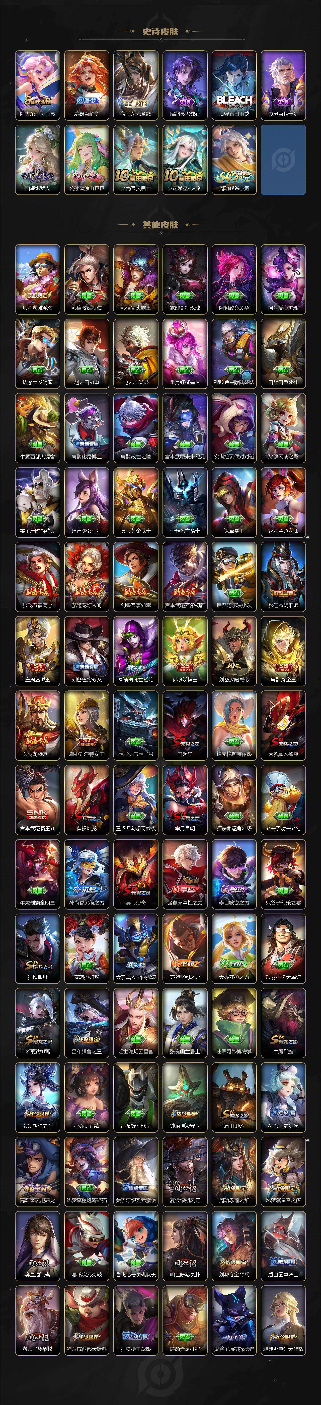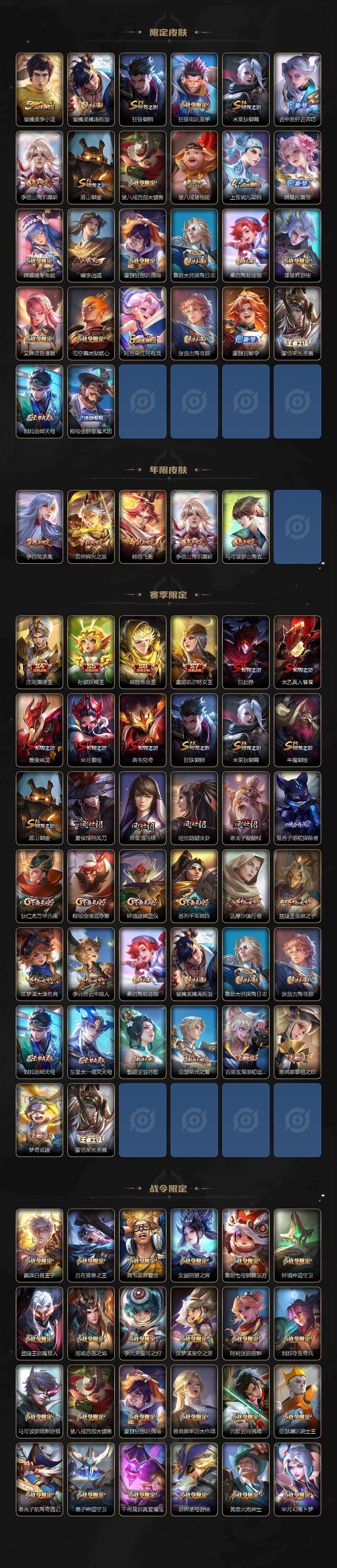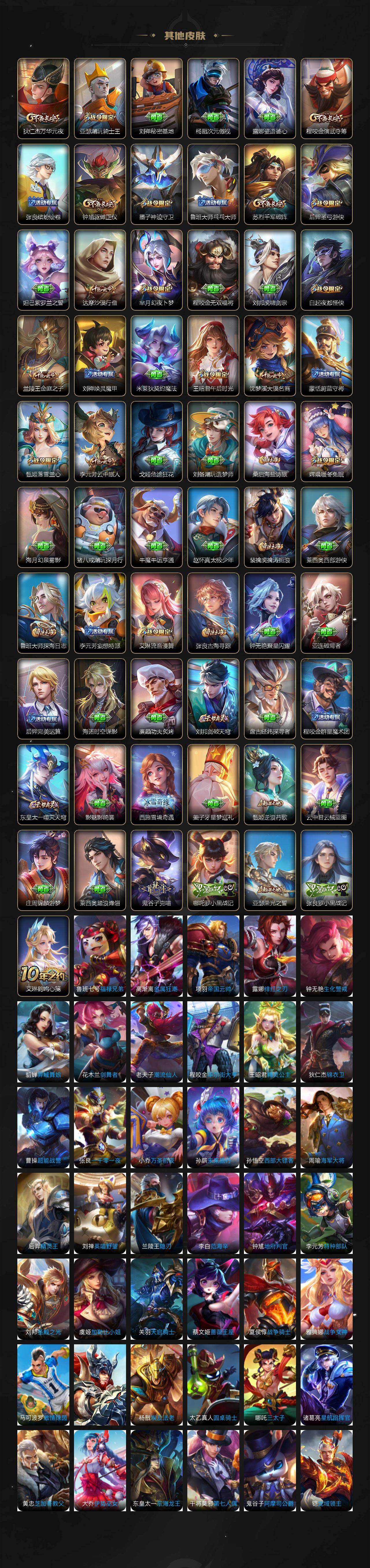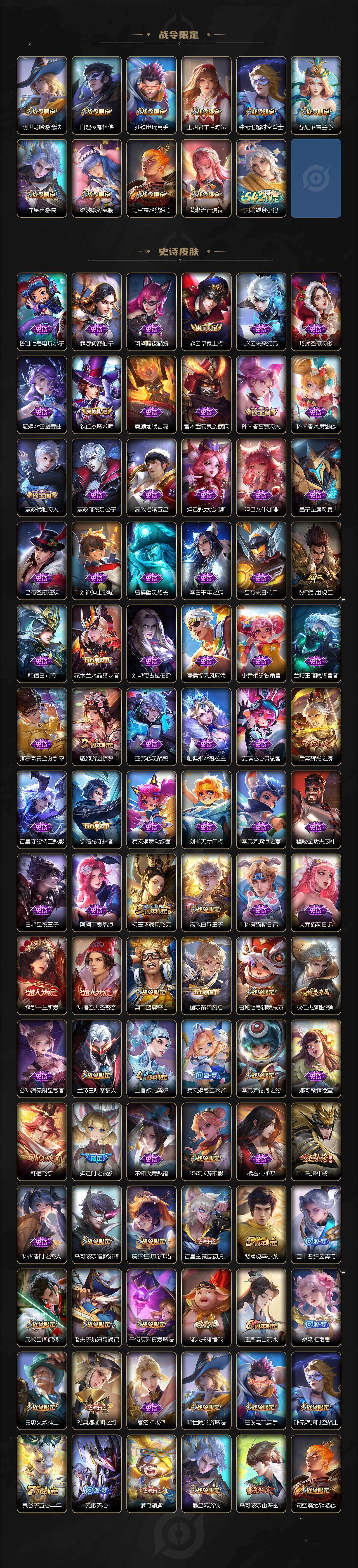 【限定皮肤】:白起狰,狄仁杰阴阳师,虞姬凯尔特女王,赵云皇家上将,墨子神迹守卫,妲己时之彼端,嬴政优雅恋人,嬴政白昼王子,孙尚香蔷薇恋人,孙尚香异界灵契,鲁班七号狮舞东方,庄周蜃楼王,庄周高山流水,高渐离死亡摇滚,高渐离玩趣恶龙,阿轲迷踪丽影,钟无艳超时空战士,孙膑妖精王,扁鹊炼金王,白起夜都怪侠,芈月重明,芈月幻夜卜梦,吕布猎兽之王,周瑜赤莲之焰,元歌云间偶戏,元歌无心,夏侯惇朔风刀,甄姬游园惊梦,甄姬落雪兰心,曹操烛龙,典韦穷奇,典韦蓝屏警告,马可波罗暗影游猎,马可波罗山海玄木吟,狄仁杰魔术师,狄仁杰万华元夜,达摩沙漠行僧,项羽海滩派对,老夫子醍醐杖,老夫子航海奇遇记,程咬金演武夺筹,露娜一生所爱,刘邦夺宝奇兵,韩信飞衡,王昭君午后时光,兰陵王驯魔猎人,兰陵王金庭之子,亚瑟潮玩骑士王,孙悟空大圣娶亲,孙悟空零号赤焰,牛魔御旌,后羿辉光之辰,后羿圣弓游侠,李元芳银河之约,李元芳云中旅人,虞姬启明星使,钟馗神迹守卫,钟馗驱傩正仪,杨玉环遇见飞天,女娲朔望之晖,干将莫邪真爱魔法,雅典娜单词大作战,雅典娜黎明之约,蔡文姬繁星吟游,太乙真人饕餮,太乙真人华丽摇滚,鬼谷子原初探秘者,鬼谷子五谷丰年,诸葛亮武陵仙君,黄忠火炮绅士,苏烈千军破阵,百里玄策原初追逐者,弈星混沌棋,梦奇顽趣,沈梦溪星空之诺,沈梦溪大漠名商,明世隐疑决卦,明世隐吟游魔法,裴擒虎李小龙,裴擒虎擒涛扼浪,狂铁御狮,狂铁电玩高手,米莱狄御霄,云中君纤云弄巧,李信山海炽霜斩,盾山御銮,猪八戒西部大镖客,猪八戒猪悟能,上官婉儿梁祝,嫦娥拒霜思,嫦娥暖冬兔眠,曜李逍遥 ,蒙犽狂想玩偶喵,鲁班大师探海日志,桑启海盐诗旅,暃星界游侠,艾琳流音漫舞,司空震地狱燃心,阿古朵江河有灵,张良古海寻踪,蒙犽百解令,蒙恬荣光圣徽,刘邦剑破天穹,程咬金群星魔术团
