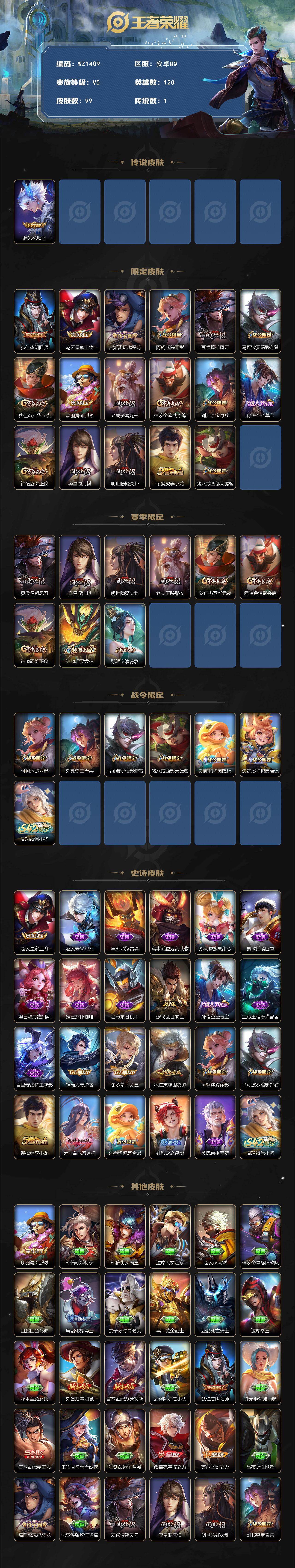 - [11933891]V10 2典藏 2无双 59传说 126英雄 440皮肤 典藏英雄武则天 可修改实名 优质装备:天鹅之梦(小乔典藏),杀手不太冷,韩信群星魔术团(韩信无双),天机白泽,黄金狮子座,黄金射手座,冠军飞将,云鹰飞将(小将军),黄金白羊座,猫影幻舞,久胜战神,炽阳神光,一念神魔,云霓雀翎,末日机甲-孙尚香(绿蚂蚱),地狱火,仲夏夜之梦(大飞蛾),地狱之眼,飞鸢探春,音你心动-周瑜,胖达荣荣,李逍遥,乞巧织情,时之恋人-刘备(电焊工),游龙清影(小青龙),超时空战士-狄仁杰,末日机甲-孙策,花朝如约(花篮子),无双飞将,神器·狴犴令,灼幽烈阳,惊梅引,小动物乐团,霜月吟,澜逐花归海,艾琳觅芳踪,金乌负日,黄金天蝎座,牧神诗旅 传说皮:乘龙·问璇玑(孙尚香年限),乘龙·铭钟鼎(赵云年限),乘龙·淬吴钩(孙策年限),貂蝉曦玄引,吕布曦玄引,典韦战鼓燎原,落雪白狼,九山相柳,云诺千山,祥瑞亨通,幻光神枪 珍宝阁皮:妄想食味,女武神,玩趣恶龙 限定皮:愿照·千秋盛(女娲年限),鸣野蒿,至尊宝,白虎志(电光耗子),凤求凰(白切鸡),凤凰于飞,太华(伽罗年限),武陵仙君(小桃花),傲雪梅枪,时之彼端,白鹤梁神女,神威(电光马子),飞衡(韩信年限),玄嵩(庄周年限),山海·碧波行(瑶年限),遇见飞天,高山流水,诗剑行,怒海麟威,五谷丰年,幽恒(沐浴露),梁祝,御风骁将(吕布年限),岱宗(典韦年限),天狼征服者,天狼绘梦者,李小龙,逐梦之影,朱雀志(守约年限),永曜之星,辉光之辰,如梦令-嫦娥,如梦令-后羿,圣诞老人,一生所爱,大圣娶亲,天魔缭乱,冰霜恋舞曲,乒乒小将,蜜橘之夏,时之祈愿-瑶(瑶传限),枫霜尽,山海·玄木吟(马可年限) 史诗皮:赞萌露比,苍鳞隐世,灵蛊蚀心,星界战将,龙之律动,石田雨龙,百相守梦-周瑜,幻珠鲛人,奇遇星旅,蔬乡物语(鲁班七号),乘龙·聚宝船(安琪拉年限),乘龙·忆丹青(大乔年限),百相守梦-黄忠,遇见神鹿,紫霞仙子,苍穹之光,电玩小子(小书包),白龙吟,黄金分割率,特工魅影,千年之狐,永昼,魅语,高渐离燃音魔法,蒙恬荣光圣徽,无限星赏官,冰冠公主,青蛇,偶像歌手,白蛇,晚萤,龙骑士(小龙虾),末日机甲-吕布,猫狗日记-孙策,猫狗日记-大乔,时之恋人-孙尚香,乱世虎臣,节奏热浪,修罗,女仆咖啡,摇滚巨星,水果甜心,绅士熊喵,天才门将,星夜王子,心灵骇客,功