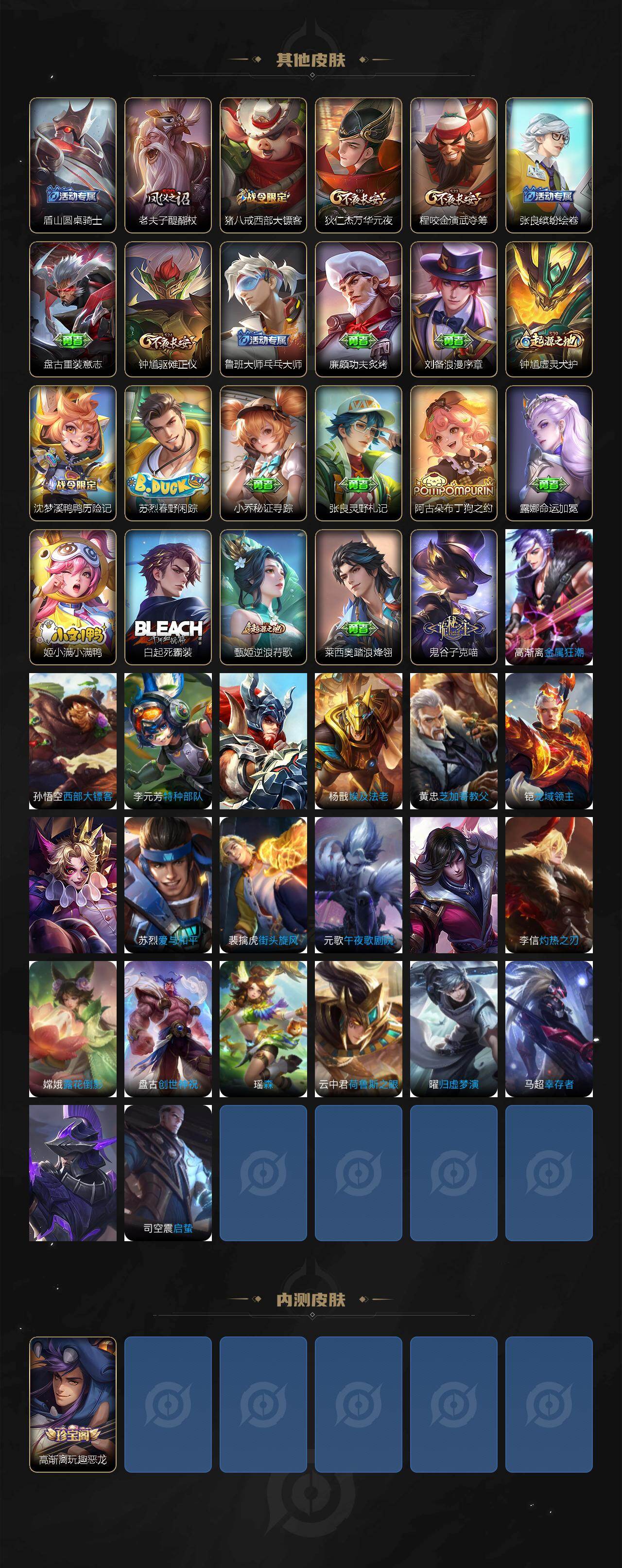 【其他皮肤】:项羽海滩派对,韩信教廷特使,韩信街头霸王,达摩大发明家,赵云忍炎影,程咬金星际陆战队,白起白色死神,扁鹊化身博士,姜子牙时尚教父,典韦黄金武士,亚瑟死亡骑士,达摩拳王,花木兰兔女郎,刘备万事如意,宫本武藏万象初新,后羿阿尔法小队,狄仁杰阴阳师,钟无艳海滩丽影,宫本武藏霸王丸,王昭君幻想奇妙夜,狂铁命运角斗场,诸葛亮掌控之力,苏烈坚韧之力,吕布野性能量,高渐离玩趣恶龙,沈梦溪鲨炮海盗猫,夏侯惇朔风刀,弈星混沌棋,明世隐疑决卦,刘邦夺宝奇兵,盾山圆桌骑士,老夫子醍醐杖,猪八戒西部大镖客,狄仁杰万华元夜,程咬金演武夺筹,张良缤纷绘卷,盘古重装意志,钟馗驱傩正仪,鲁班大师乓乓大师,廉颇功夫炙烤,刘备浪漫序章,钟馗虚灵犬护,沈梦溪鸭鸭历险记,苏烈春野闲踪,小乔秘证寻踪,张良灵野札记,阿古朵布丁狗之约,露娜命运加冕,姬小满小满鸭,白起死霸装,甄姬逆浪荇歌,莱西奥踏浪烽翎,鬼谷子克喵,高渐离金属狂潮,孙悟空西部大镖客,李元芳特种部队,苍维京掠夺者,杨戬埃及法老,黄忠芝加哥教父,铠龙域领主,百里玄策威尼斯狂欢,苏烈爱与和平,裴擒虎街头旋风,元歌午夜歌剧院,司马懿魇语军师,李信灼热之刃,嫦娥露花倒影
