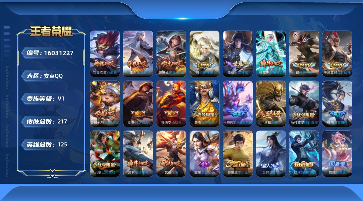 [16031227]安卓Q-V0-荣耀黄金I段位-125英雄-217皮肤-12传说-43史诗