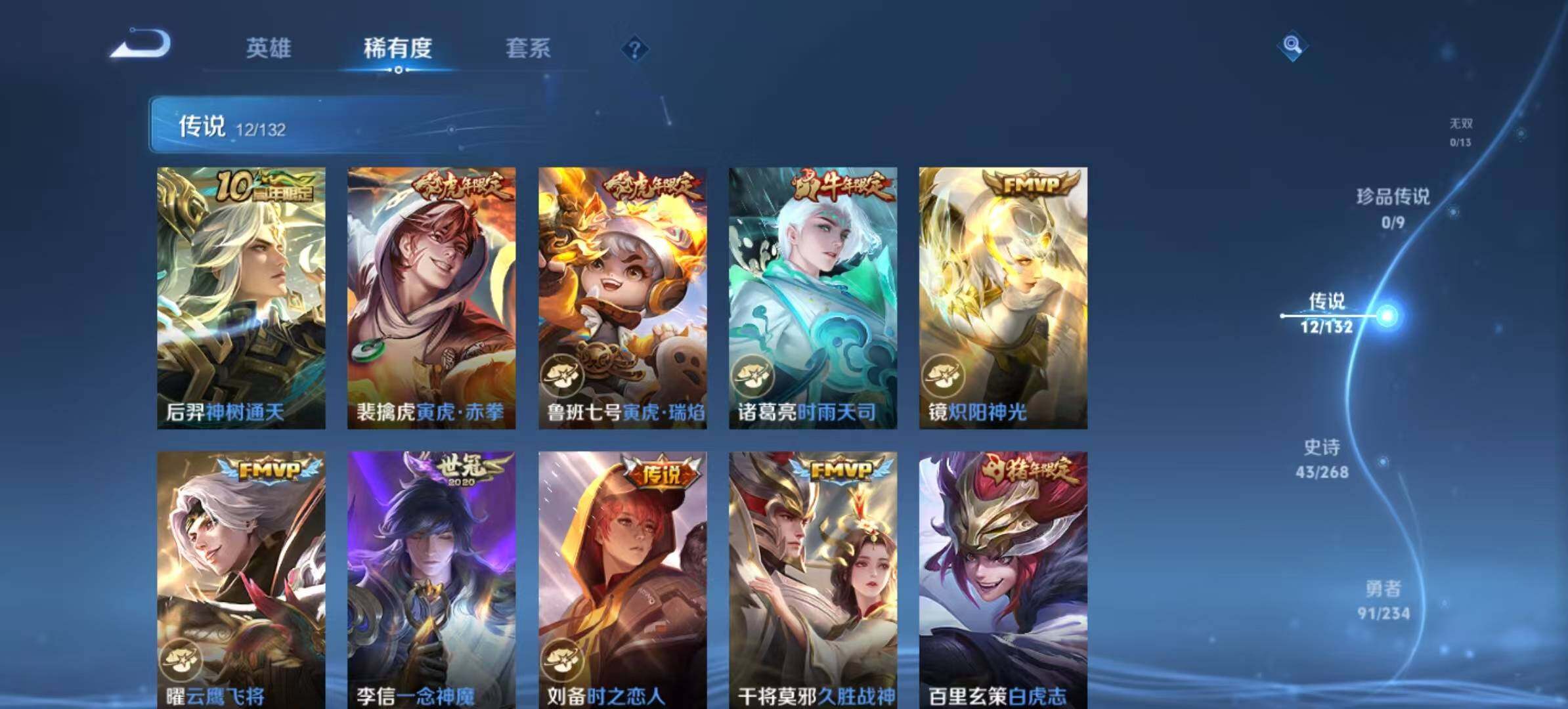 【传说皮肤】:后羿神树通天,裴擒虎寅虎赤拳,鲁班七号寅虎瑞焰,诸葛亮时雨天司,镜炽阳神光,曜云鹰飞将,李信一念神魔,刘备时之恋人,干将莫邪久胜战神,百里玄策白虎志,李白凤求凰,孙悟空地狱火