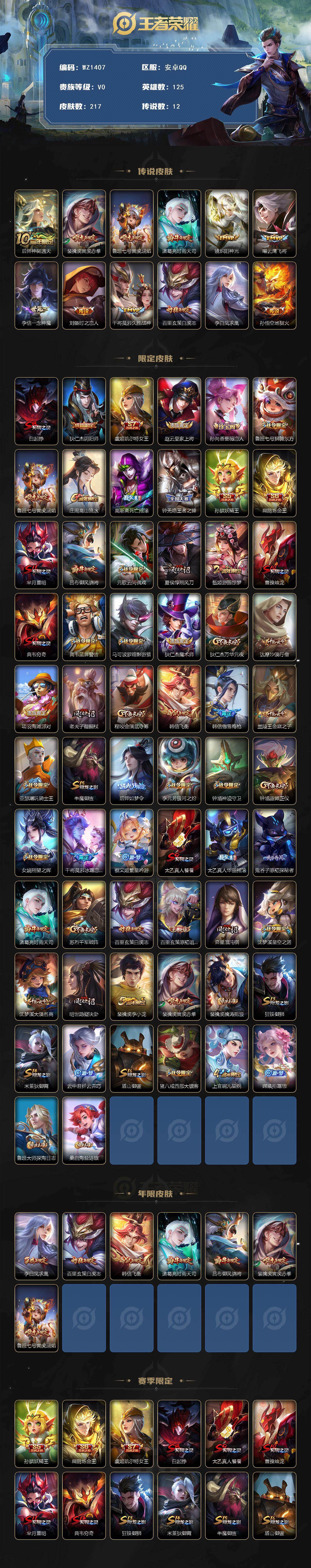 - [10106667]王者荣耀-安卓QQ 贵6 星元皮肤1 传说皮肤6 史诗皮肤30 皮肤数量124 皮肤价值:85516 英雄124 永恒钻石III 总场次2846 【内测皮肤】1 姬小满_妄想食味【星元皮肤】1 未来机甲 【传说皮肤】6 云缨_幻光神枪 妲己_愿照众生和 司空震_愿照山河定 澜_愿照九州拓 桑启_鸣野蒿 李信_一念神魔 【史诗皮肤】30 后羿_石田雨龙 孙膑_茶境仙 阿轲_化蝶舞 狂铁_龙之律动 狄仁杰_魔术师 赵云_皇家上将 铠_曙光守护者 花木兰_水晶猎龙者 阿古朵_江河有灵 上官婉儿_梁祝 钟馗_乐园奇幻夜 不知火舞_魅语 白起_星夜王子 程咬金_功夫厨神 安琪拉_心灵骇客 兰陵王_暗隐猎兽者 夏侯惇_乘风破浪 刘邦_德古拉伯爵 貂蝉_圣诞恋歌 宫本武藏_鬼剑武藏 廉颇_地狱岩魂 露娜_紫霞仙子 吕布_圣诞狂欢 墨子_金属风暴 孙尚香_水果甜心 王昭君_偶像歌手 元歌_无心 嫦娥_拒霜思 狄仁杰_鹰眼统帅 【其他皮肤】88 白起_死霸装 姬小满_小满鸭 戈娅_玫蓝誓约 马超_访茗客 明世隐_景韶洛都 少司缘_灵卦秘语 西施_雪境奇遇 太乙真人_谧流熔炉 典韦_铁骨偃魂 影_魅影绮裳 苍_苍林狼骑 干将莫邪_雾都夜雨 苍_维京掠夺者 东皇太一_噬灭天穹 盘古_敬我三分 姜子牙_天穹之誓 周瑜_熔金海岸 杨戬_破阵退雄兵 刘邦_剑破天穹 貂蝉_长夏之忆 扁鹊_无尽旅途 铠_龙域领主 露娜_命运加冕 钟馗_虚灵犬护 张良_灵野札记 苏烈_春野闲踪 阿古朵_布丁狗之约 项羽_海滩派对 鬼谷子_天穹祈灯 张良_古海寻踪 鲁班大师_探海日志 裴擒虎_擒涛扼浪 桑启_海盐诗旅 沈梦溪_大漠名商 兰陵王_金庭之子 李元芳_云中旅人 达摩_沙漠行僧 苏烈_千军破阵 程咬金_演武夺筹 太乙真人_劲辣红锅 鲁班大师_乓乓大师 狂铁_特工战影 姜子牙_炽热元素使 甄姬_花好人间 张飞_五福同心 廉颇_功夫炙烤 嫦娥_漠中幻影 亚连_破局者 刘禅_秘密基地 哪吒_次元突破 吕布_野性能量 明世隐_虹云星官 老夫子_功夫老勺 钟无艳_海滩丽影 花木兰_兔女郎 达摩_拳王 安琪拉_玩偶对对碰 达摩_大发明家 典韦_黄金武士 韩信_教廷特使 赵云_忍炎影 赵云_白执事 妲己_少女阿狸 露娜_哥特玫瑰 亚瑟_死亡骑士 李白_敏锐之力 狄仁杰_阴阳师 暃_碧珀绯影 云缨_赤焰之缨 澜_孤猎 蒙恬_秩序猎龙将 镜_冰刃幻境 西施_归虚梦演 马超_幸存者 曜_归虚梦演 猪八戒_年年有余 李信_灼热之刃 元歌_午夜歌剧院 公孙离_花间舞 女娲_尼罗河女神 干将莫邪_第七人偶 马可波罗_激情绿茵 曹操_超能战警 貂蝉_异域舞娘 后羿_精灵王 露娜_绯红之刃 鲁班七号_福禄兄弟 张良_一千零一夜