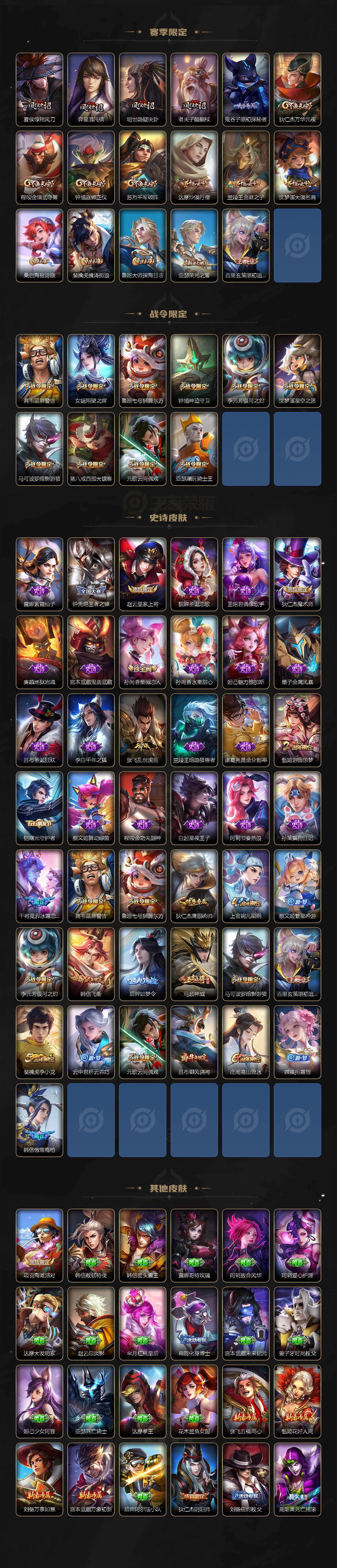 【赛季限定】:孙膑妖精王,扁鹊炼金王,虞姬凯尔特女王,白起狰,太乙真人饕餮,曹操烛龙,芈月重明,典韦穷奇,狂铁御狮,米莱狄御霄,牛魔御旌,盾山御銮,夏侯惇朔风刀,弈星混沌棋,明世隐疑决卦,老夫子醍醐杖,鬼谷子原初探秘者,狄仁杰万华元夜,程咬金演武夺筹,钟馗驱傩正仪,苏烈千军破阵,达摩沙漠行僧,兰陵王金庭之子,沈梦溪大漠名商,桑启海盐诗旅,裴擒虎擒涛扼浪,鲁班大师探海日志,亚瑟荣光之誓,百里玄策原初追逐者