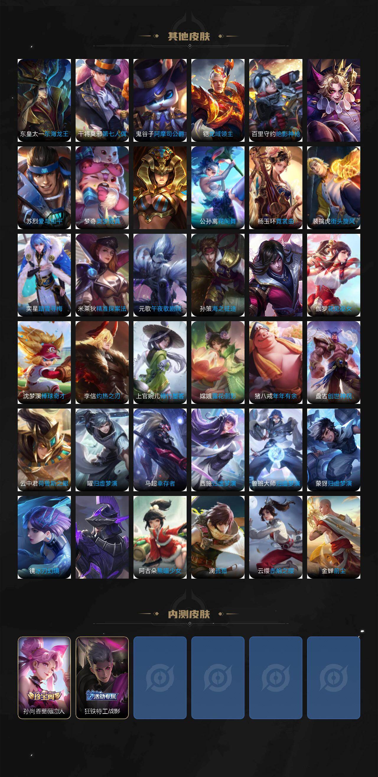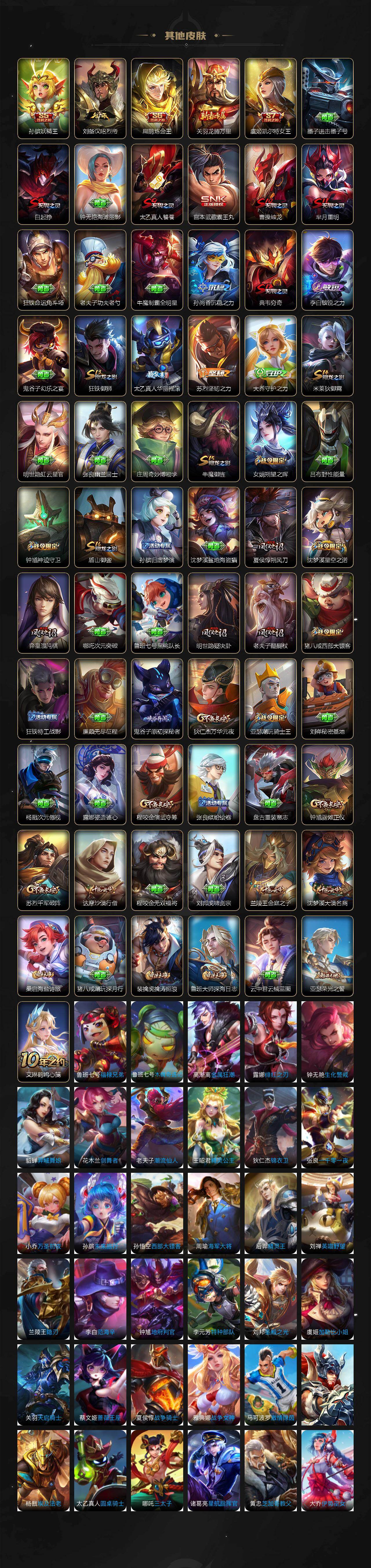 孙膑妖精王,扁鹊炼金王,虞姬凯尔特女王,白起狰,太乙真人饕餮,曹操烛龙,芈月重明,典韦穷奇,狂铁御狮,米莱狄御霄,牛魔御旌,盾山御銮,夏侯惇朔风刀,明世隐疑决卦,老夫子醍醐杖,鬼谷子原初探秘者,狄仁杰万华元夜,程咬金演武夺筹,钟馗驱傩正仪,苏烈千军破阵,女娲朔望之晖,典韦蓝屏警告,钟馗神迹守卫,鲁班七号狮舞东方,沈梦溪星空之诺,李元芳银河之约,马可波罗暗影游猎,元歌云间偶戏,弈星混沌棋,达摩沙漠行僧,兰陵王金庭之子,沈梦溪大漠名商,桑启海盐诗旅,裴擒虎擒涛扼浪,鲁班大师探海日志