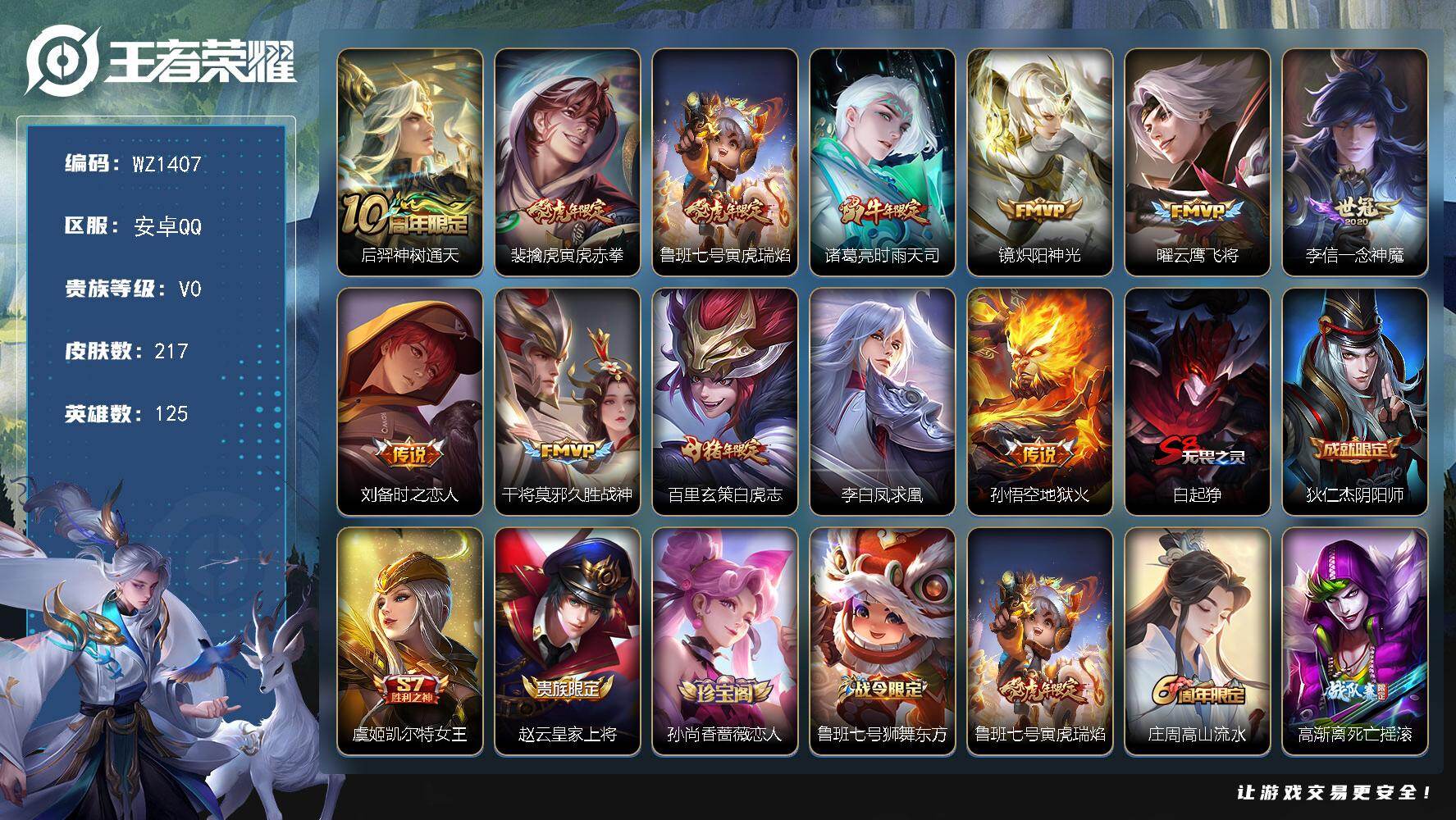 [16031227]安卓Q-V0-荣耀黄金I段位-125英雄-217皮肤-12传说-43史诗 【传说皮肤】:后羿神树通天,裴擒虎寅虎赤拳,鲁班七号寅虎瑞焰,诸葛亮时雨天司,镜炽阳神光,曜云鹰飞将,李信一念神魔,刘备时之恋人,干将莫邪久胜战神,百里玄策白虎志,李白凤求凰,孙悟空地狱火 【限定皮肤】:白起狰,狄仁杰阴阳师,虞姬凯尔特女王,赵云皇家上将,孙尚香蔷薇恋人,鲁班七号狮舞东方,鲁班七号寅虎瑞焰,庄周高山流水,高渐离死亡摇滚,钟无艳王者之锤,孙膑妖精王,扁鹊炼金王,芈月重明,吕布御风骁将,元歌云间偶戏,夏侯惇朔风刀,甄姬游园惊梦,曹操烛龙,典韦穷奇,典韦蓝屏警告,马可波罗暗影游猎,狄仁杰魔术师,狄仁杰万华元夜,达摩沙漠行僧,项羽海滩派对,老夫子醍醐杖,程咬金演武夺筹,韩信飞衡,韩信傲雪梅枪,兰陵王金庭之子,亚瑟潮玩骑士王,牛魔御旌,后羿如梦令,李元芳银河之约,钟馗神迹守卫,钟馗驱傩正仪,女娲朔望之晖,干将莫邪冰霜恋舞曲,蔡文姬繁星吟游,太乙真人饕餮,太乙真人华丽摇滚,鬼谷子原初探秘者,诸葛亮时雨天司,苏烈千军破阵,百里玄策白虎志,百里玄策原初追逐者,弈星混沌棋,沈梦溪星空之诺,沈梦溪大漠名商,明世隐疑决卦,裴擒虎李小龙,裴擒虎寅虎赤拳,裴擒虎擒涛扼浪,狂铁御狮,米莱狄御霄,云中君纤云弄巧,盾山御銮,猪八戒西部大镖客,上官婉儿梁祝,嫦娥拒霜思,鲁班大师探海日志,桑启海盐诗旅 【年限皮肤】:李白凤求凰,百里玄策白虎志,韩信飞衡,诸葛亮时雨天司,吕布御风骁将,裴擒虎寅虎赤拳,鲁班七号寅虎瑞焰 【赛季限定】:孙膑妖精王,扁鹊炼金王,虞姬凯尔特女王,白起狰,太乙真人饕餮,曹操烛龙,芈月重明,典韦穷奇,狂铁御狮,米莱狄御霄,牛魔御旌,盾山御銮,夏侯惇朔风刀,弈星混沌棋,明世隐疑决卦,老夫子醍醐杖,鬼谷子原初探秘者,狄仁杰万华元夜,程咬金演武夺筹,钟馗驱傩正仪,苏烈千军破阵,达摩沙漠行僧,兰陵王金庭之子,沈梦溪大漠名商,桑启海盐诗旅,裴擒虎擒涛扼浪,鲁班大师探海日志,亚瑟荣光之誓,百里玄策原初追逐者 【战令限定】:典韦蓝屏警告,女娲朔望之晖,鲁班七号狮舞东方,钟馗神迹守卫,李元芳银河之约,沈梦溪星空之诺,马可波罗暗影游猎,猪八戒西部大镖客,元歌云间偶戏,亚瑟潮玩骑士王 【史诗皮肤】:露娜紫霞仙子,钟无艳王者之锤,赵云皇家上将,貂蝉圣诞恋歌,王昭君偶像歌手,狄仁杰魔术师,廉颇地狱岩魂,宫本武藏鬼剑