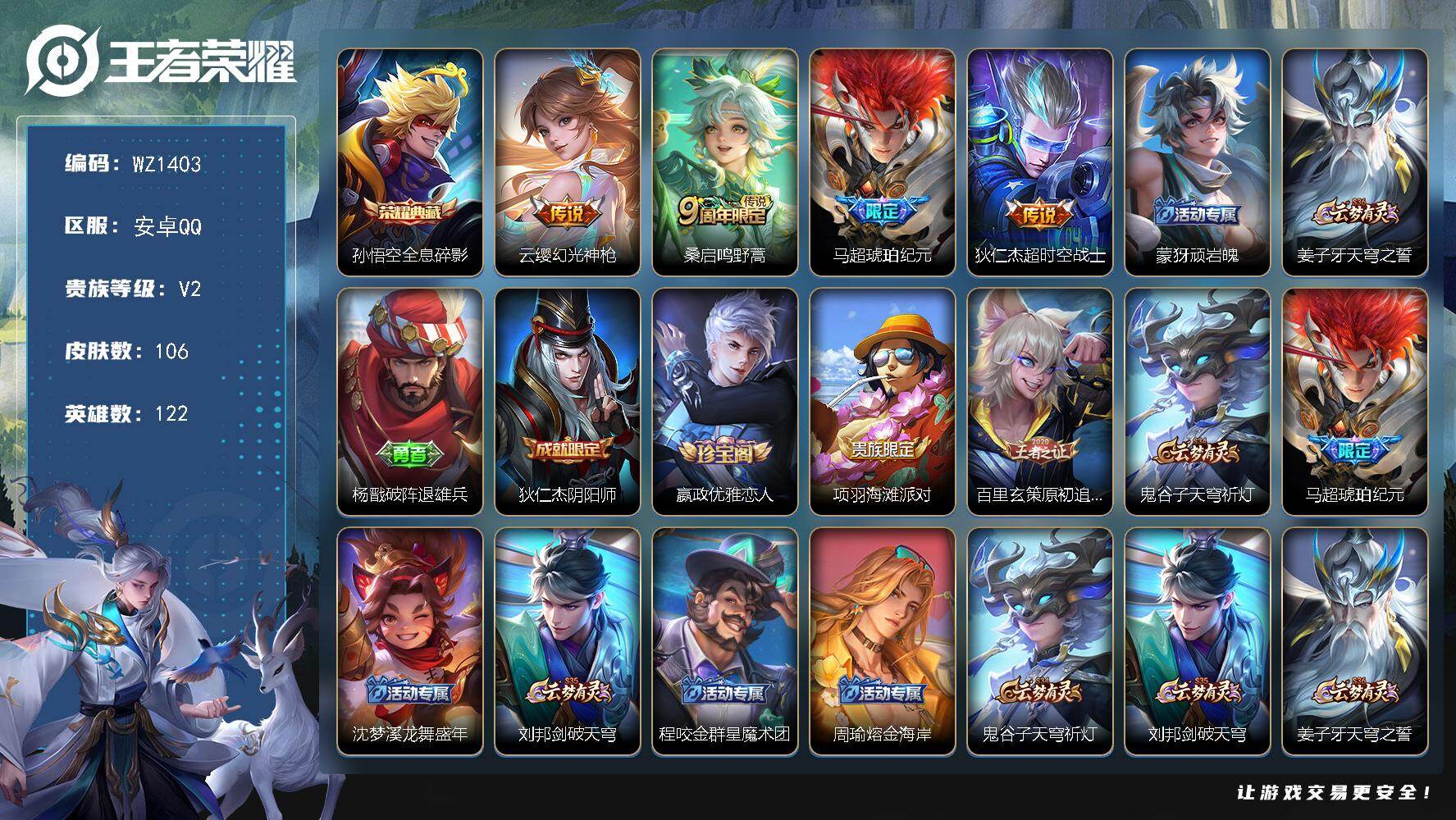[16031270]安卓Q-V2-122英雄-106皮肤-1典藏皮肤-4传说-18史诗 【荣耀典藏】:孙悟空全息碎影 【传说皮肤】:云缨幻光神枪,桑启鸣野蒿,马超琥珀纪元,狄仁杰超时空战士 【限定皮肤】:蒙犽顽岩魄,姜子牙天穹之誓,杨戬破阵退雄兵,狄仁杰阴阳师,嬴政优雅恋人,项羽海滩派对,百里玄策原初追逐者,鬼谷子天穹祈灯,马超琥珀纪元,沈梦溪龙舞盛年,刘邦剑破天穹,程咬金群星魔术团,周瑜熔金海岸 【赛季限定】:鬼谷子天穹祈灯,刘邦剑破天穹,姜子牙天穹之誓,东皇太一噬灭天穹,太乙真人谧流熔炉,钟馗虚灵犬护,甄姬逆浪荇歌,百里玄策原初追逐者,牛魔星界战将 【史诗皮肤】:甄姬冰雪圆舞曲,廉颇地狱岩魂,宫本武藏鬼剑武藏,孙尚香水果甜心,嬴政优雅恋人,妲己魅力维加斯,李白千年之狐,花木兰水晶猎龙者,诸葛亮黄金分割率,蔡文姬舞动绿茵,程咬金功夫厨神,白起星夜王子,狄仁杰鹰眼统帅,百里玄策原初追逐者,蒙犽顽岩魄,牛魔星界战将,狂铁龙之律动,黄忠百相守梦 【其他皮肤】:项羽海滩派对,韩信教廷特使,韩信街头霸王,露娜哥特玫瑰,赵云忍炎影,芈月红桃皇后,程咬金星际陆战队,白起白色死神,牛魔西部大镖客,武则天东方不败,扁鹊救世之瞳,妲己少女阿狸,典韦黄金武士,亚瑟死亡骑士,张飞五福同心,甄姬花好人间,后羿阿尔法小队,狄仁杰阴阳师,关羽龙腾万里,老夫子功夫老勺,李白敏锐之力,大乔守护之力,小乔丁香结,姜子牙炽热元素使,哪吒次元突破,狂铁特工战影,刘禅秘密基地,鲁班大师乓乓大师,妲己紫罗兰之誓,蒙恬蔚蓝守将,戈娅危途狂花,猪八戒潮玩探月行,太乙真人劲辣红锅,李元芳妄想特派,后羿完美运算,鬼谷子天穹祈灯,沈梦溪龙舞盛年,钟无艳春野之旅,刘邦剑破天穹,程咬金群星魔术团,杨戬破阵退雄兵,姜子牙天穹之誓,周瑜熔金海岸,盘古敬我三分,东皇太一噬灭天穹,干将莫邪雾都夜雨,苍苍林狼骑,太乙真人谧流熔炉,典韦铁骨偃魂,西施雪境奇遇,姜子牙星梦巡礼,明世隐景韶洛都,戈娅玫蓝誓约,刘备浪漫序章,钟馗虚灵犬护,苏烈春野闲踪,张良灵野札记,阿古朵布丁狗之约,露娜命运加冕,姬小满小满鸭,白起死霸装,甄姬逆浪荇歌,庄周锦麟游梦,莱西奥踏浪烽翎,艾琳鹤鸣心笺,鲁班七号福禄兄弟,小乔万圣前夜,孙悟空西部大镖客,马可波罗激情绿茵,黄忠芝加哥教父,百里守约绝影神枪,百里玄策威尼斯狂欢,裴擒虎街头旋风,元歌午夜歌剧院,孙策海之征途,李信灼热之刃