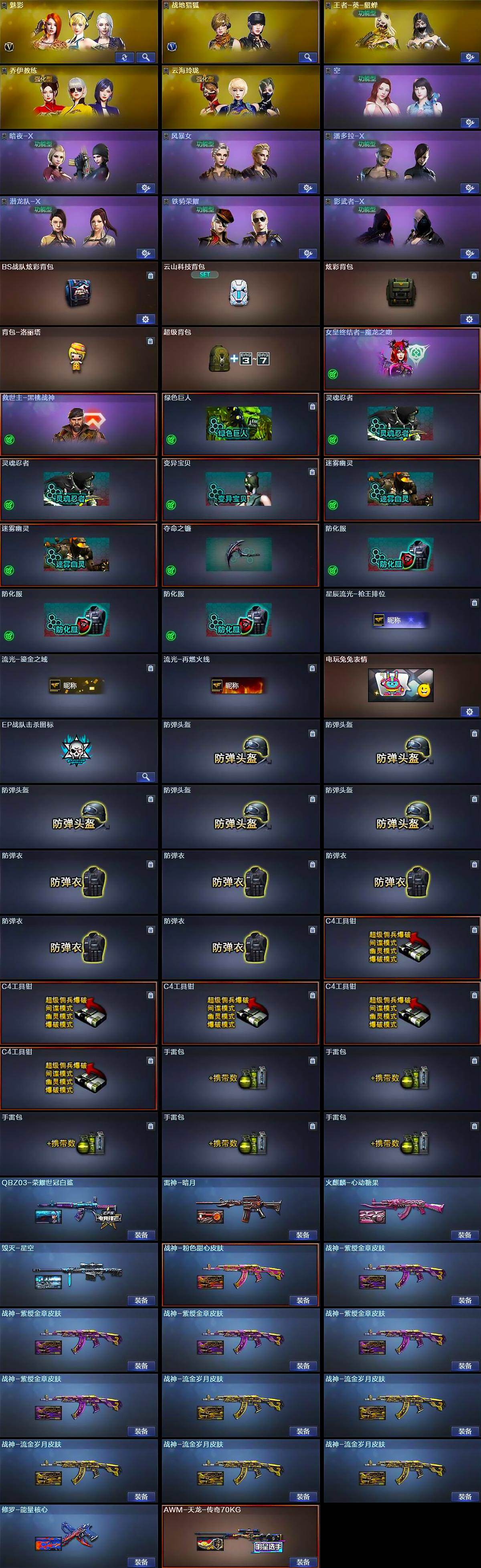 【道具】:BS战队炫彩背包,云山科技背包,炫彩背包,背包-洛丽塔,超级背包,女皇终结者-魔龙之吻,救世主-黑桃战神,绿色巨人,灵魂忍者*2,变异宝贝,迷雾幽灵*2,夺命之镰,防化服*3,星辰流光-枪王排位,流光-鎏金之域,流光-再燃火线,电玩兔兔表情,EP战队击杀图标,防弹头盔*5,防弹衣*5,C4工具钳*5,手雷包*5