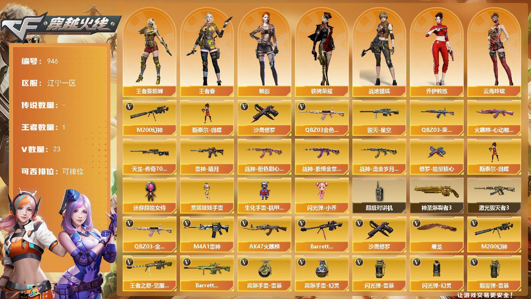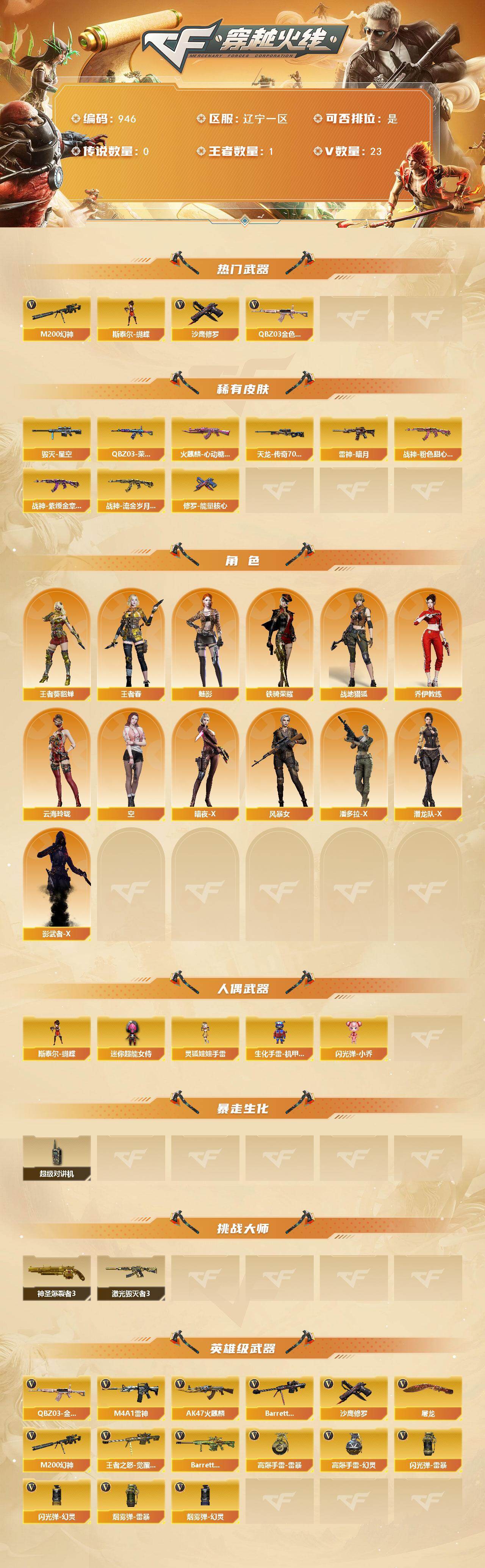 [15788068]辽宁一区-23V-1王者-0炫金 【热门武器】:QBZ03-金色蔷薇,M200-幻神,斯泰尔-蝴蝶,沙鹰-修罗*2 【皮肤】:QBZ03-荣耀世冠白鲨,雷神-暗月,火麒麟-心动糖果,毁灭-星空,战神-粉色甜心皮肤,战神-紫绶金章皮肤*5,战神-流金岁月皮肤*5,AWM-天龙-传奇70KG,修罗-能量核心 【角色】:魅影,战地猎狐,王者-葵-貂蝉,王者春,乔伊教练,云海玲珑,空,暗夜-X,风暴女,潘多拉-X,潜龙队-X,铁骑荣耀,影武者-X 【人偶武器】:斯泰尔-蝴蝶,生化手雷-机甲核心,闪光弹-小乔,迷你超能女侍,灵狐娃娃手雷 【暴走生化】:超级对讲机 【挑战大师】:神圣爆裂者III,激光毁灭者III 【英雄级武器】:AK47-火麒麟,M4A1-雷神,QBZ03-金色蔷薇,Barrett-毁灭,M200-幻神,王者之怒-觉醒版,沙鹰-修罗*2,屠龙*2,高爆手雷-雷暴,高爆手雷-幻灵,闪光弹-雷暴*3,闪光弹-幻灵,烟雾弹-雷暴*3,烟雾弹-幻灵,Barrett-碧霄极光 【道具】:BS战队炫彩背包,云山科技背包,炫彩背包,背包-洛丽塔,超级背包,女皇终结者-魔龙之吻,救世主-黑桃战神,绿色巨人,灵魂忍者*2,变异宝贝,迷雾幽灵*2,夺命之镰,防化服*3,星辰流光-枪王排位,流光-鎏金之域,流光-再燃火线,电玩兔兔表情,EP战队击杀图标,防弹头盔*5,防弹衣*5,C4工具钳*5,手雷包*5 【特殊枪械】:蝴蝶斯泰尔+0烈龙,1蝴蝶斯泰尔