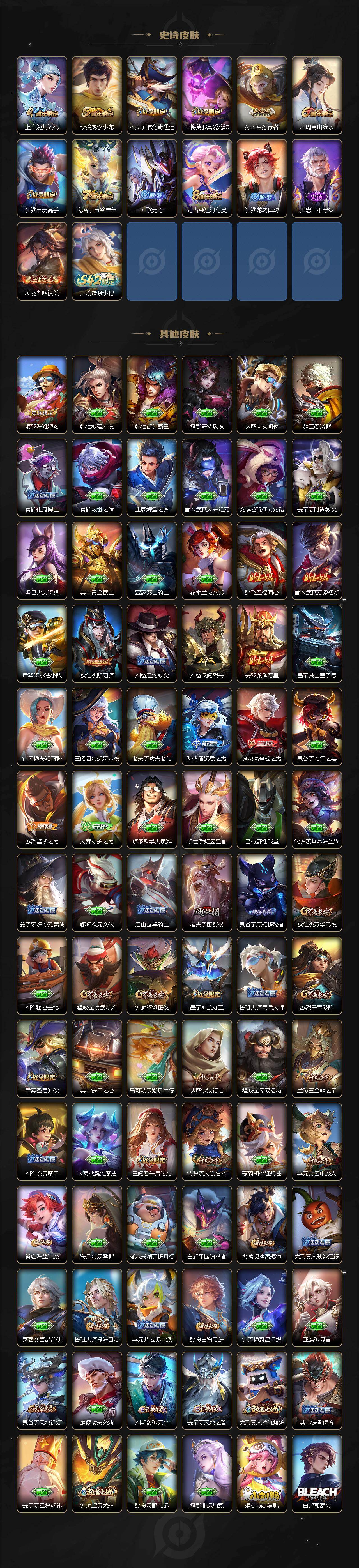 【史诗皮肤】:赵云未来纪元,甄姬冰雪圆舞曲,宫本武藏鬼剑武藏,孙尚香蔷薇恋人,孙尚香水果甜心,嬴政优雅恋人,嬴政摇滚巨星,妲己魅力维加斯,妲己女仆咖啡,墨子金属风暴,吕布圣诞狂欢,曹操幽灵船长,夏侯惇乘风破浪,小乔缤纷独角兽,雅典娜冰冠公主,安琪拉心灵骇客,铠曙光守护者,蔡文姬舞动绿茵,刘禅天才门将,李元芳逐浪之夏,程咬金功夫厨神,阿轲节奏热浪,孙策猫狗日记,狄仁杰鹰眼统帅,上官婉儿梁祝,裴擒虎李小龙,老夫子航海奇遇记,干将莫邪真爱魔法,孙悟空孙行者,庄周高山流水,狂铁电玩高手,鬼谷子五谷丰年,元歌无心,阿古朵江河有灵,狂铁龙之律动,黄忠百相守梦,项羽九幽镇关,周瑜线条小狗
