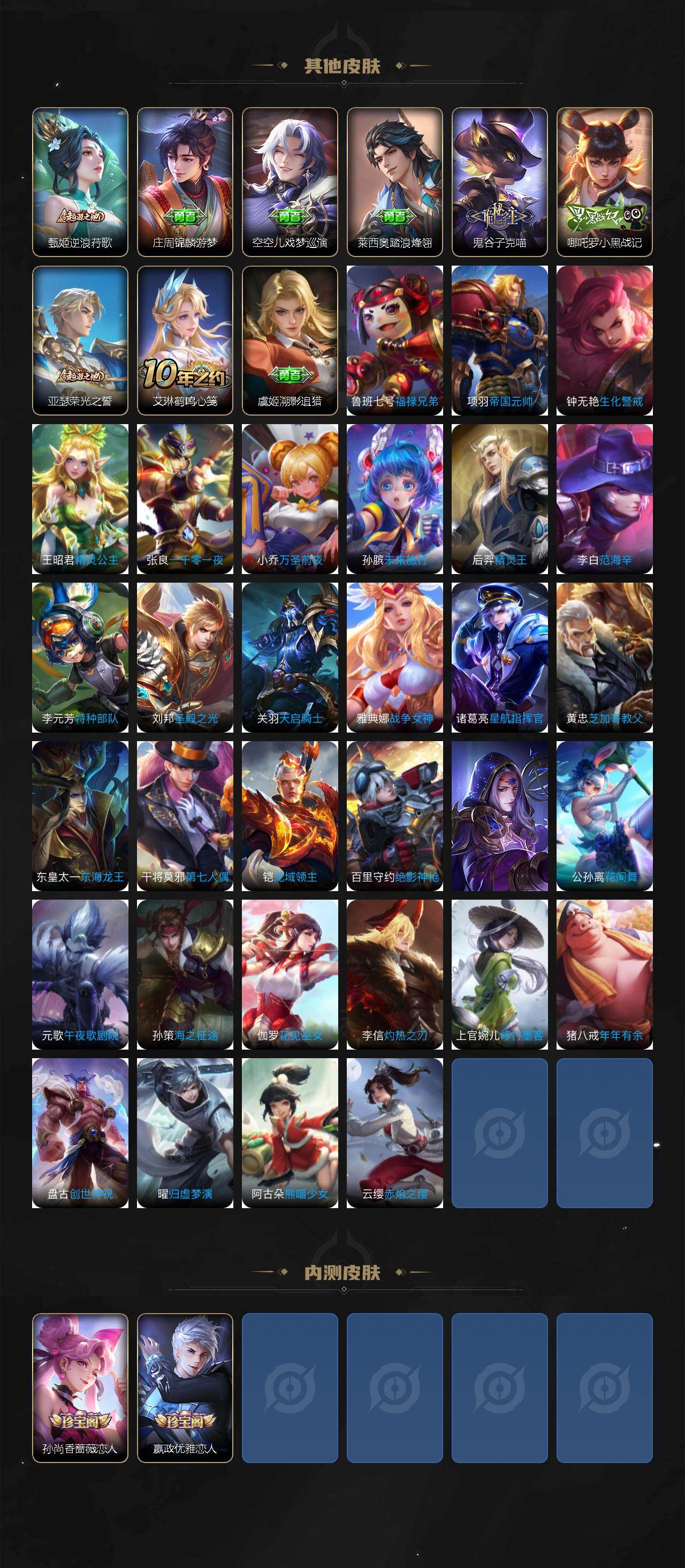 【限定皮肤】:姜子牙天穹之誓,狄仁杰阴阳师,墨子神迹守卫,嬴政优雅恋人,孙尚香蔷薇恋人,庄周高山流水,元歌无心,狄仁杰万华元夜,达摩沙漠行僧,项羽海滩派对,老夫子醍醐杖,老夫子航海奇遇记,程咬金演武夺筹,王昭君午后时光,兰陵王金庭之子,孙悟空孙行者,后羿圣弓游侠,李元芳云中旅人,钟馗驱傩正仪,干将莫邪真爱魔法,鬼谷子原初探秘者,鬼谷子五谷丰年,苏烈千军破阵,沈梦溪大漠名商,裴擒虎李小龙,裴擒虎擒涛扼浪,狂铁电玩高手,上官婉儿梁祝,鲁班大师探海日志,桑启海盐诗旅,阿古朵江河有灵,张良古海寻踪,鬼谷子天穹祈灯,刘邦剑破天穹