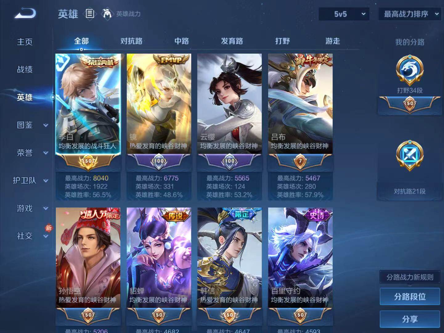 【赛季限定】:庄周蜃楼王,孙膑妖精王,扁鹊炼金王,虞姬凯尔特女王,白起狰,太乙真人饕餮,曹操烛龙,芈月重明,典韦穷奇,狂铁御狮,米莱狄御霄,牛魔御旌,盾山御銮,夏侯惇朔风刀,弈星混沌棋,明世隐疑决卦,老夫子醍醐