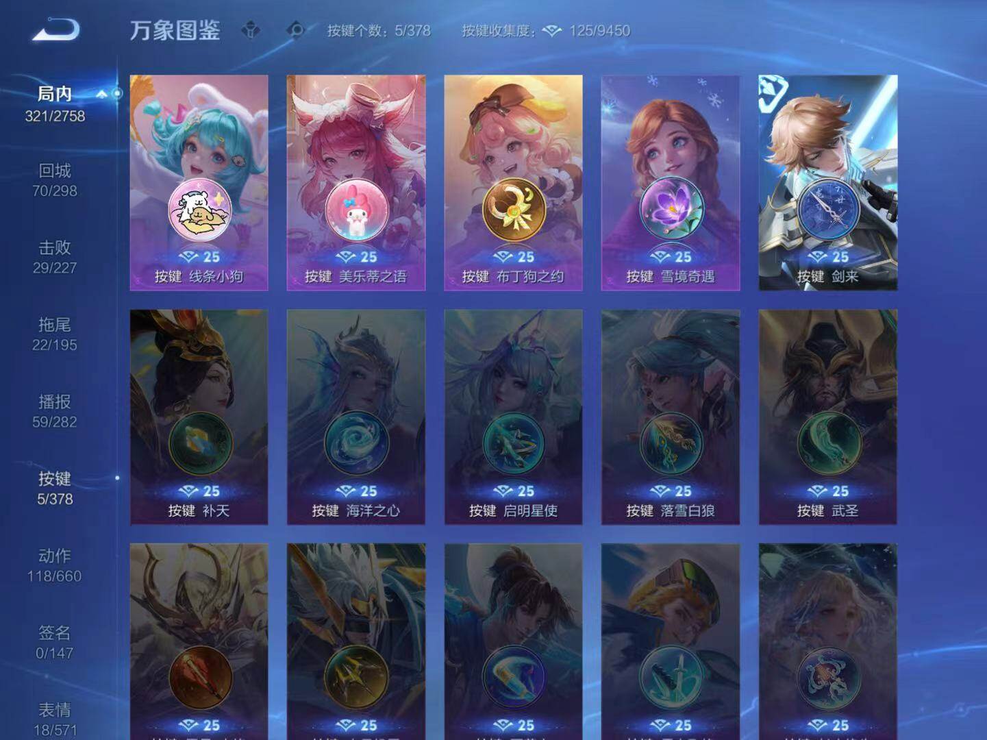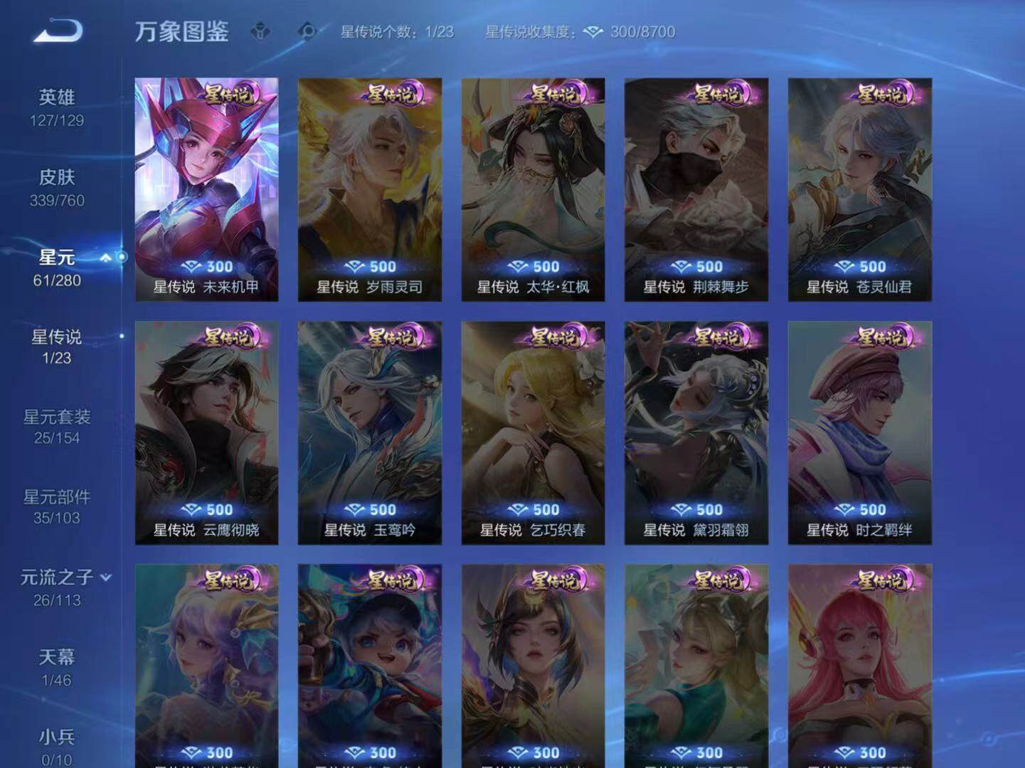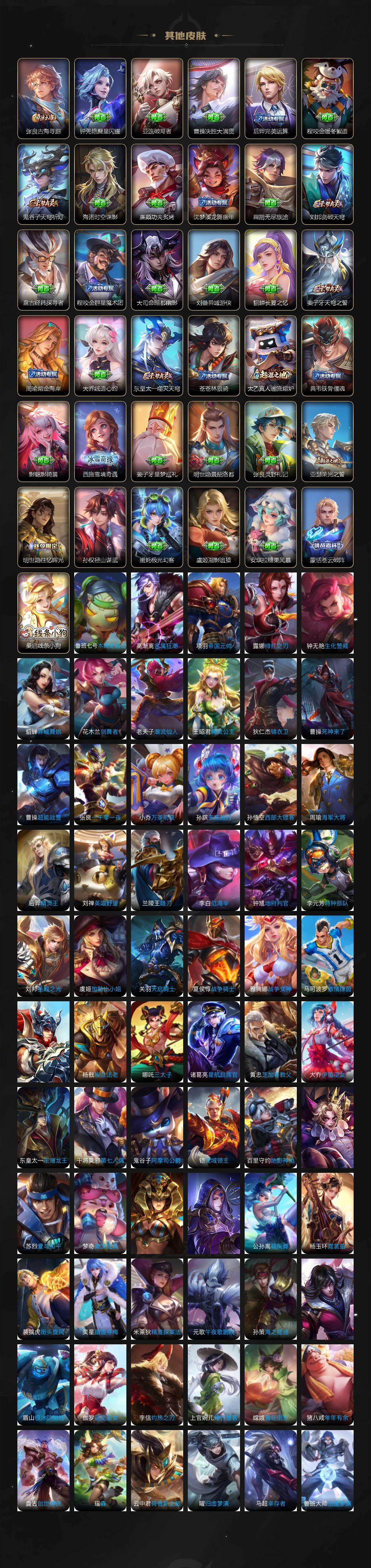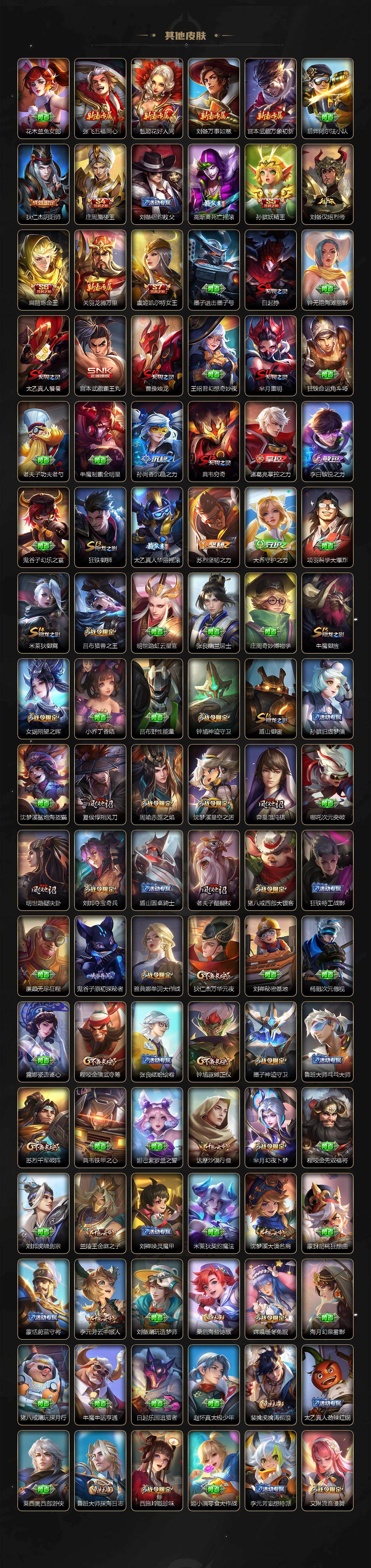 庄周蜃楼王,孙膑妖精王,扁鹊炼金王,虞姬凯尔特女王,白起狰,太乙真人饕餮,曹操烛龙,芈月重明,典韦穷奇,狂铁御狮,米莱狄御霄,牛魔御旌,盾山御銮,夏侯惇朔风刀,明世隐疑决卦,老夫子醍醐杖,鬼谷子原初探秘者,狄仁杰万华元夜,程咬金演武夺筹,钟馗驱傩正仪,苏烈千军破阵,吕布猎兽之王,女娲朔望之晖,典韦蓝屏警告,钟馗神迹守卫,鲁班七号狮舞东方,沈梦溪星空之诺,李元芳银河之约,刘邦夺宝奇兵,马可波罗暗影游猎,蒙犽狂想玩偶喵,弈星混沌棋,达摩沙漠行僧,兰陵王金庭之子,沈梦溪大漠名商,李元芳云中旅人,桑启海盐诗旅,裴擒虎擒涛扼浪,鲁班大师探海日志,张良古海寻踪