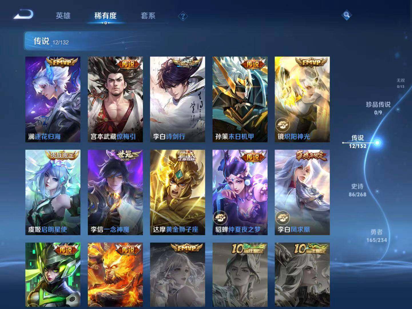 【传说皮肤】:澜逐花归海,宫本武藏惊梅引,李白诗剑行,孙策末日机甲,镜炽阳神光,虞姬启明星使,李信一念神魔,达摩黄金狮子座,貂蝉仲夏夜之梦,李白凤求凰,孙尚香末日机甲,孙悟空地狱火