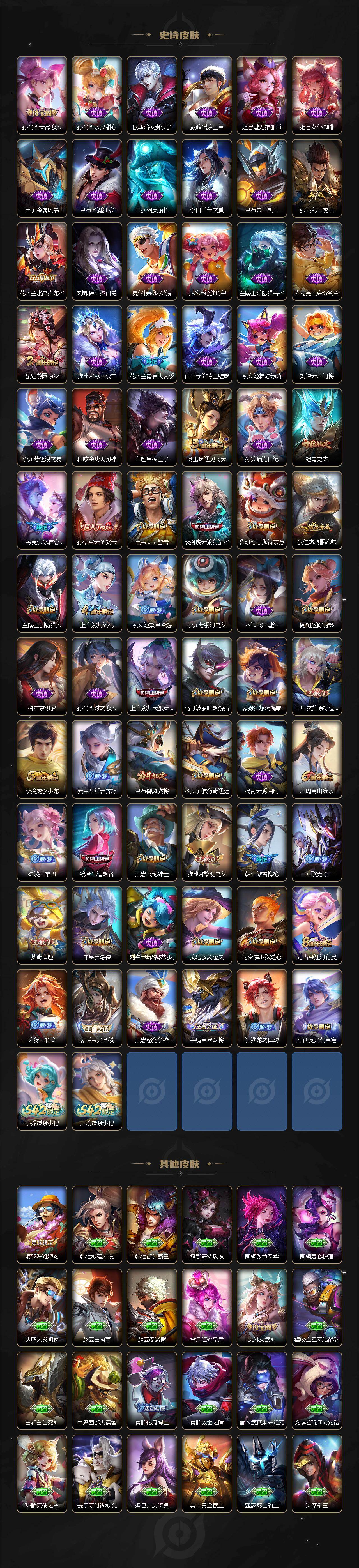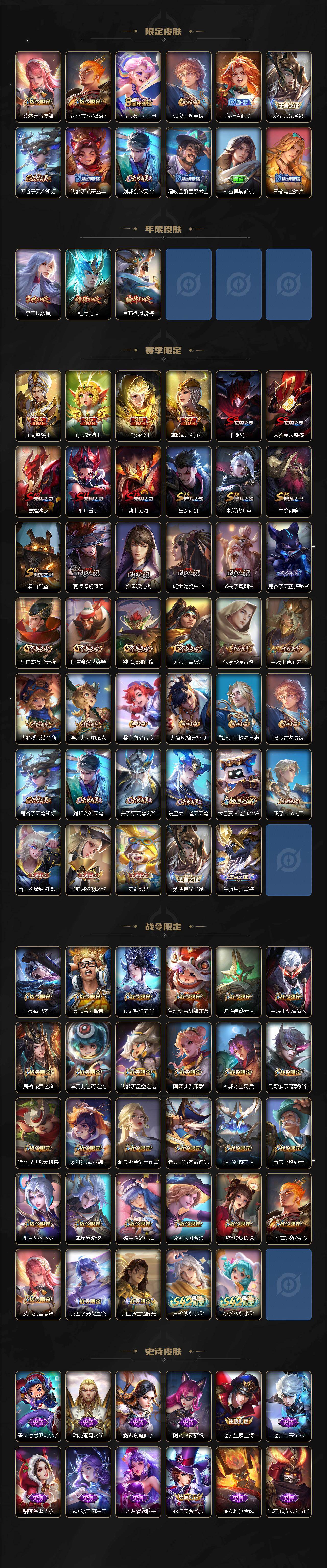 【限定皮肤】:白起狰,大乔绒语心约,姜子牙天穹之誓,狄仁杰阴阳师,虞姬凯尔特女王,赵云皇家上将,墨子神迹守卫,孙尚香蔷薇恋人,鲁班七号狮舞东方,庄周蜃楼王,庄周高山流水,高渐离死亡摇滚,阿轲迷踪丽影,孙膑妖精王,扁鹊炼金王,芈月重明,芈月幻夜卜梦,吕布猎兽之王,吕布御风骁将,周瑜赤莲之焰,元歌无心,夏侯惇朔风刀,甄姬游园惊梦,曹操烛龙,典韦穷奇,典韦蓝屏警告,马可波罗暗影游猎,狄仁杰魔术师,狄仁杰万华元夜,达摩沙漠行僧,项羽海滩派对,老夫子醍醐杖,老夫子航海奇遇记,程咬金演武夺筹,刘邦夺宝奇兵,韩信傲雪梅枪,兰陵王驯魔猎人,兰陵王金庭之子,花木兰青春决赛季,孙悟空大圣娶亲,牛魔御旌,李元芳银河之约,李元芳云中旅人,虞姬启明星使,钟馗神迹守卫,钟馗驱傩正仪,杨玉环遇见飞天,女娲朔望之晖,干将莫邪冰霜恋舞曲,雅典娜单词大作战,雅典娜黎明之约,蔡文姬繁星吟游,太乙真人饕餮,太乙真人华丽摇滚,鬼谷子原初探秘者,黄忠火炮绅士,铠青龙志,苏烈千军破阵,百里玄策原初追逐者,弈星混沌棋,梦奇顽趣,沈梦溪星空之诺,沈梦溪大漠名商,明世隐疑决卦,裴擒虎天狼狩猎者,裴擒虎李小龙,裴擒虎擒涛扼浪,狂铁御狮,米莱狄御霄,云中君纤云弄巧,盾山御銮,猪八戒西部大镖客,上官婉儿梁祝,上官婉儿天狼绘梦者,嫦娥拒霜思,嫦娥暖冬兔眠,西施玲珑珍味,蒙犽狂想玩偶喵,鲁班大师探海日志,镜匿光追影者,桑启海盐诗旅,暃星界游侠,戈娅驭风魔法,艾琳女武神,艾琳流音漫舞,司空震地狱燃心,阿古朵江河有灵,张良古海寻踪,蒙犽百解令,蒙恬荣光圣徽,鬼谷子天穹祈灯,沈梦溪龙舞盛年,刘邦剑破天穹,程咬金群星魔术团,刘备异域游侠,周瑜熔金海岸