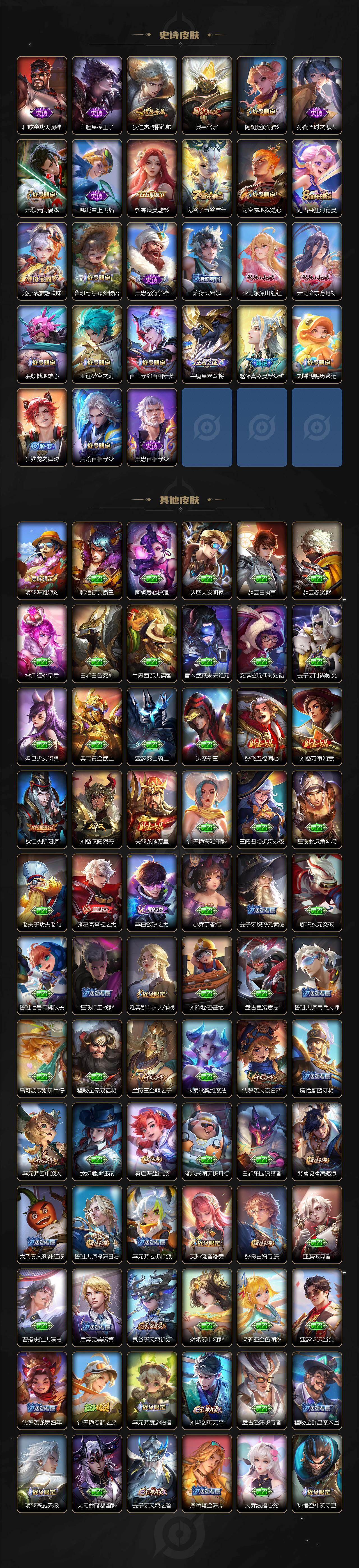 【史诗皮肤】:赵云皇家上将,赵云未来纪元,甄姬冰雪圆舞曲,王昭君偶像歌手,狄仁杰魔术师,宫本武藏鬼剑武藏,孙尚香水果甜心,嬴政优雅恋人,妲己魅力维加斯,妲己女仆咖啡,墨子金属风暴,曹操幽灵船长,吕布末日机甲,刘邦德古拉伯爵,夏侯惇乘风破浪,兰陵王暗隐猎兽者,亚瑟心灵战警,安琪拉心灵骇客,程咬金功夫厨神,白起星夜王子,狄仁杰鹰眼统帅,典韦岱宗,阿轲迷踪丽影,孙尚香时之恋人,元歌云间偶戏,哪吒雪上飞焰,貂蝉唤灵魅影,鬼谷子五谷丰年,司空震地狱燃心,阿古朵江河有灵,姬小满妄想食味,鲁班七号蔬乡物语,黄忠怒海争锋,蒙犽顽岩魄,少司缘涂山红红,大司命东方月初,廉颇撼地雄心,亚连破空之剑,百里守约百相守梦,牛魔星界战将,赵怀真器灵浮梦炉,刘禅鸭鸭历险记,狂铁龙之律动,周瑜百相守梦,黄忠百相守梦