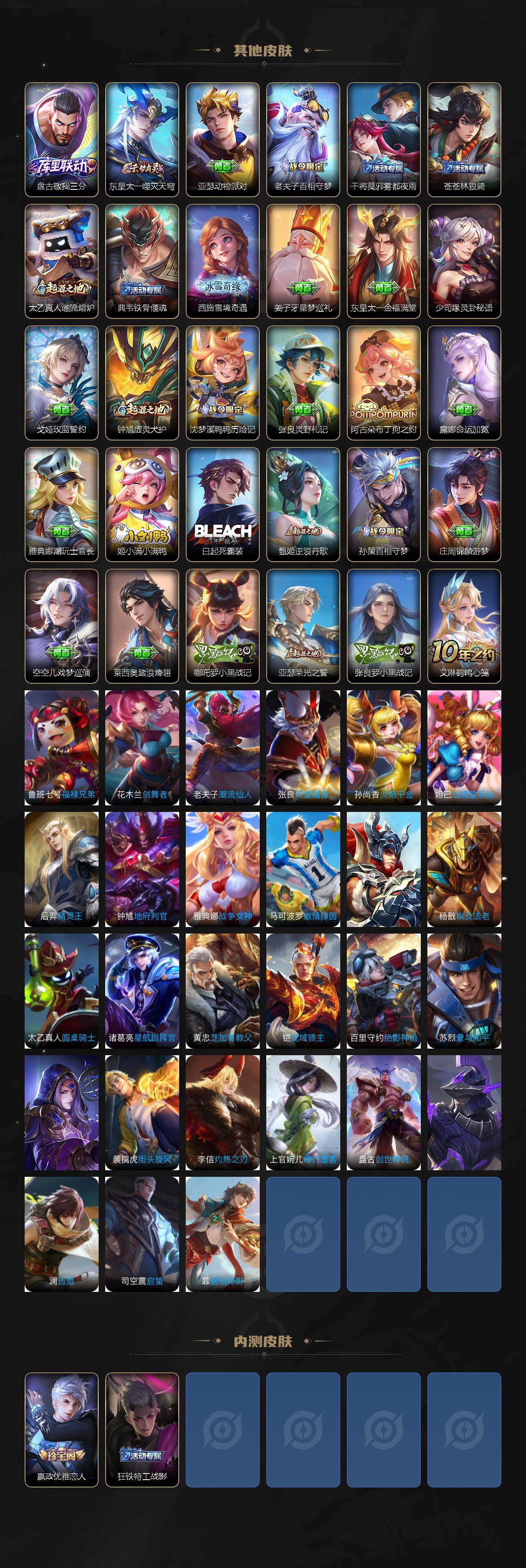 【限定皮肤】:蒙犽顽岩魄,大乔绒语心约,姜子牙天穹之誓,狄仁杰阴阳师,赵云皇家上将,嬴政优雅恋人,阿轲迷踪丽影,元歌云间偶戏,典韦岱宗,狄仁杰魔术师,项羽海滩派对,兰陵王金庭之子,李元芳云中旅人,雅典娜单词大作战,鬼谷子五谷丰年,沈梦溪大漠名商,裴擒虎擒涛扼浪,鲁班大师探海日志,桑启海盐诗旅,艾琳流音漫舞,司空震地狱燃心,阿古朵江河有灵,张良古海寻踪,鬼谷子天穹祈灯,姬小满妄想食味,沈梦溪龙舞盛年,鲁班七号蔬乡物语,李元芳蔬乡物语,刘邦剑破天穹,程咬金群星魔术团,项羽苍威无极,周瑜熔金海岸