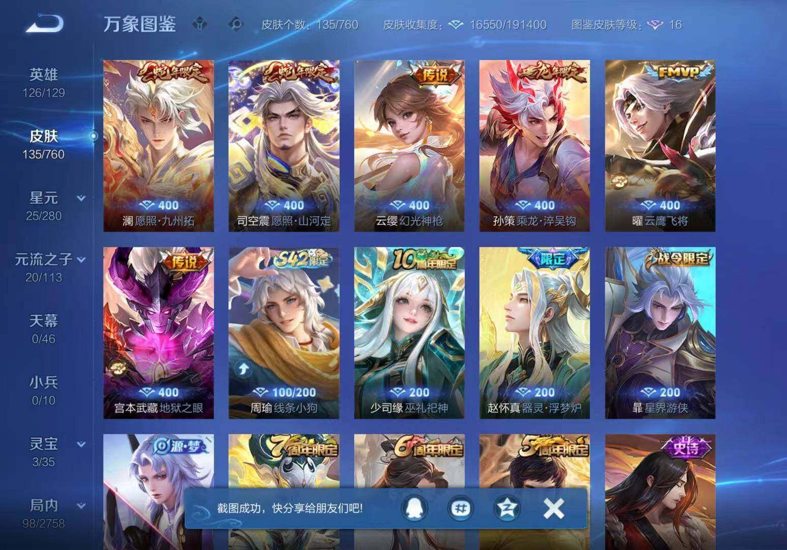 - [11687772]V10 6典藏 62传说 126英雄 527皮肤 典藏英雄武则天 可修改实名 优质装备:天鹅之梦(小乔典藏),倪克斯神谕(宇宙婆娘),无限飓风号(高达),鸣剑·曳影,全息碎影(猴子典藏),银白咏叹调(倪克斯侍卫),黄金狮子座,黄金射手座,冠军飞将,云鹰飞将(小将军),绛天战甲(鸡嘴战神),黄金白羊座,猫影幻舞,久胜战神,炽阳神光,一念神魔,云霓雀翎,末日机甲-孙尚香(绿蚂蚱),地狱火,仲夏夜之梦(大飞蛾),零号·赤焰,海洋之心,地狱之眼,飞鸢探春,胖达荣荣,乞巧织情,时之恋人-刘备(电焊工),淬星耀世,超时空战士-狄仁杰,末日机甲-孙策,花朝如约(花篮子),山海·炽霜斩(李信年限),山海·琳琅生(小乔年限),山海·苍雷引(电光曜子),艾琳觅芳踪,金乌负日,黄金天蝎座,云中君群星魔术团,朵莉亚心动手记 传说皮:乘龙·问璇玑(孙尚香年限),乘龙·铭钟鼎(赵云年限),乘龙·淬吴钩(孙策年限),貂蝉曦玄引,吕布曦玄引,典韦战鼓燎原,落雪白狼,幻光神枪 珍宝阁皮:妄想食味,优雅恋人,蔷薇恋人,女武神 限定皮:愿照·九州拓(澜年限),愿照·福禄聚(蔡文姬年限),愿照·岁时盈(虞姬年限),愿照·山河定(司空震年限),愿照·众生和(妲己年限),愿照·千秋盛(女娲年限),逐霄战戟,鸣野蒿,至尊宝,白虎志(电光耗子),凤求凰(白切鸡),凤凰于飞,太华(伽罗年限),梅西,武陵仙君(小桃花),寅虎·展翼(孙膑年限),魔法小厨娘,白晶晶,时雨天司(水龙头),神威(电光马子),飞衡(韩信年限),玄嵩(庄周年限),山海·碧波行(瑶年限),无限倾心-项羽,瑞麟志(木兰年限),遇见飞天,无限倾心-虞姬,齐天大圣,五谷丰年,青龙志(铠年限),冰锋战神,幽恒(沐浴露),武圣,天狼运算者,游园惊梦,梁祝,御风骁将(吕布年限),天狼狩猎者,龙胆,逐梦之翼,逐梦之星,岱宗(典韦年限),天狼征服者,奔雷神使(牛魔年限),祈雪灵祝(雪兔子),天狼绘梦者,李小龙,逐梦之影,逐梦之光,玄武志(苏烈年限),朱雀志(守约年限),永曜之星,辉光之辰,如梦令-嫦娥,如梦令-后羿,霸王别姬-项羽,霸王别姬-虞姬,奇迹圣诞,默契交锋-兰陵王,默契交锋-花木兰,孙行者,猪悟能,一生所爱,大圣娶亲,引擎之心,天魔缭乱,青春决赛季,冰霜恋舞曲,云端筑梦师,蜜橘之夏,热情桑巴,神奇女侠,美猴王,寅虎·御盾(廉颇年限),天降福星,山海·