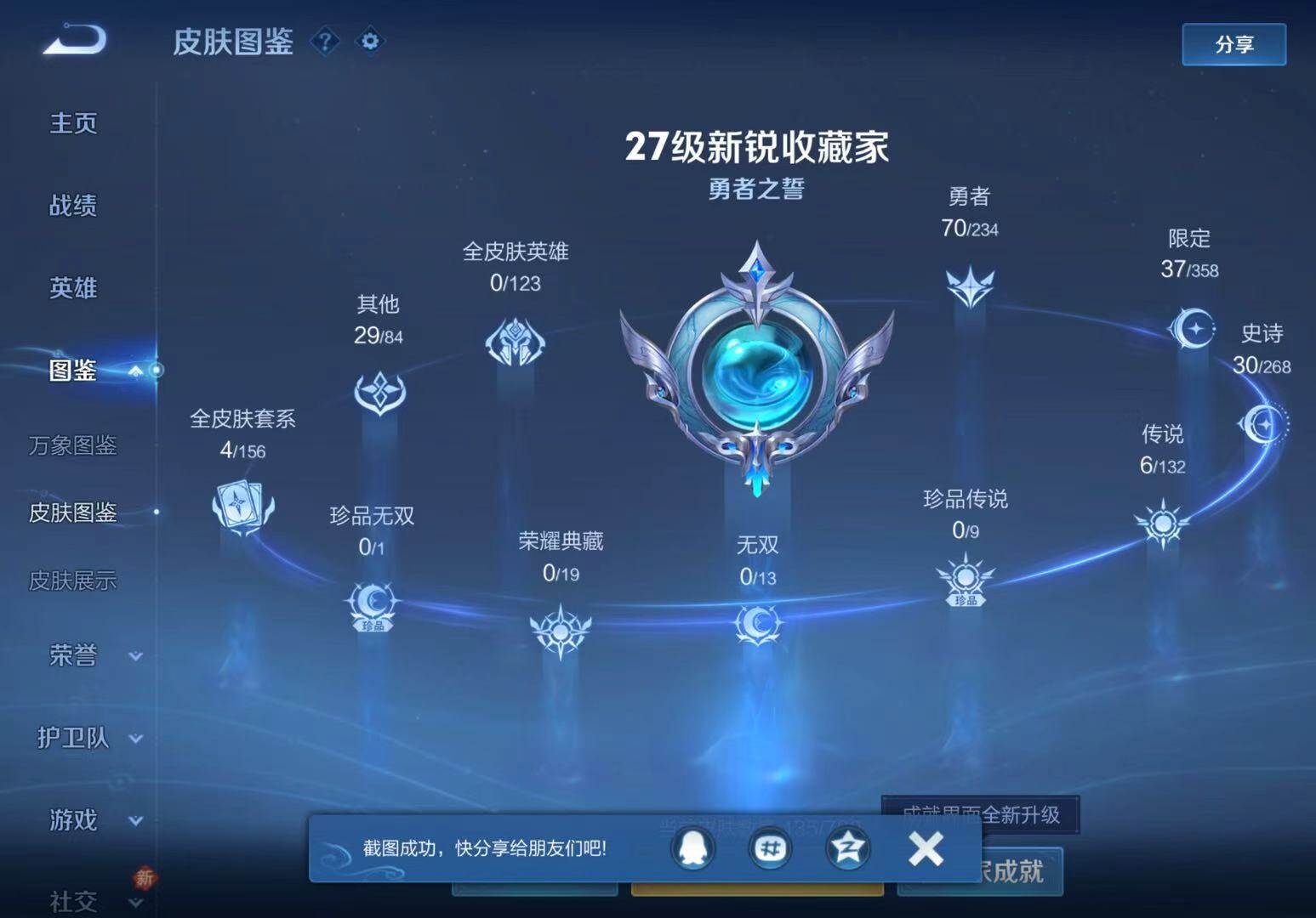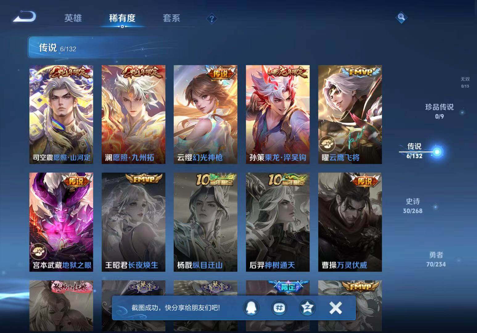 - [11296504]V9 3典藏 18传说 125英雄 332皮肤 典藏英雄武则天 可修改实名 荣耀水晶:鸣剑·曳影,全息碎影(猴子典藏),杀手不太冷 传说皮:黄金狮子座,黄金射手座,仲夏夜之梦(大飞蛾),海洋之心,地狱之眼,一念神魔,久胜战神,云鹰飞将(小将军),炽阳神光,超时空战士-狄仁杰 珍宝阁皮:妄想食味,优雅恋人,玩趣恶龙 限定皮:鸣野蒿,至尊宝,白虎志(电光耗子),凤求凰(白切鸡),太华(伽罗年限),梅西,白晶晶,时雨天司(水龙头),神威(电光马子),遇见飞天,高山流水,五谷丰年,冰锋战神,天狼运算者,游园惊梦,梁祝,御风骁将(吕布年限),祈雪灵祝(雪兔子),李小龙,逐梦之影,辉光之辰,霸王别姬-项羽,纯白花嫁,猪悟能,一生所爱,大圣娶亲,天魔缭乱,青春决赛季,冰霜恋舞曲 史诗皮:鸭鸭历险记-刘禅,龙之律动,百相守梦-黄忠,怒海争锋,百相守梦-周瑜,幻珠鲛人,遇见神鹿,紫霞仙子,苍穹之光,电玩小子(小书包),白龙吟,黄金分割率,特工魅影,千年之狐,永昼,末日机甲-莱西奥,蒙恬荣光圣徽,冰冠公主,偶像歌手,晚萤,魅语,暗夜猫娘,末日机甲-吕布,猫狗日记-孙策,猫狗日记-大乔,乱世虎臣,节奏热浪,修罗,女仆咖啡,摇滚巨星,水果甜心,绅士熊喵,天才门将,星夜王子,心灵骇客,功夫厨神,德古拉伯爵,暗隐猎兽者,幽灵船长,鬼剑武藏,心灵战警,天秀·启明,舞动绿茵,地狱岩魂,纤云弄巧,繁星吟游(呼啦呼啦),拒霜思,缤纷独角兽,乘风破浪,逐浪之夏,水晶猎龙者,曙光守护者,箭羽风息,金属风暴,原初追逐者,圣诞狂欢,圣诞恋歌,鹰眼统帅,暗夜贵公子,魅力维加斯,黎明之约,赏金猎手,奇遇舞章,无心,未来纪元-赵云