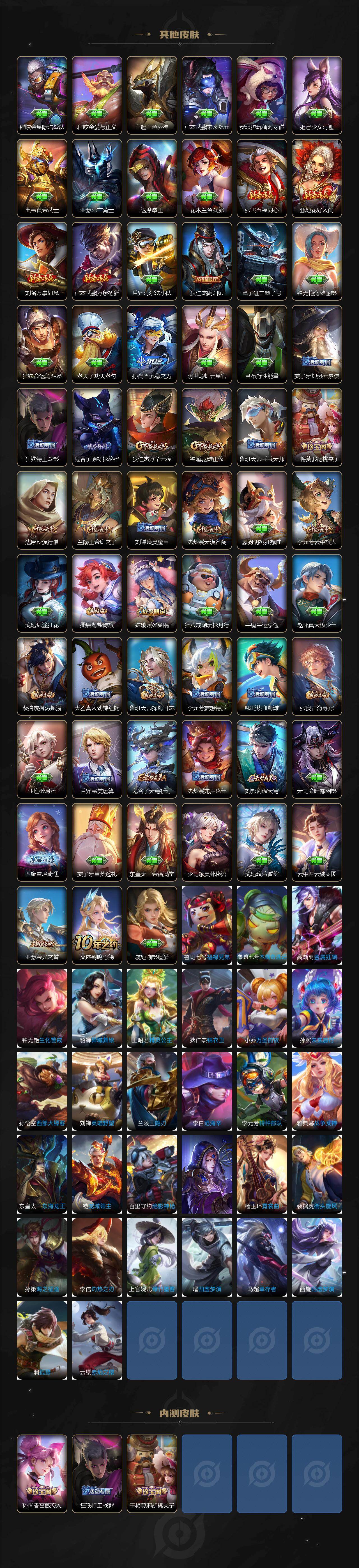 【其他皮肤】:项羽海滩派对,韩信教廷特使,韩信街头霸王,露娜哥特玫瑰,赵云白执事,芈月红桃皇后,程咬金星际陆战队,程咬金爱与正义,白起白色死神,宫本武藏未来纪元,安琪拉玩偶对对碰,妲己少女阿狸,典韦黄金武士,亚瑟死亡骑士,达摩拳王,花木兰兔女郎,张飞五福同心,甄姬花好人间,刘备万事如意,宫本武藏万象初新,后羿阿尔法小队,狄仁杰阴阳师,墨子进击墨子号,钟无艳海滩丽影,狂铁命运角斗场,老夫子功夫老勺,孙尚香沉稳之力,明世隐虹云星官,吕布野性能量,姜子牙炽热元素使,狂铁特工战影,鬼谷子原初探秘者,狄仁杰万华元夜,钟馗驱傩正仪,鲁班大师乓乓大师,干将莫邪胡桃夹子,达摩沙漠行僧,兰陵王金