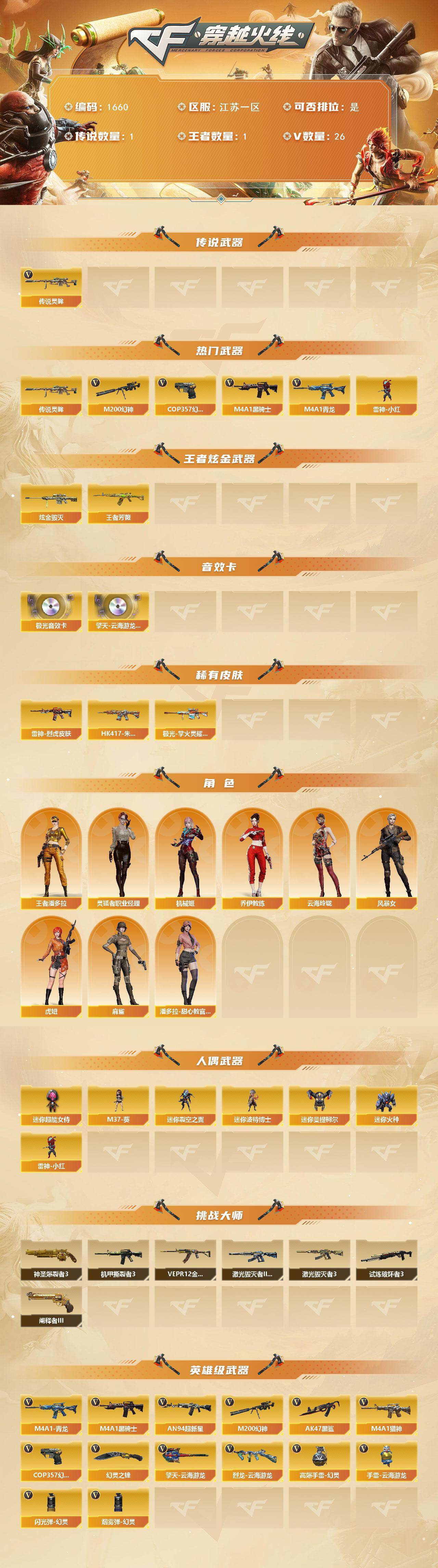 [15803864]江苏一区-26V-1王者-1炫金 【传说武器】:传说灵眸 【热门武器】:传说灵眸,M4A1-青龙,M200-幻神,M4A1-黑骑士,雷神-小红,COP 357-幻灵 【王者炫金武器】:王者芳薇,炫金毁灭 【音效卡】:擎天-云海游龙音效卡,Barrett-极光音效卡 【皮肤】:雷神-烈虎皮肤,HK417-朱雀-掌火灵橙 皮肤,极光-掌火灵耀 皮肤 【角色】:机械姬,王者潘多拉,乔伊教练,云海玲珑,风暴女,虎妞,灵狐者-职业经理,麻雀,潘多拉-甜心教官 【人偶武器】:雷神-小红,M37-葵,迷你裂空之翼*4,迷你波特博士*3,迷你曼提柯尔,迷你火种*3,迷你超能女侍 【挑战大师】:神圣爆裂者III*2,激光毁灭者III-白马银枪,VEPR-12-金魔,激光毁灭者III*3,机甲撕裂者III,试炼破坏者III,阐释者III 【英雄级武器】:M4A1-黑骑士,AN94-超新星,AK47-黑鲨,M4A1-青龙,M4A1-猎神,M200-幻神,烈龙-云海游龙,COP 357-幻灵,幻灵之锋*2,擎天-云海游龙,高爆手雷-幻灵*2,手雷-云海游龙,闪光弹-幻灵*3,烟雾弹-幻灵*3 【道具】:云海游龙炫彩背包,次元之矛-黄金背包,炫彩背包,黄金巨石泰坦-魔花研究所背包,黄金曼提柯尔的背包,绿色巨人,灵魂忍者,迷雾幽灵,夺命之镰,防化服*2,金色流光-枪王排位,云海游龙表情,防弹头盔*3,防弹衣*3,C4工具钳*3,手雷包*3 【特殊枪械】:1黑骑士