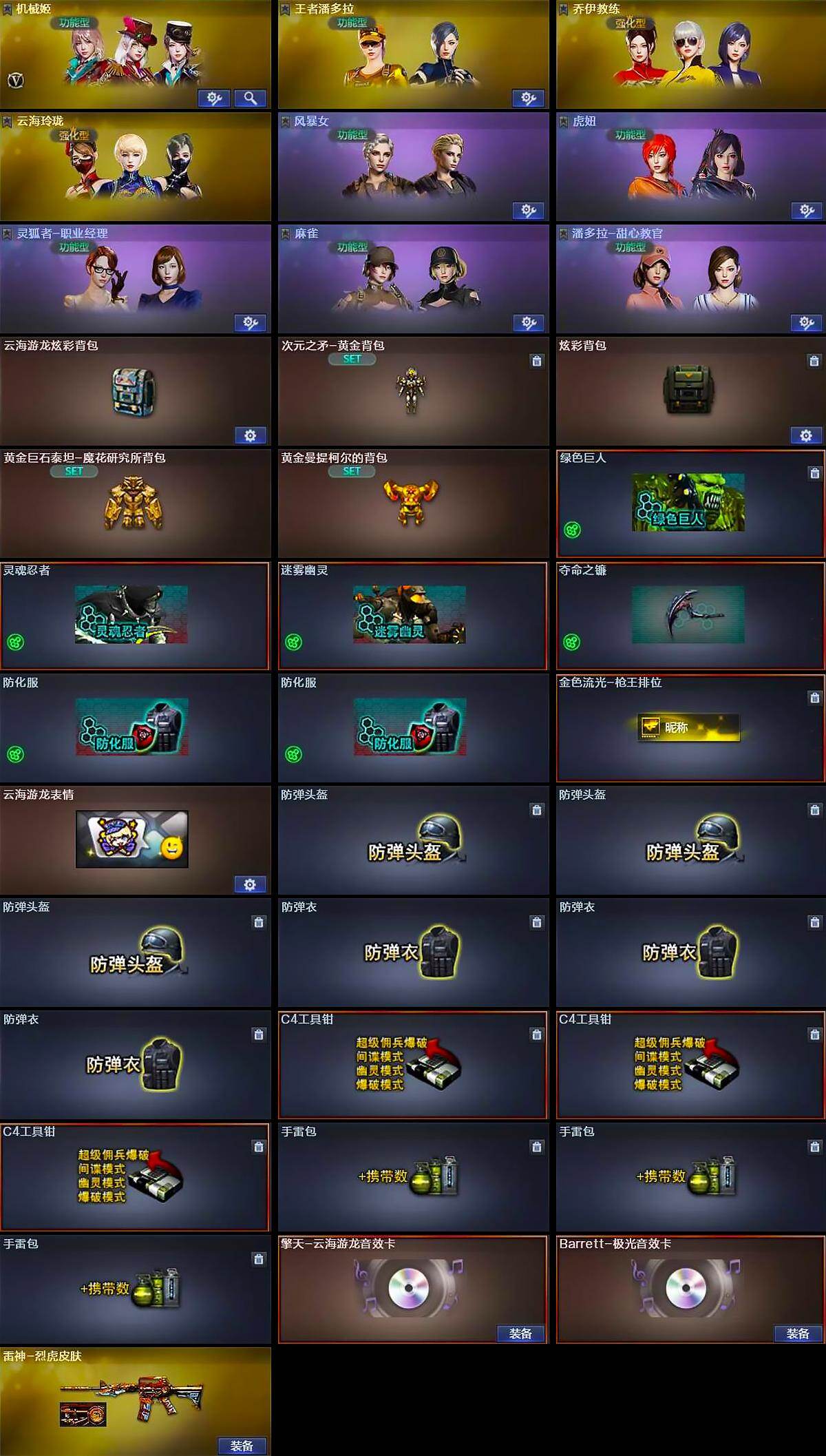 【道具】:云海游龙炫彩背包,次元之矛-黄金背包,炫彩背包,黄金巨石泰坦-魔花研究所背包,黄金曼提柯尔的背包,绿色巨人,灵魂忍者,迷雾幽灵,夺命之镰,防化服*2,金色流光-枪王排位,云海游龙表情,防弹头盔*3,防弹衣*3,C4工具钳*3,手雷包*3