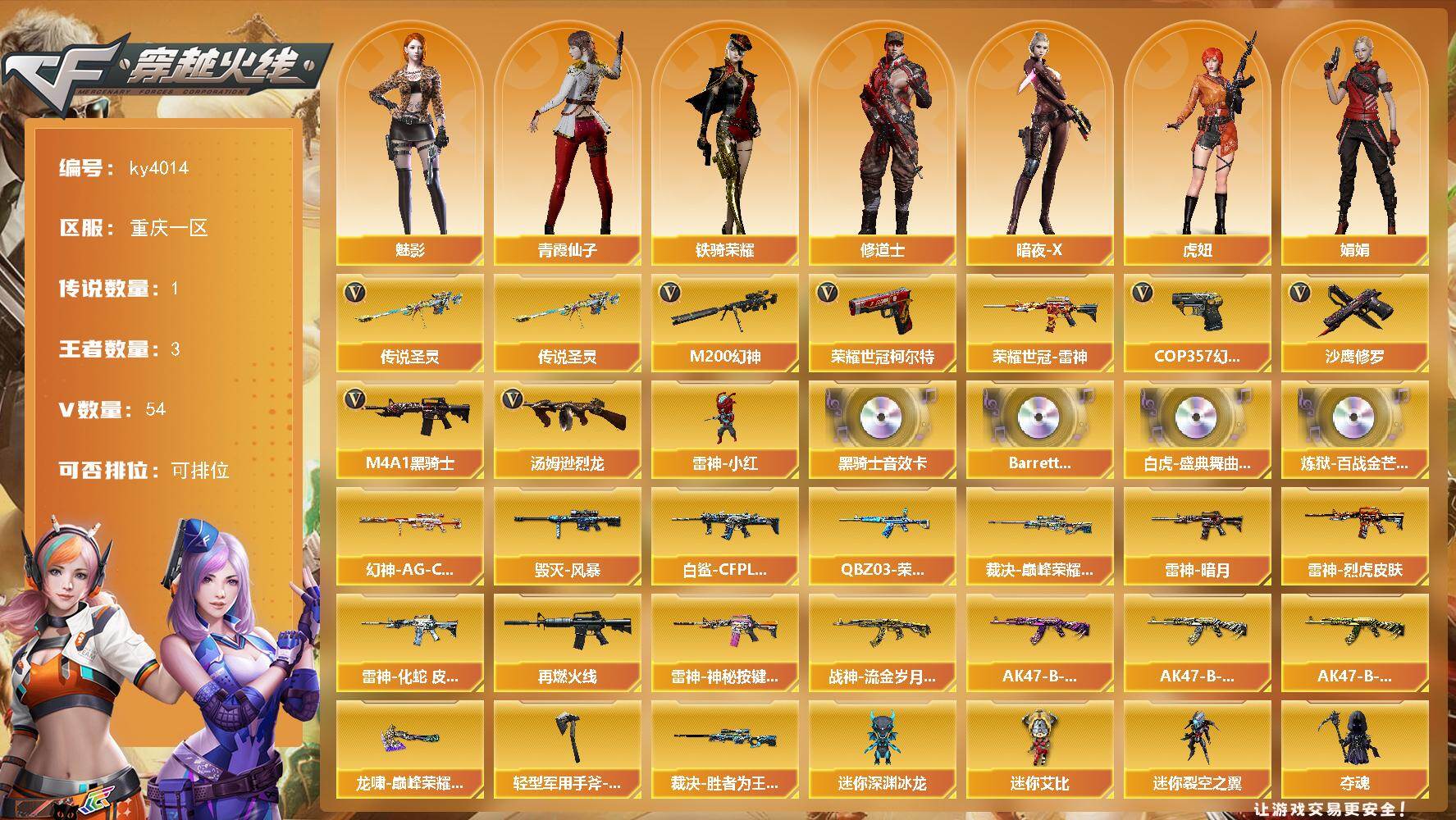 [16018584]重庆一区-54V-3王者-0炫金 【传说武器】:传说圣灵 【热门武器】:传说圣灵,M200-幻神,荣耀世冠-雷神,荣耀世冠-柯尔特,M4A1-黑骑士,汤姆逊-烈龙*3,雷神-小红,COP 357-幻灵,沙鹰-修罗*4 【音效卡】:M4A1-黑骑士音效卡,Barrett-碧霄极光音效卡*2,白虎-盛典舞曲音效卡,炼狱-百战金芒-庆典舞曲音效卡 【皮肤】:幻神-AG-CFPL S24冠军 皮肤,白虎-白鲨-CFPLS23冠军,QBZ03-荣耀世冠EP 皮肤,裁决-巅峰荣耀 皮肤,裁决-胜者为王 皮肤,雷神-暗月,雷神-烈虎皮肤,雷神-化蛇 皮肤,M4A1-再燃火线,雷神-神秘按键 皮肤,毁灭-风暴,战神-流金岁月皮肤,AK47-B-常胜将军-曹操,AK47-B-常胜将军-刘备*2,AK47-B-常胜将军-孙权,龙啸-巅峰荣耀 皮肤,轻型军用手斧-再燃火线 【角色】:魅影,妮妮,修道士,暗夜-X,虎妞,娟娟,灵狐者-X,龙儿-小淘气,麻雀,娜塔莉娅,潘多拉-X,潘多拉-甜心教官,青霞仙子,蛇姬,斯沃特-X,铁骑荣耀 【人偶武器】:雷神-小红,迷你深渊冰龙,迷你裂空之翼*2,夺魂,生化手雷-机甲核心,深渊终结者手雷,闪光弹-貂蝉,高爆手雷-大乔,迷你艾比 【挑战大师】:神圣爆裂者III,冰龙粉碎者-白马银枪,VEPR-12-金魔,激光毁灭者III,机甲撕裂者III,试炼破坏者III,阐释者III 【英雄级武器】:AK47-火麒麟,M4A1-雷神,M4A1-黑骑士,AK47-B-常胜将军,荣耀世冠-雷神,Barrett-毁灭,AWM-裁决,M200-幻神,炼狱-百战金芒,汤姆逊-烈龙*3,沙鹰-修罗*4,沙鹰-天神*3,COP 357-幻灵,荣耀世冠-柯尔特,屠龙*3,幻灵之锋,麒麟刺-百战金芒,王者之啸-觉醒版,王者之击-觉醒版*2,高爆手雷-幻灵*4,闪光弹-幻灵*4,烟雾弹-幻灵*5,烟雾弹-荣耀世冠EP*3,M4A1-赤狱骑士,M4A1-苍鸣雷神 【道具】:BS战队炫彩背包,EP战队炫彩背包,云山科技背包,亚洲杯纪念炫彩背包,炫彩背包,百战金芒炫彩背包,背包-洛丽塔,虎牙炫彩背包,超级背包,女皇终结者-魔龙之吻,救世主-黑桃战神,黄金生化钩,绿色巨人,灵魂忍者,迷雾幽灵,夺命之镰,防化服*3,流光-鎏金之域,枪王排位29赛季金色流光,语音特效-盛典烟火,萌萌小葵表情