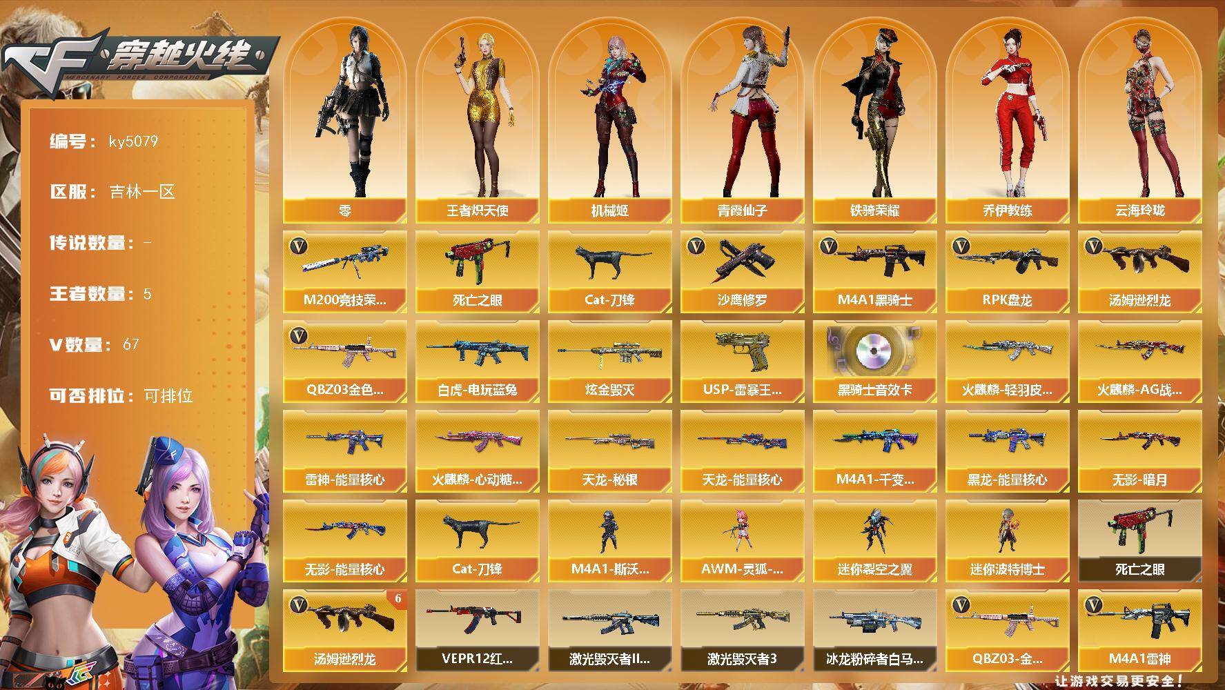 [15892174]吉林一区-67V-5王者-1炫金 【热门武器】:QBZ03-金色蔷薇,M200-竞技荣光,死亡之眼*3,白虎-电玩蓝兔,Cat-刀锋,M4A1-黑骑士,汤姆逊-烈龙*6,RPK-盘龙,沙鹰-修罗 【王者炫金武器】:USP-雷暴王者,炫金毁灭 【音效卡】:M4A1-黑骑士音效卡 【皮肤】:雷神-能量核心,火麒麟-AG战队皮肤,火麒麟-轻羽皮肤,火麒麟-心动糖果,M4A1-千变-孔明皮肤,黑龙-能量核心,无影-暗月,无影-能量核心,天龙-秘银*2,天龙-能量核心 【角色】:零,机械姬,王者炽天使,奇洋探员,乔伊教练,云海玲珑,暗夜-X,电竞少女,芳心审判者,虎妞,嘉年华灵狐,娟娟,灵狐者-X,灵狐者-黄金海岸,灵狐者-七夕宝贝,龙儿-小淘气,麻雀,曼陀罗-X,潘多拉-X,潘多拉-甜心教官,青霞仙子,斯沃特-X,铁骑荣耀,影武者-X 【人偶武器】:AWM-灵狐-15周年嘉年华,Cat-刀锋,迷你裂空之翼*5,迷你波特博士,M4A1-斯沃特 【暴走生化】:死亡之眼*3 【挑战大师】:冰龙粉碎者-白马银枪*2,激光毁灭者III-白马银枪,激光毁灭者III,VEPR-12-红魔 【英雄级武器】:AK47-火麒麟,M4A1-雷神,M4A1-黑骑士,AK47-无影,M4A1-死神,AK12-天启,AN94-超新星,无影-神兵利器,黑武士-锦绣游龙,QBZ03-金色蔷薇,烈火-动感闪耀,王者之魄-觉醒版,白虎-电玩蓝兔,加利尔ACE-天袭,AWM-天龙,Barrett-毁灭,AWM-裁决,M200-竞技荣光,VSK-94-金蚀,RPK-盘龙,汤姆逊-烈龙*6,沙鹰-修罗,沙鹰-天神*4,天神-动感闪耀,屠龙,龙啸,马来剑-夜魔,擎天,麒麟刺,幻灵之锋,擎天-竞技荣光,屠龙-动感闪耀,屠龙-云海游龙,高爆手雷-夜魔,高爆手雷-竞技荣光*5,手雷-动感闪耀,闪光弹-夜魔,闪光弹-竞技荣光*6,烟雾弹-夜魔,烟雾弹-竞技荣光*5,M4A1-赤狱骑士 【道具】:CFS限定背包,云山科技背包,云海游龙炫彩背包,全能枪王背包,战舰背包,炫彩背包-诺拉,炫彩背包,虎牙炫彩背包,超级背包,哔哩哔哩名片,女皇终结者-魔龙之吻,救世主-黑桃战神,绿色巨人,灵魂忍者,迷雾幽灵,生化弹匣,夺命之镰,防化服*3,金色流光-枪王排位*2,星辰流光-枪王排位,枪王排位28赛季金色流光,枪王排位29赛季金色流光,