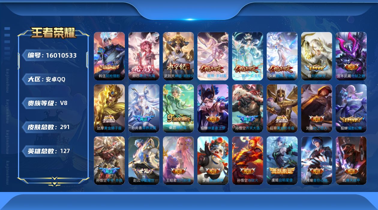 [16010533]安卓Q-V8-最强王者段位-127英雄-291皮肤-1典藏皮肤-1典藏英雄-2无双-21传说-58史诗