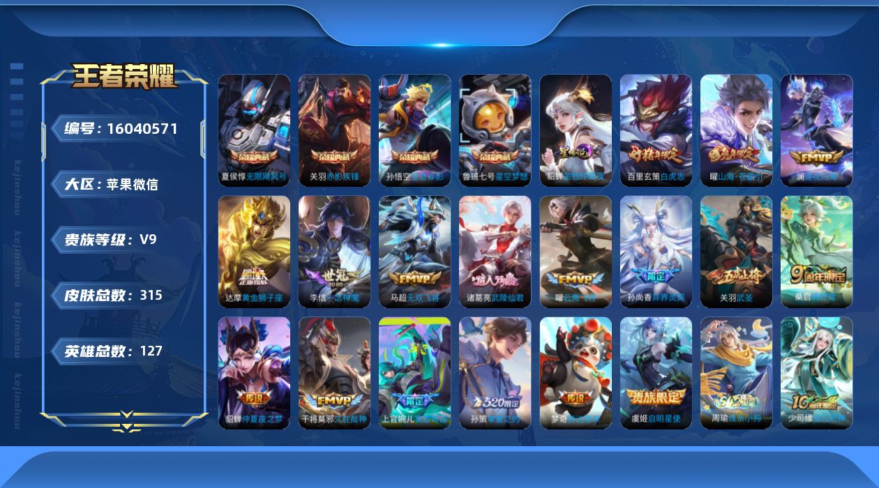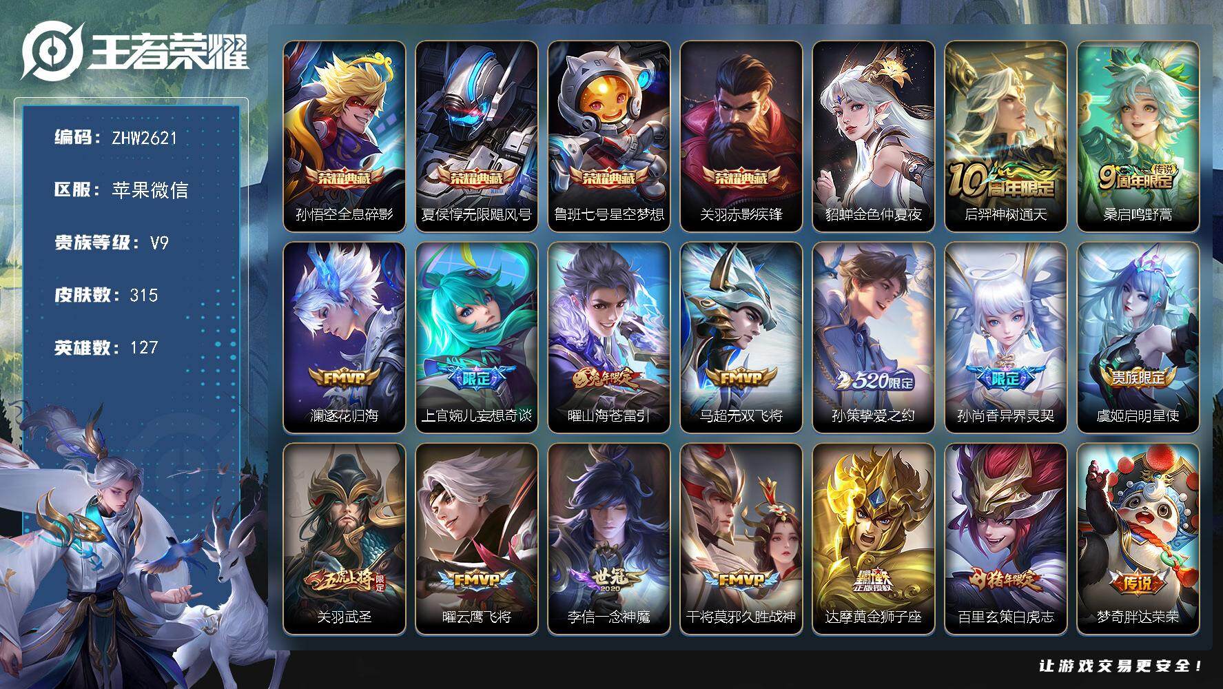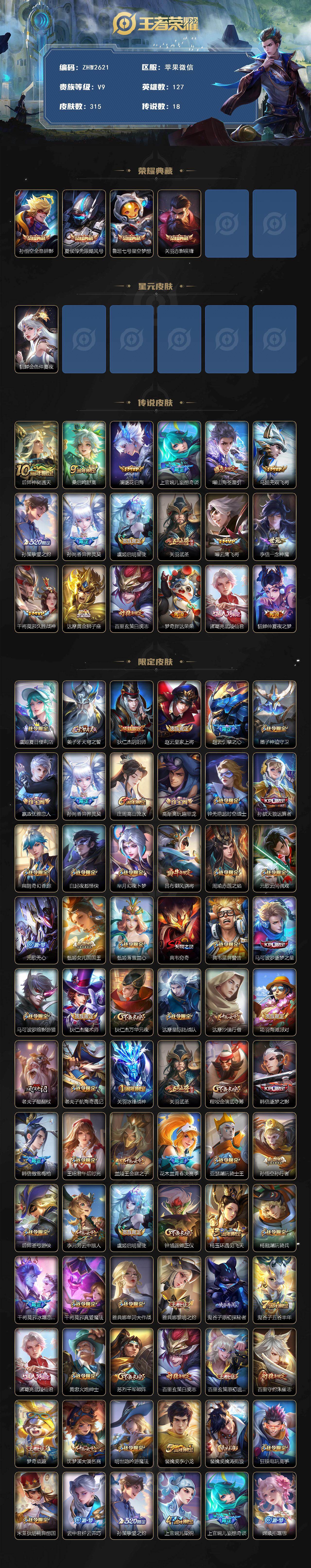 [16040571]苹果WX-V9-最强王者段位-127英雄-315皮肤-4典藏皮肤-18传说-99史诗-1星传