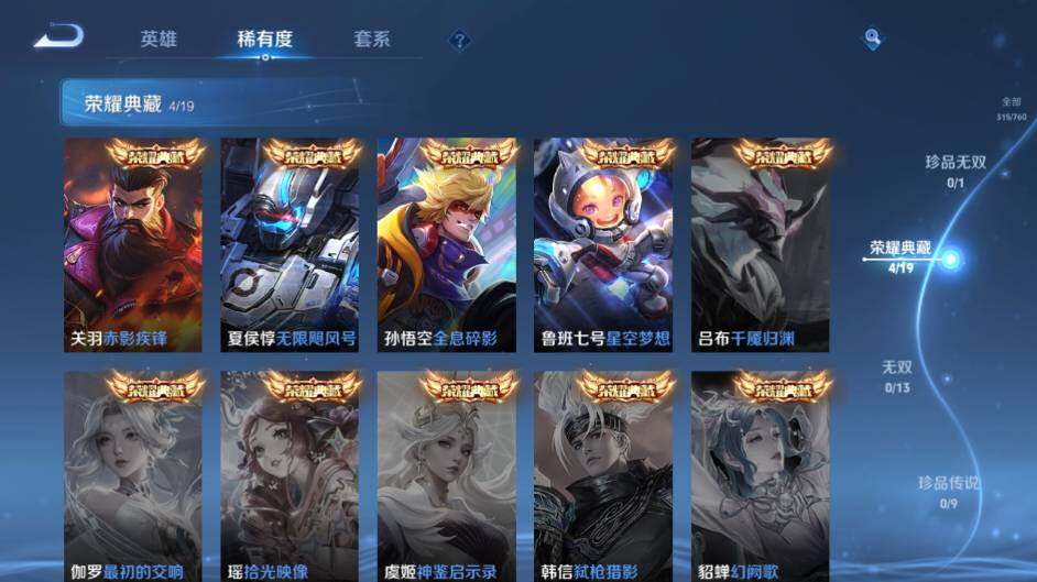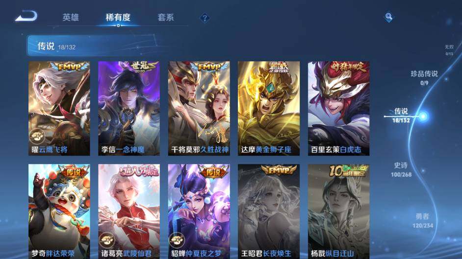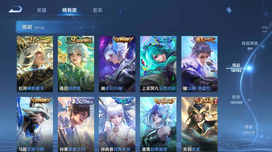 【传说皮肤】:后羿神树通天,桑启鸣野蒿,澜逐花归海,上官婉儿妄想奇谈,曜山海苍雷引,马超无双飞将,孙策挚爱之约,孙尚香异界灵契,虞姬启明星使,关羽武圣,曜云鹰飞将,李信一念神魔,干将莫邪久胜战神,达摩黄金狮子座,百里玄策白虎志,梦奇胖达荣荣,诸葛亮武陵仙君,貂蝉仲夏夜之梦