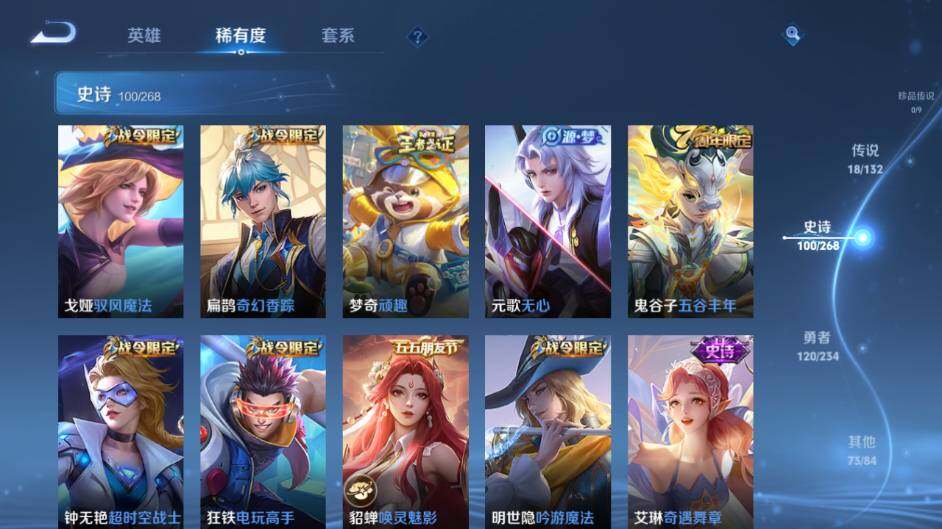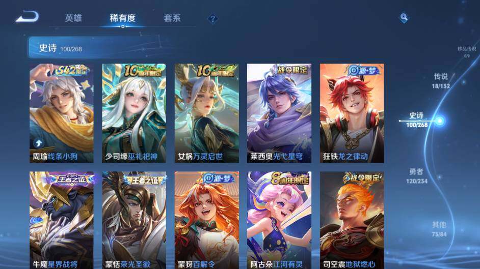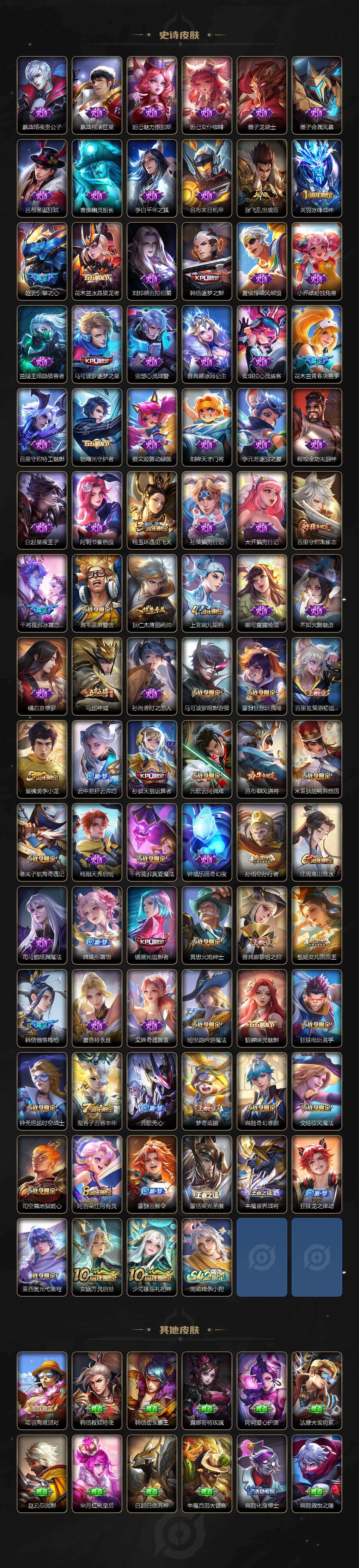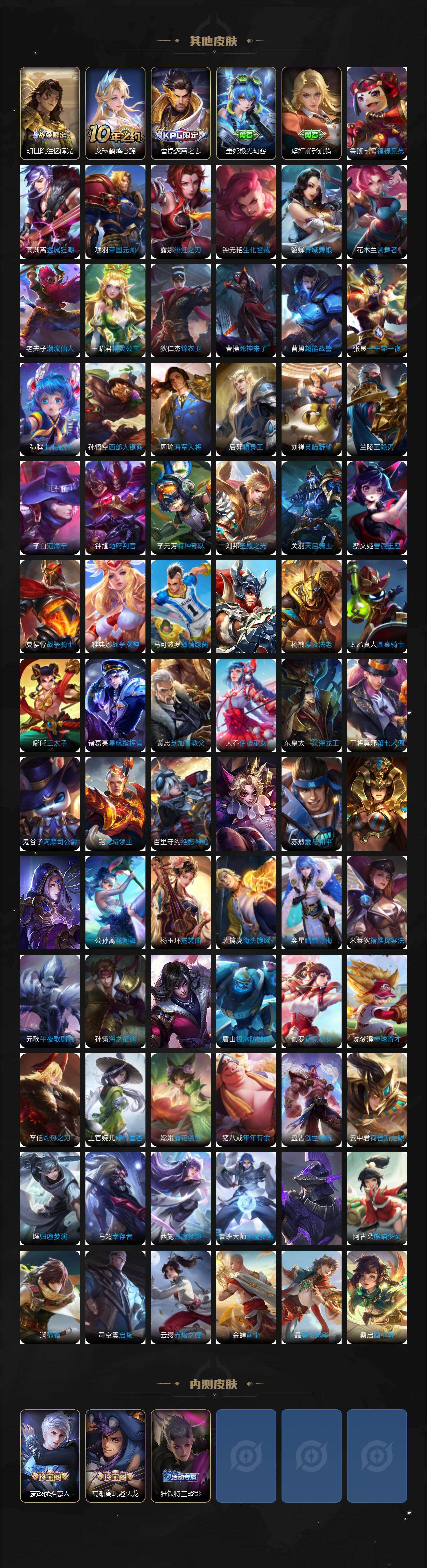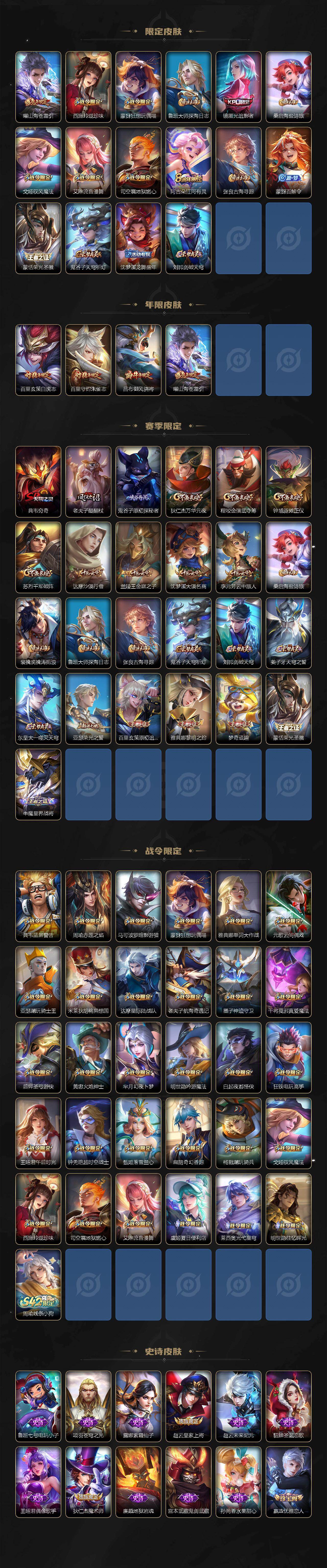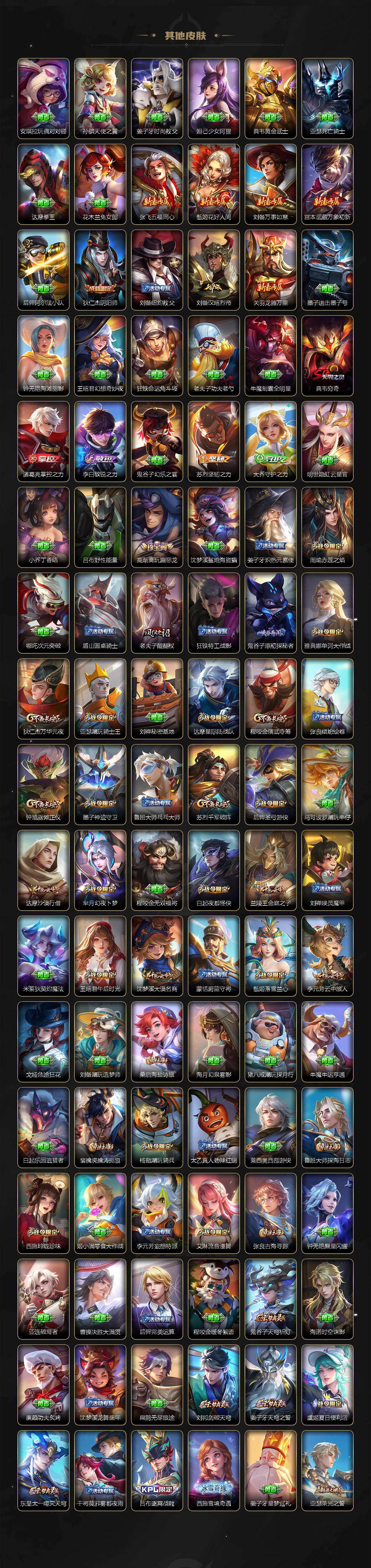 【限定皮肤】:虞姬夏日便利店,姜子牙天穹之誓,狄仁杰阴阳师,赵云皇家上将,赵云引擎之心,墨子神迹守卫,嬴政优雅恋人,孙尚香异界灵契,庄周高山流水,高渐离玩趣恶龙,钟无艳超时空战士,孙膑天狼运算者,扁鹊奇幻香踪,白起夜都怪侠,芈月幻夜卜梦,吕布御风骁将,周瑜赤莲之焰,元歌云间偶戏,元歌无心,甄姬女儿国国王,甄姬落雪兰心,典韦穷奇,典韦蓝屏警告,马可波罗逐梦之星,马可波罗暗影游猎,狄仁杰魔术师,狄仁杰万华元夜,达摩星际陆战队,达摩沙漠行僧,项羽海滩派对,老夫子醍醐杖,老夫子航海奇遇记,关羽冰锋战神,关羽武圣,程咬金演武夺筹,韩信逐梦之影,韩信傲雪梅枪,王昭君午后时光,兰陵王金庭之子,花木兰青春决赛季,亚瑟潮玩骑士王,孙悟空孙行者,后羿圣弓游侠,李元芳云中旅人,虞姬启明星使,钟馗驱傩正仪,杨玉环遇见飞天,杨戬潮玩骑兵,干将莫邪冰霜恋舞曲,干将莫邪真爱魔法,雅典娜单词大作战,雅典娜黎明之约,鬼谷子原初探秘者,鬼谷子五谷丰年,诸葛亮武陵仙君,黄忠火炮绅士,苏烈千军破阵,百里玄策白虎志,百里玄策原初追逐者,百里守约朱雀志,梦奇顽趣,沈梦溪大漠名商,明世隐吟游魔法,裴擒虎李小龙,裴擒虎擒涛扼浪,狂铁电玩高手,米莱狄胡桃异想国,云中君纤云弄巧,孙策挚爱之约,上官婉儿梁祝,上官婉儿妄想奇谈,嫦娥拒霜思,曜山海苍雷引,西施玲珑珍味,蒙犽狂想玩偶喵,鲁班大师探海日志,镜匿光追影者,桑启海盐诗旅,戈娅驭风魔法,艾琳流音漫舞,司空震地狱燃心,阿古朵江河有灵,张良古海寻踪,蒙犽百解令,蒙恬荣光圣徽,鬼谷子天穹祈灯,沈梦溪龙舞盛年,刘邦剑破天穹