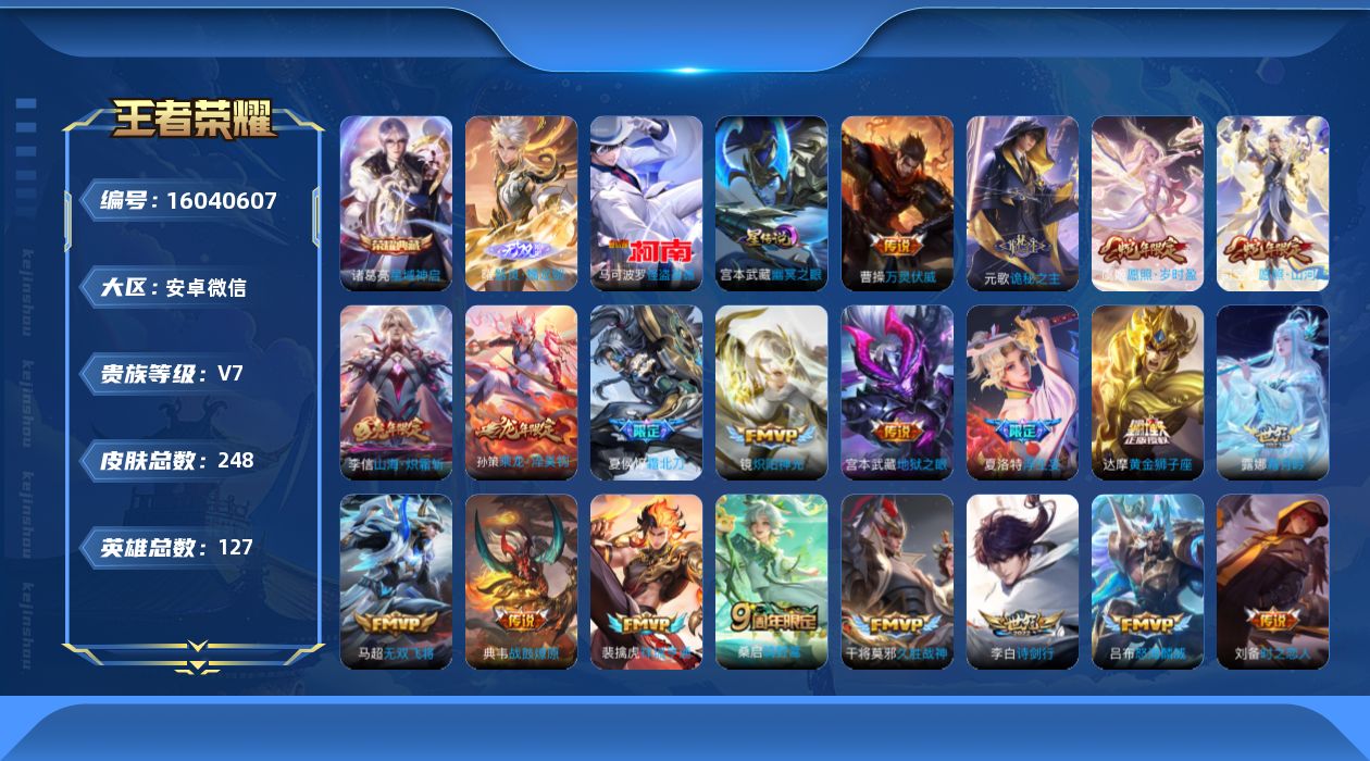 [16040607]微信社交限制,介意勿拍!安卓WX-V7-最强王者段位-127英雄-248皮肤-1典藏皮肤-1无双-1珍品传说-22传说-80史诗-2星传 【英雄全皮】:元歌全皮,孙权全皮,夏洛特全皮,司空震全皮,空空儿全皮,影全皮,少司缘全皮 【荣耀典藏】:诸葛亮星域神启 【无双皮肤】:曜器灵螭龙剑 【珍品传说】:马可波罗怪盗基德 【传说皮肤】:后羿神树通天,曹操万灵伏威,元歌诡秘之主,司空震愿照山河定,虞姬愿照岁时盈,裴擒虎祥瑞亨通,桑启鸣野蒿,夏侯惇霜北刀,典韦战鼓燎原,孙策乘龙淬吴钩,露娜霜月吟,夏洛特浮生妄,李信山海炽霜斩,吕布怒海麟威,李白诗剑行,马超无双飞将,镜炽阳神光,刘备时之恋人,张良黄金白羊座,干将莫邪久胜战神,达摩黄金狮子座,宫本武藏地狱之眼 【限定皮肤】:夏侯惇霜北刀,暃埋骨钱,蒙犽顽岩魄,蔡文姬夏日便利店,大乔绒语心约,虞姬夏日便利店,姜子牙天穹之誓,狄仁杰阴阳师,赵云皇家上将,嬴政白昼王子,阿轲迷踪丽影,元歌云间偶戏,元歌无心,马可波罗暗影游猎,马可波罗山海玄木吟,狄仁杰魔术师,狄仁杰万华元夜,项羽海滩派对,程咬金演武夺筹,后羿圣弓游侠,李元芳云中旅人,干将莫邪胡桃夹子,鬼谷子五谷丰年,公孙离玉兔公主,裴擒虎擒涛扼浪,云中君纤云弄巧,李信山海炽霜斩,上官婉儿梁祝,嫦娥拒霜思,西施玲珑珍味,鲁班大师探海日志,桑启海盐诗旅,夏洛特浮生妄,戈娅驭风魔法,艾琳流音漫舞,司空震地狱燃心,阿古朵江河有灵,张良古海寻踪,蒙犽百解令,蒙恬荣光圣徽,高渐离燃音魔法,妲己灵卜魔法,鬼谷子天穹祈灯,姬小满妄想食味,孙策乘龙淬吴钩,百里玄策超元猎域,沈梦溪龙舞盛年,鲁班七号蔬乡物语,李元芳蔬乡物语,刘邦剑破天穹,程咬金群星魔术团,项羽苍威无极,刘备异域游侠,周瑜熔金海岸 【年限皮肤】:李信山海炽霜斩,马可波罗山海玄木吟,孙策乘龙淬吴钩,司空震愿照山河定,虞姬愿照岁时盈 【赛季限定】:狄仁杰万华元夜,程咬金演武夺筹,李元芳云中旅人,桑启海盐诗旅,裴擒虎擒涛扼浪,鲁班大师探海日志,张良古海寻踪,鬼谷子天穹祈灯,刘邦剑破天穹,姜子牙天穹之誓,东皇太一噬灭天穹,太乙真人谧流熔炉,钟馗虚灵犬护,甄姬逆浪荇歌,亚瑟荣光之誓,蒙恬荣光圣徽,牛魔星界战将 【战令限定】:嬴政白昼王子,阿轲迷踪丽影,马可波罗暗影游猎,元歌云间偶戏,后羿圣弓游侠,戈娅驭风魔法,西施玲珑珍味,司空震地狱燃心,艾琳流音