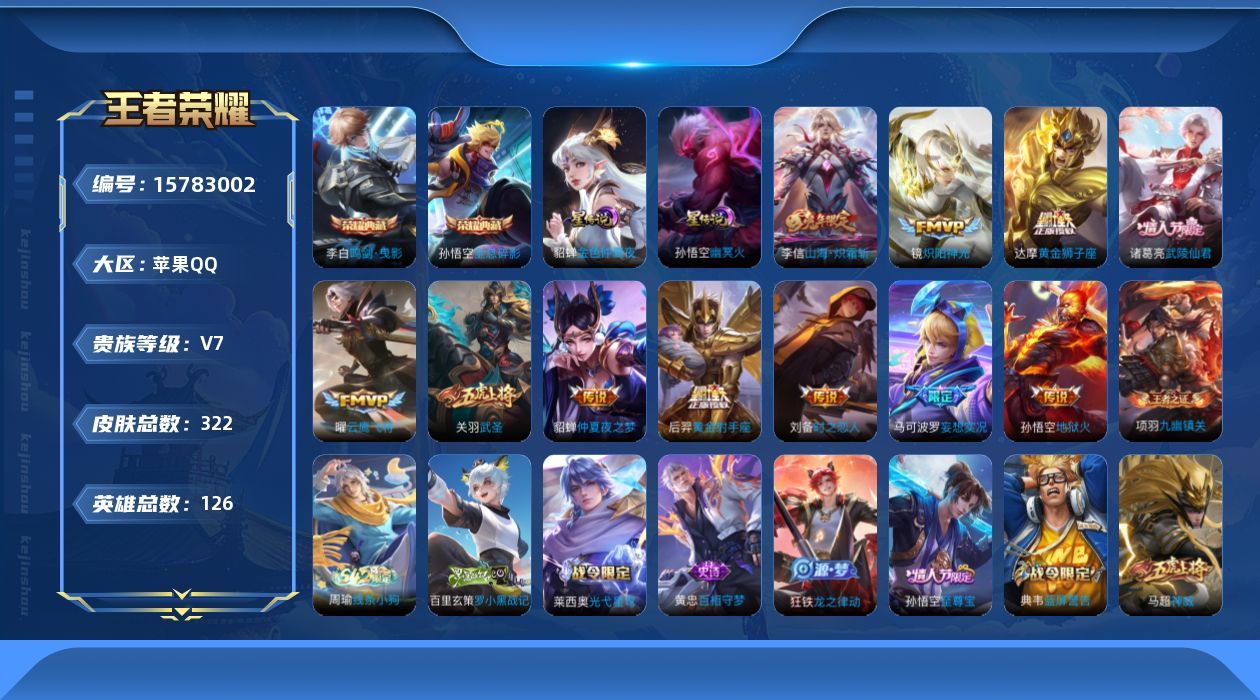 - [11471309]V8 1无双 2珍品传说 21传说 121英雄 188皮肤 可修改实名 优质装备:离恨烟(公孙离无双),怪盗基德,黄金狮子座,炽阳神光,一念神魔,末日机甲-孙尚香(绿蚂蚱),零号·赤焰,时之恋人-刘备(电焊工),炽翼辉光(娃娃菜牛角包),妄想实况,鹤归松栖(云缨),遇见神鼓,澜逐花归海,琥珀纪元铠,琥珀纪元马超 珍品传说:兔狲·蓬尾 传说皮:乘龙·问璇玑(孙尚香年限),乘龙·铭钟鼎(赵云年限),乘龙·淬吴钩(孙策年限),典韦战鼓燎原 珍宝阁皮:妄想食味 限定皮:愿照·山河定(司空震年限),逐霄战戟,陌上桑,鸣野蒿,武圣 史诗皮:器灵·浮梦炉,糖绘人间,谪仙醉月,龙之律动,藏狐·褐绒,怒海争锋,撼地雄心,破空之剑,战舞者,涂山红红,东方月初,蒙犽顽岩魄,埋骨钱,海诺心动手记,蔬乡物语(鲁班七号),乘龙·聚宝船(安琪拉年限),乘龙·忆丹青(大乔年限),百相守梦-百里守约,紫霞仙子,黄金分割率,特工魅影,千年之狐,末日机甲-莱西奥,鹤归松栖(赵怀真),真我赫兹(百里守约),百解令(蒙犽),高渐离燃音魔法,青蛇,偶像歌手,猫狗日记-大乔,乱世虎臣,节奏热浪,摇滚巨星,水果甜心,绅士熊喵,功夫厨神,幽灵船长,鬼剑武藏,心灵战警,天秀·启明,地狱岩魂,纤云弄巧,拒霜思,乘风破浪,逐浪之夏,水晶猎龙者,金属风暴,圣诞恋歌,鹰眼统帅,魅力维加斯